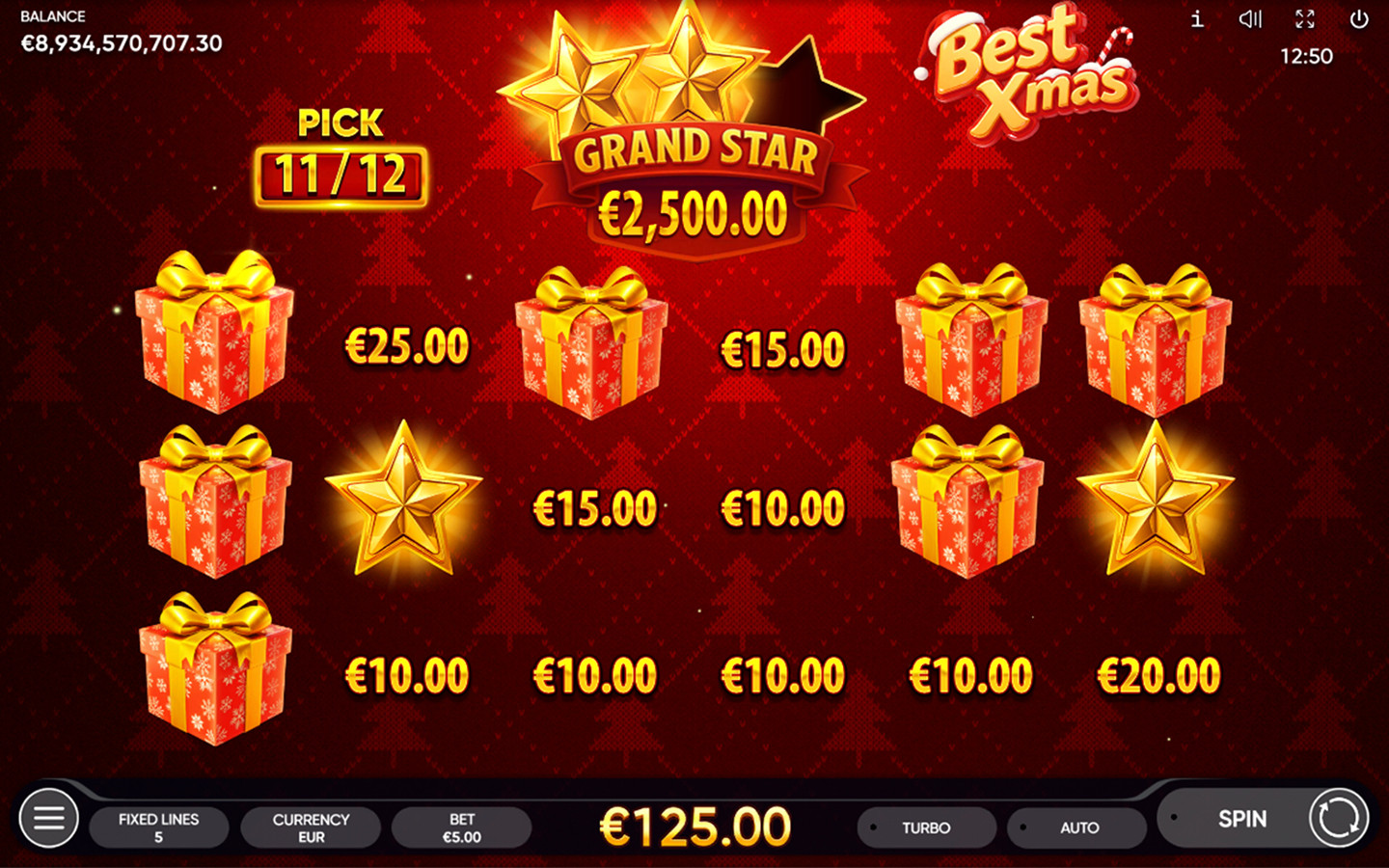 Best Xmas features crown Wilds and three unique Bonus Games triggered by colored gift bags. It offers the Xmas Bonus Pick Me with a Grand Star Jackpot, the Best Bonus Hold and Win featuring Gold Coins and multiple jackpots, and the HoHoHo Bonus Jackpot Collecting game where gathering specific candies awards prizes.