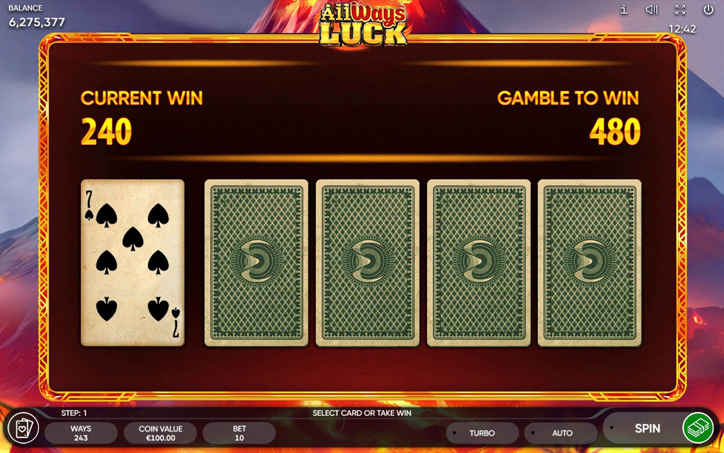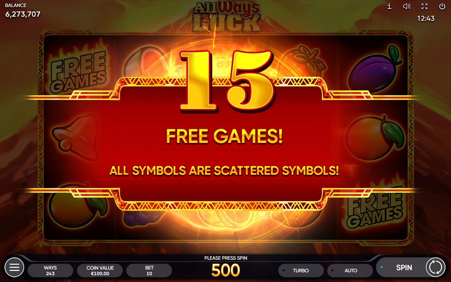 El juego cuenta con 5 carretes, 3 filas y 243 modos de pago fijos. All Ways Luck te llevará a una tierra peligrosa y desierta donde tendrás que ponerte a prueba y recuperar el tesoro custodiado por el todopoderoso volcán. ¿Te atreverás a interponerte en su camino? Solo se paga el recorrido más largo entre símbolos del mismo tipo. Todos los símbolos del mismo tipo por carrete crean un recorrido separado. La aparición de 3 o más símbolos Scatter activa Juegos Gratis. La aparición de 3, 4 o 5 símbolos Scatter activa 7, 10 o 15 Juegos Gratis, respectivamente. Durante los Juegos Gratis, todos los símbolos son símbolos dispersos.
