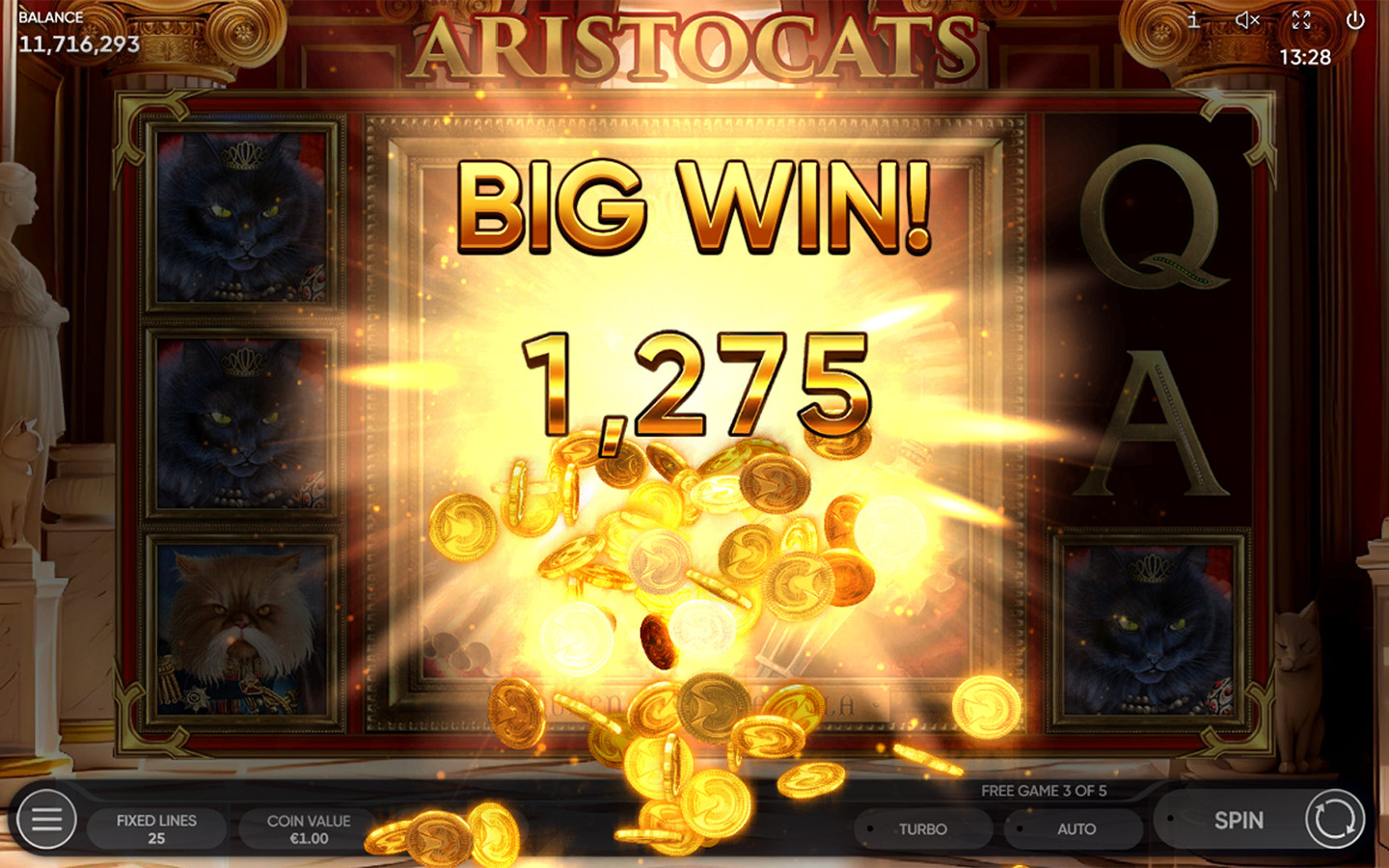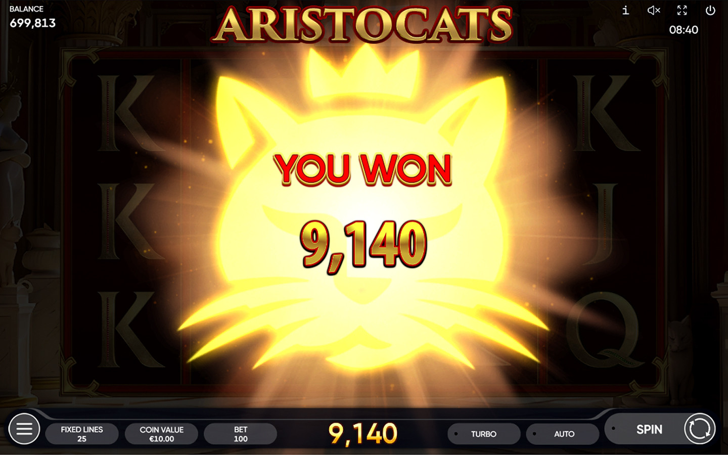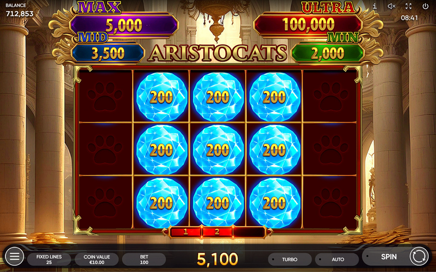 Entra en un mundo donde la elegancia y la nobleza felinas son las protagonistas. La tragamonedas Aristocats de 5 carretes y 3 filas con 25 líneas de pago fijas transporta a los jugadores a un majestuoso castillo, donde los gatos ostentan prestigiosos títulos reales como princesas y duques. El viaje se vuelve más emocionante con cada giro, a medida que los jugadores recolectan joyas, diamantes y coronas reales para construir su reino perfecto.