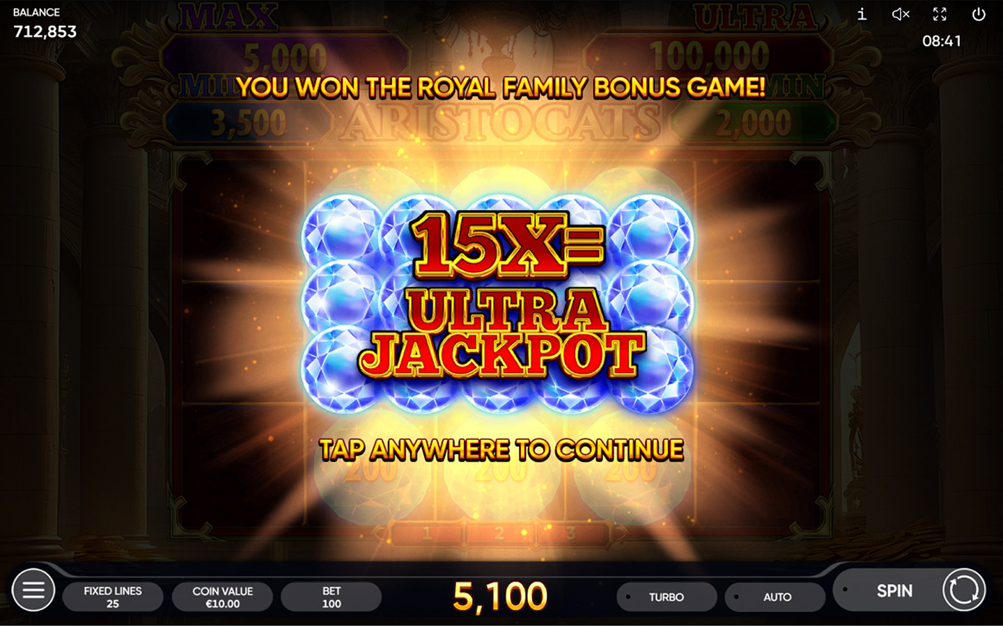 La Ronda de Bonificación "Familia Real" se activa con 6 o más símbolos Bonus dispersos en los carretes. Durante la Ronda de Bonificación, los carretes se convierten en una cuadrícula de 5x3 posiciones, con un carrete que contendrá símbolos Bonus de diamantes y rubíes y símbolos de Aristópatas en cada uno de ellos. Los símbolos Bonus permanecen en su lugar, mientras que los símbolos de Aristópata hacen que los carretes sigan girando. Cada símbolo Bonus de diamante genera multiplicadores de hasta x18. Cada símbolo Bonus de rubí puede proporcionar el premio mayor y multiplicar la apuesta total hasta 50 veces. La Ronda de Bonificación comienza con 3 intentos: cada giro utiliza 1 intento y la aparición de un símbolo Bonus en los carretes hará que el número de intentos regrese a su valor inicial. La Ronda de Bonificación continuará hasta que te quedes sin intentos o todos los carretes queden cubiertos por símbolos Bonus. Cuando recolecta los 15 símbolos Bonus durante la Ronda de Bonificación, el jugador gana un premio adicional: un Ultra Jackpot, que multiplica 1000 veces la apuesta total.