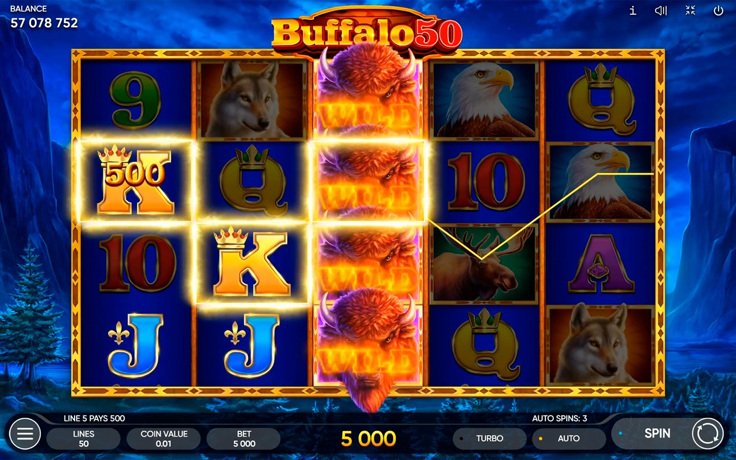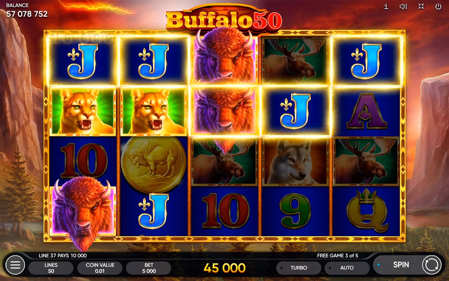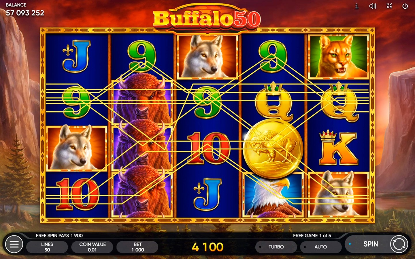 Buffalo 50 es una tragamonedas de 5 carretes y 4 filas con 50 líneas de pago que tiene Wilds apilados y una bonificación de Giros Gratis. El búfalo norteamericano simboliza coraje y estabilidad: una combinación perfecta. Es por eso que el búfalo es un símbolo Wild que sustituye a todos los símbolos, excepto al Scatter. La moneda de oro también es un símbolo Scatter. La aparición de 3 Scatters te otorga 5 Giros Gratis con Wilds apilados. Los Giros Gratis se pueden reactivar, ¡así que debes asegurarte de prestar atención!