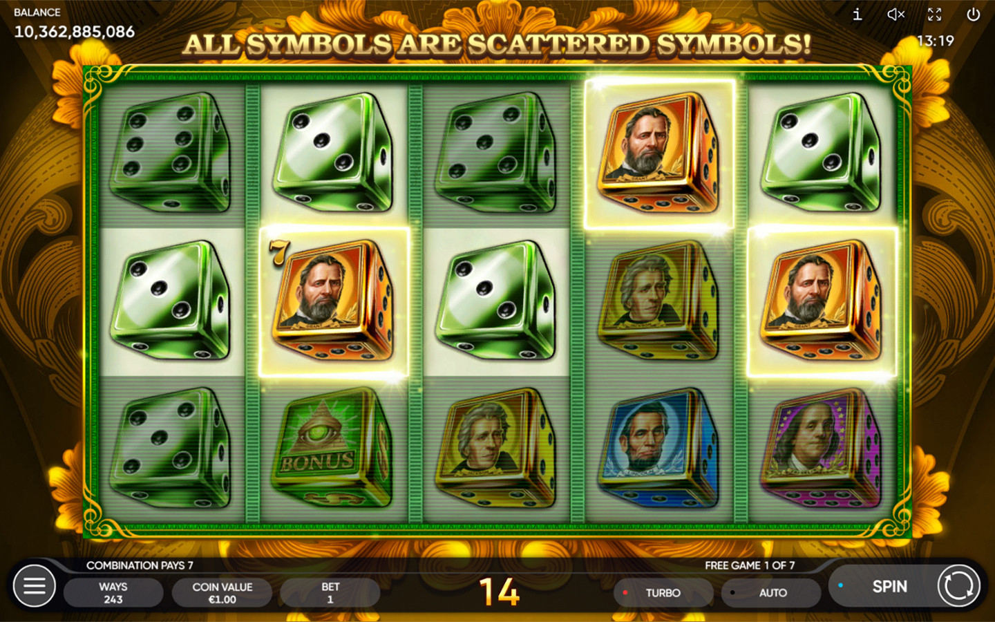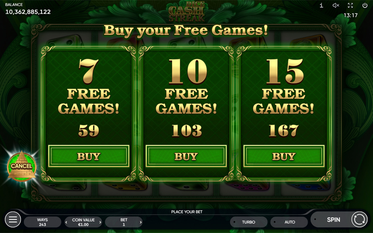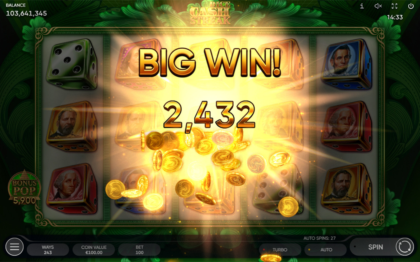 ¡Mira cómo nuestros dados visualmente atractivos caen en los carretes y prepárate para esa racha ganadora que te cambiará la vida! Para hacer las cosas aún más interesantes, Cash Streak Dice cuenta con Juegos Gratis que se activan con 3 símbolos Scatter o más y multiplicadores x2 que pueden aparecer durante el juego principal y los Juegos Gratis.