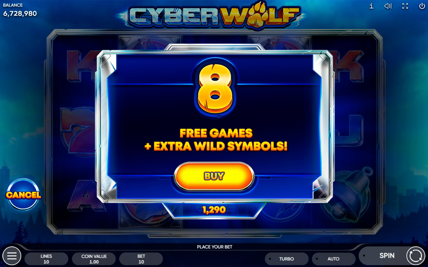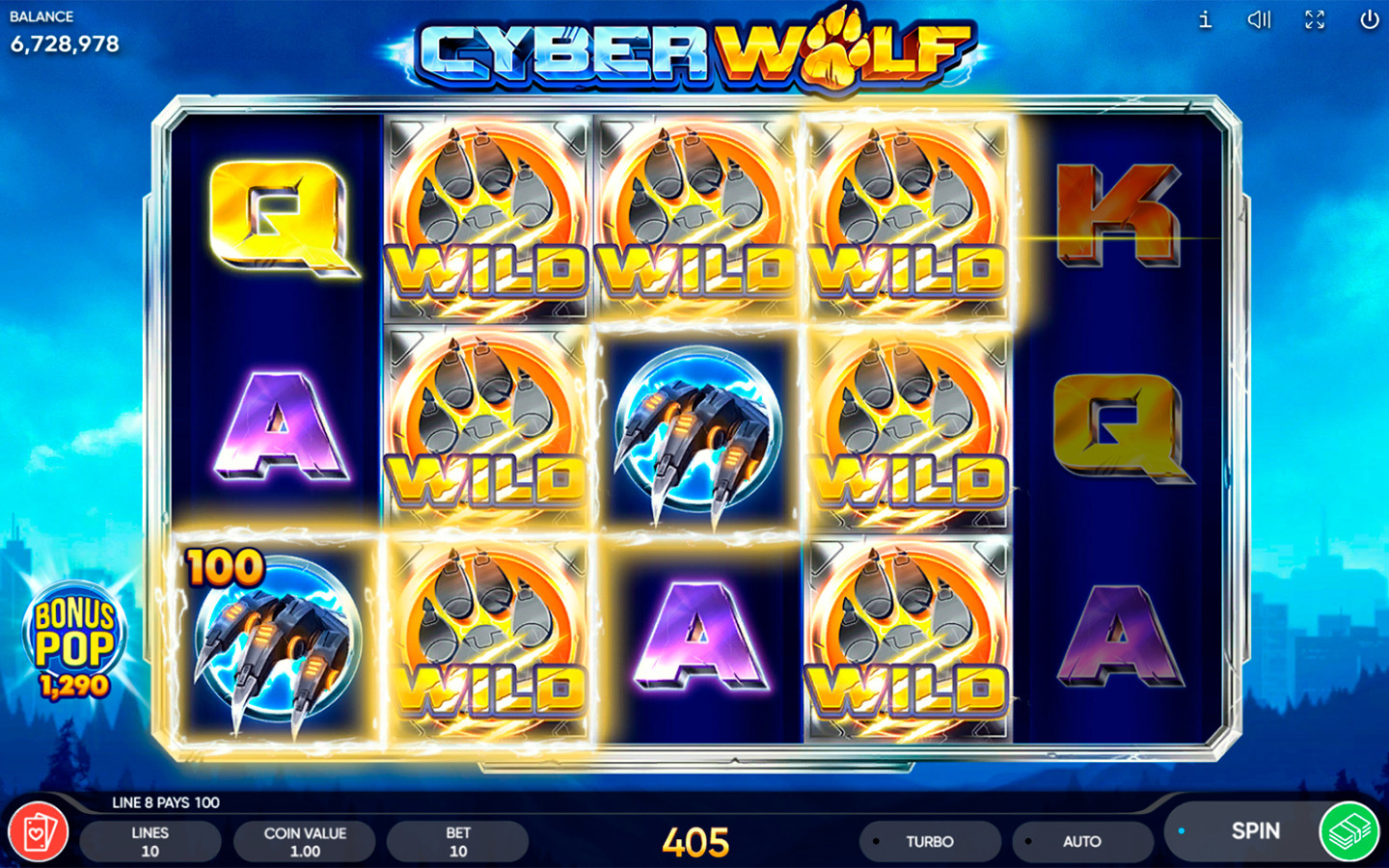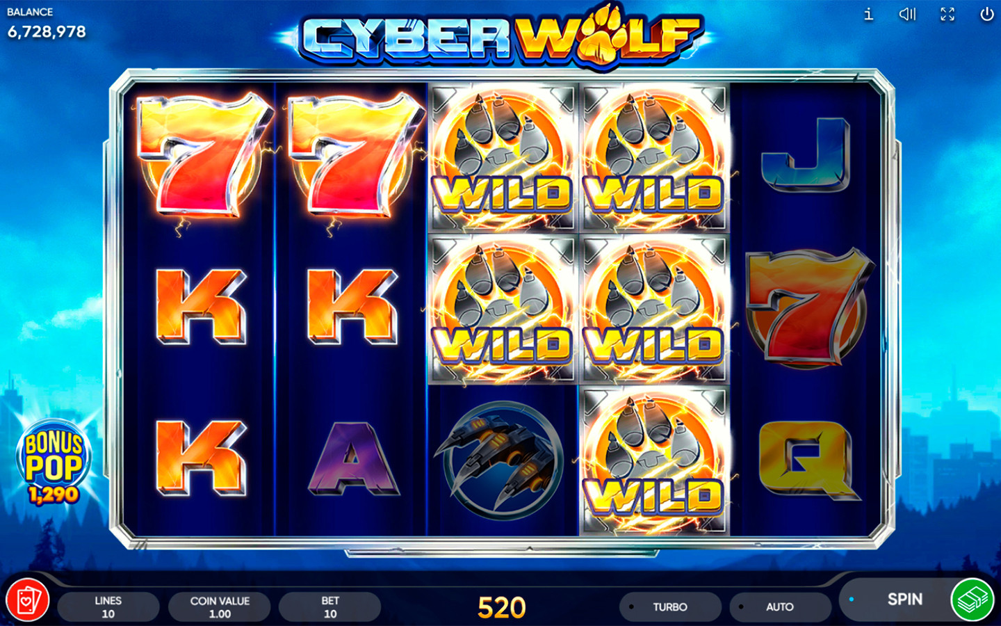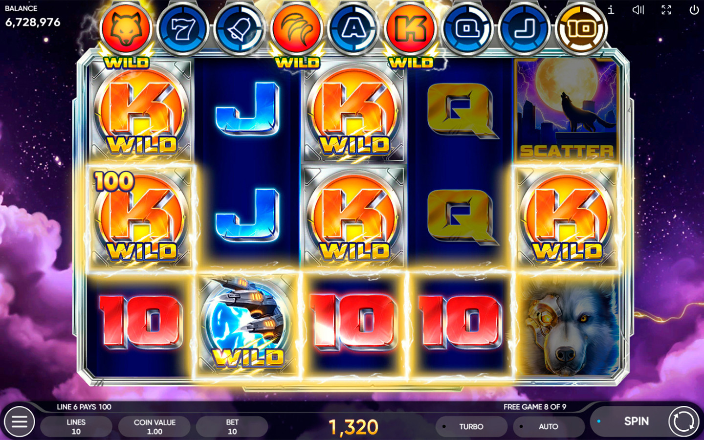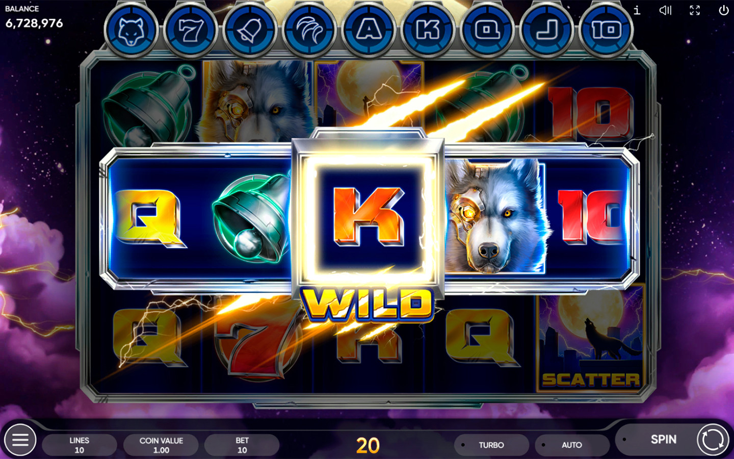 Cyber Wolf de Endorphina no es un lobo como cualquiera. Con el avance de la tecnología, los científicos consiguieron entrenar al lobo común y corriente para que se convierta en un lobo cibernético con personalidad, pensamientos y emociones propios. Con una fuerza superior a la de los lobos comunes, este Cyber Wolf puede ser la pista que te queda por resolver para encontrar la suerte y conseguir la ganancia más grande de tu vida.