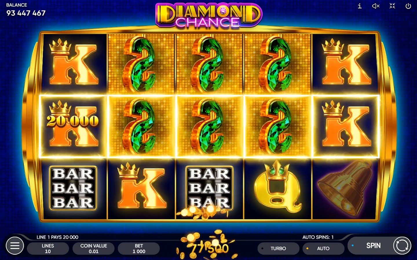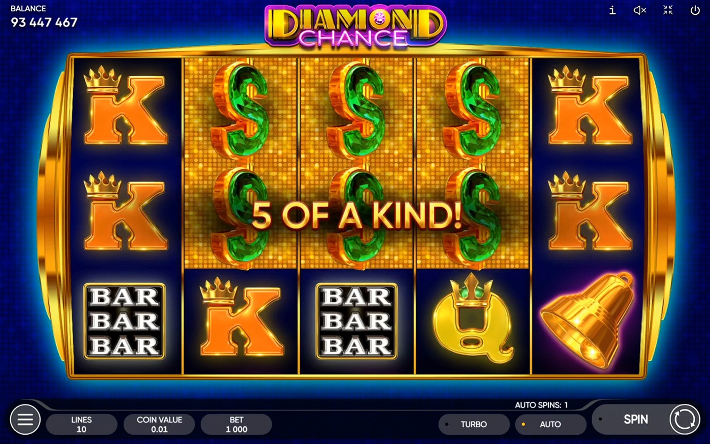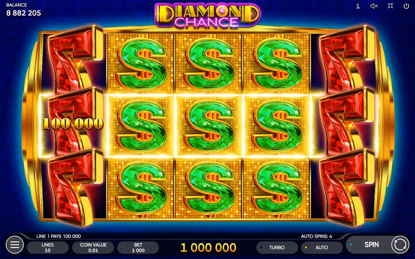 Esta Navidad, Endorphina te trae este tesoro poco convencional directo del espacio en nuestro juego nuevo: Diamond Chance. El desafío festivo se trata de un juego de tragamonedas de 5 carretes y 3 filas con 10 líneas de pago. Todos los premios son para combinaciones del mismo tipo. Los símbolos coincidentes deben estar en líneas de pago activas y en carretes adyacentes, comenzando desde el extremo derecho o el medio. En cada línea de pago activa, se paga únicamente el premio más alto. Las ganancias de distintas líneas de pago se suman. El signo del dólar esmeralda actúa como símbolo Wild. Sustituye a todos los símbolos y se expande sobre posiciones adyacentes. Y los jugadores también pueden optar por el juego de riesgo clásico.