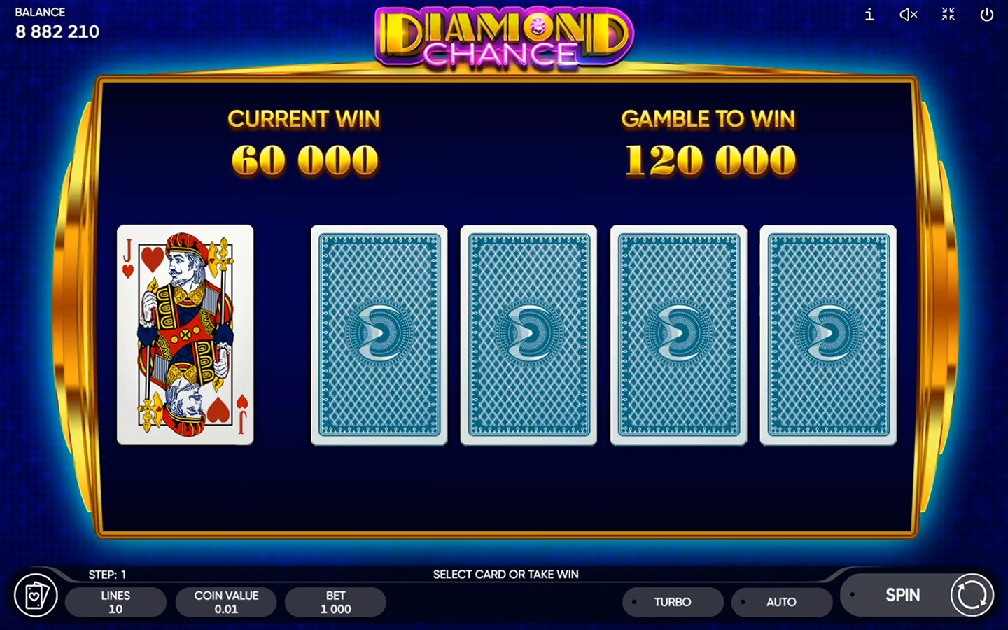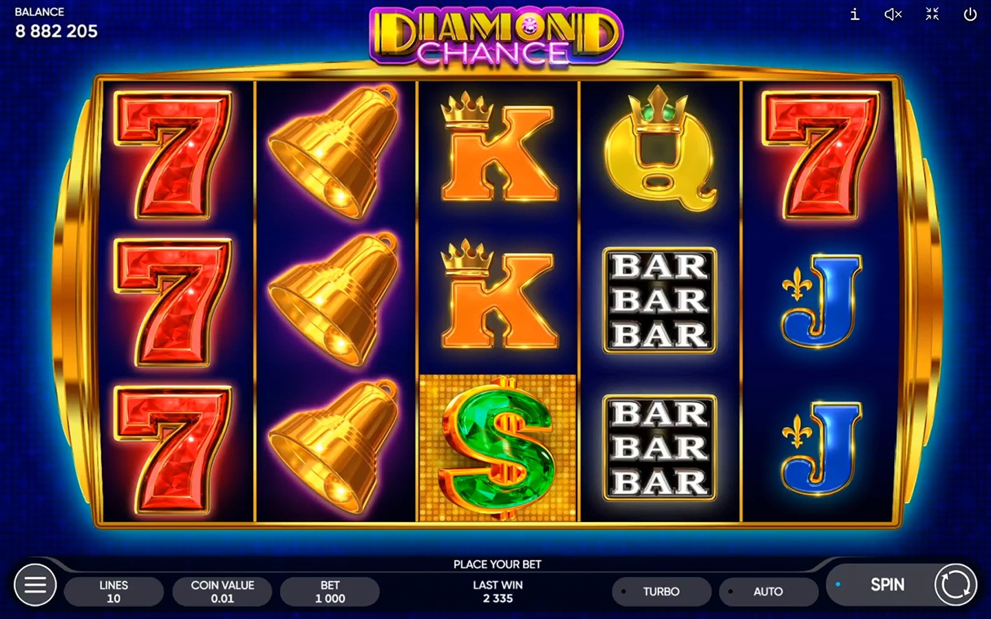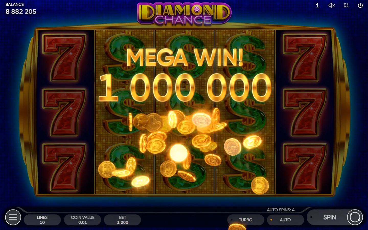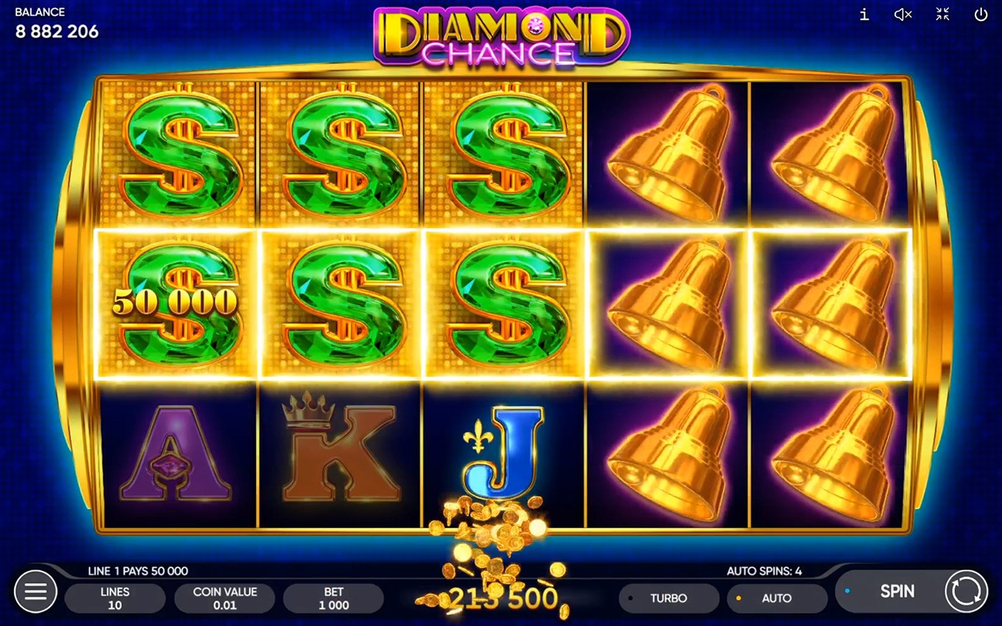 Esta Navidad, Endorphina te trae este tesoro poco convencional directo del espacio en nuestro juego nuevo: Diamond Chance. El desafío festivo se trata de un juego de tragamonedas de 5 carretes y 3 filas con 10 líneas de pago. Todos los premios son para combinaciones del mismo tipo. Los símbolos coincidentes deben estar en líneas de pago activas y en carretes adyacentes, comenzando desde el extremo derecho o el medio. En cada línea de pago activa, se paga únicamente el premio más alto. Las ganancias de distintas líneas de pago se suman. El signo del dólar esmeralda actúa como símbolo Wild. Sustituye a todos los símbolos y se expande sobre posiciones adyacentes. Y los jugadores también pueden optar por el juego de riesgo clásico.