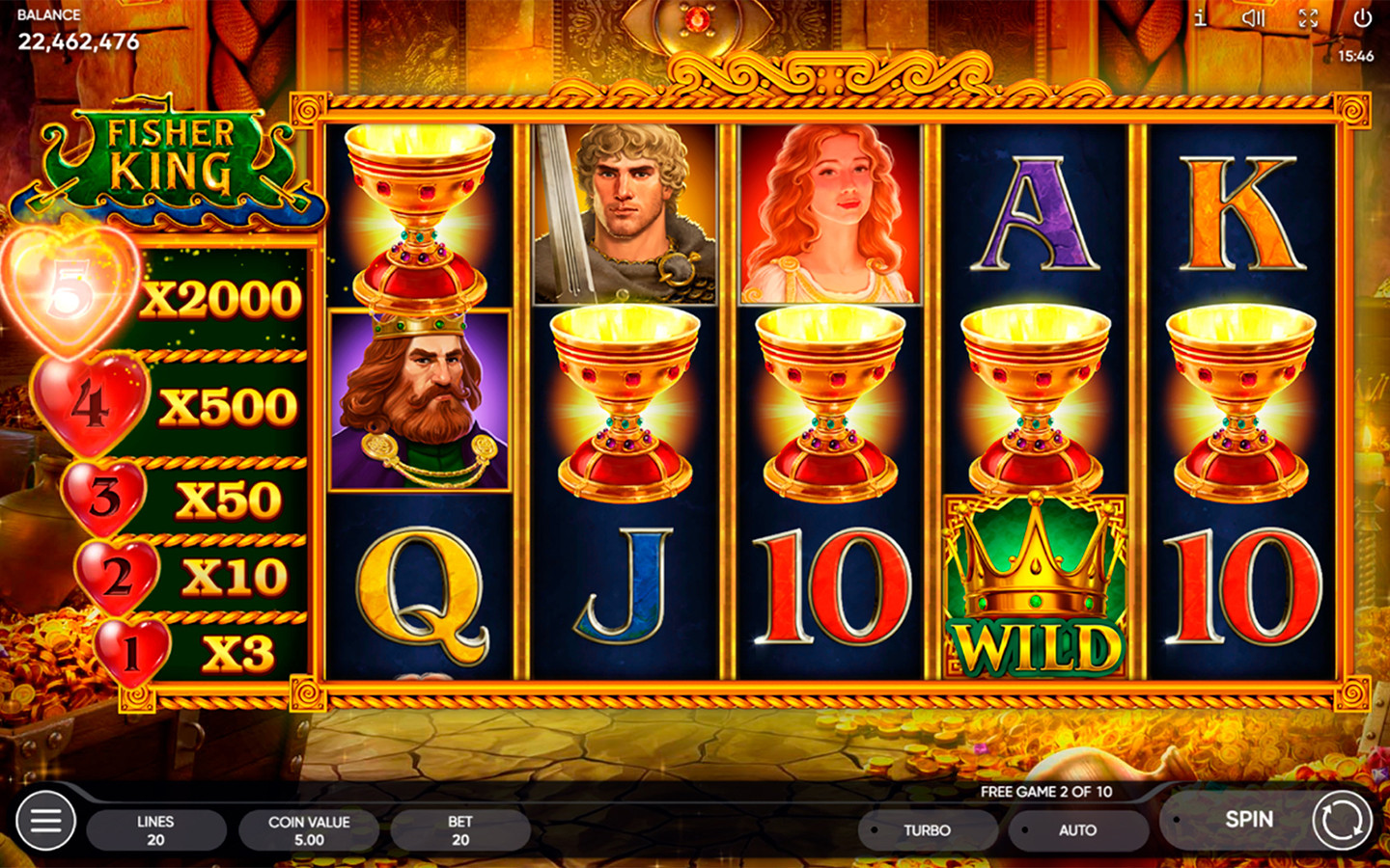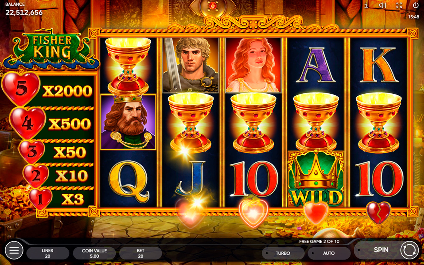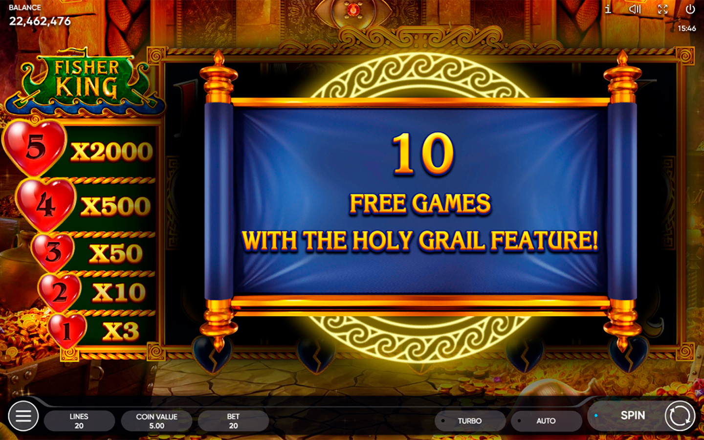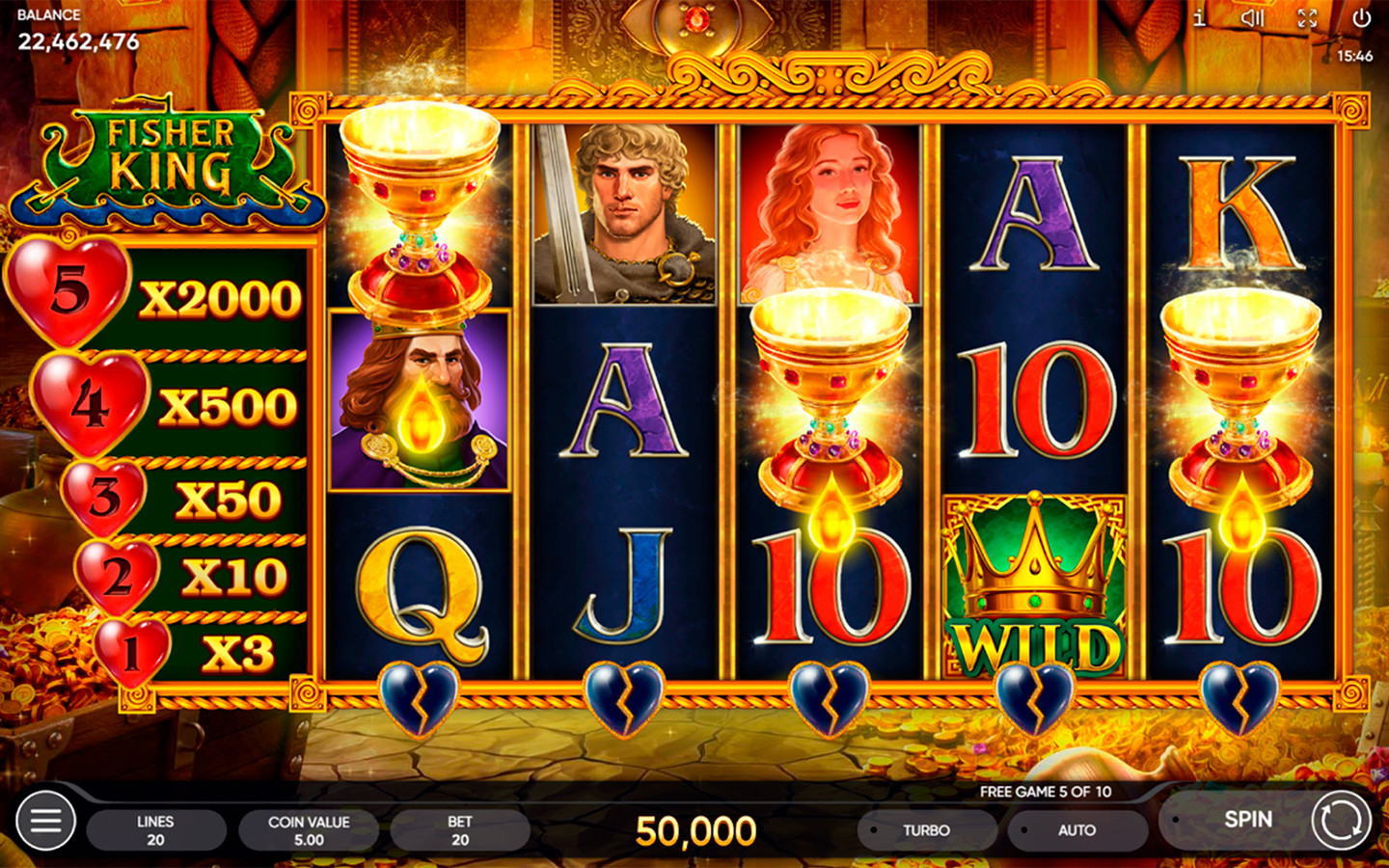 Tan pronto como el Santo Grial aterriza en los carretes, el corazón roto ubicado debajo del carrete correspondiente se reabastece de sangre vital. Dos gotas son suficientes para una recuperación completa y el Rey Pescador queda libre. La recompensa depende enteramente de la cantidad de corazones reabastecidos en simultáneo. Cuanto mayor sea este número, mejor será el premio y más saludable estará el Rey. Cuando los corazones no se recargan por completo, no acumulan ninguna recompensa: continuarás el proceso en la próxima serie de Juegos Gratis. Por 5 corazones completamente recargados, el jugador recibe 2000 veces la apuesta total.
