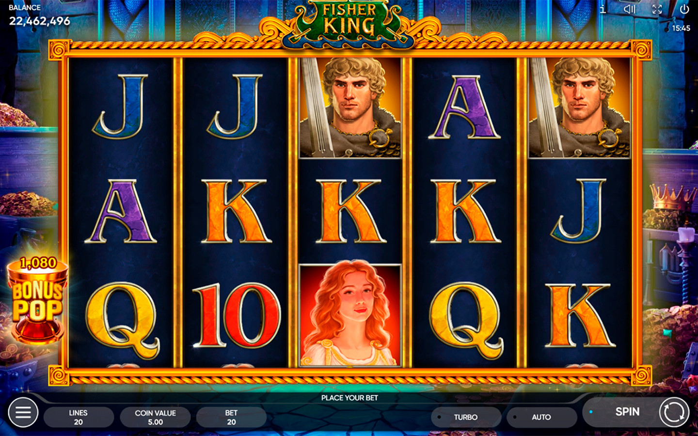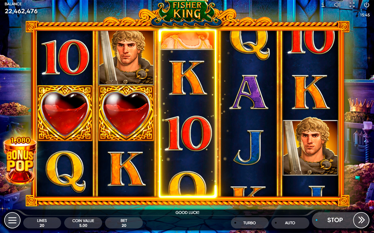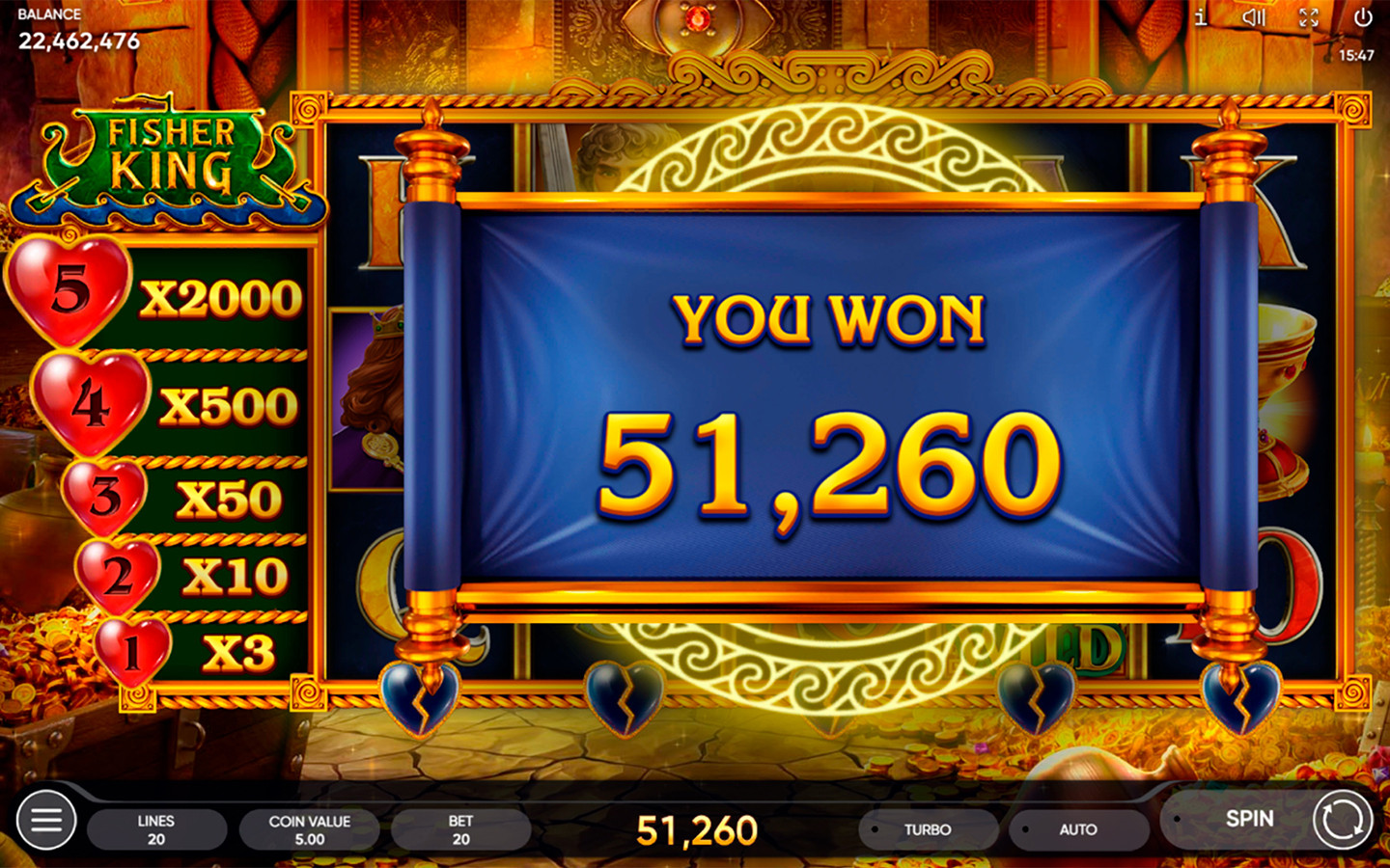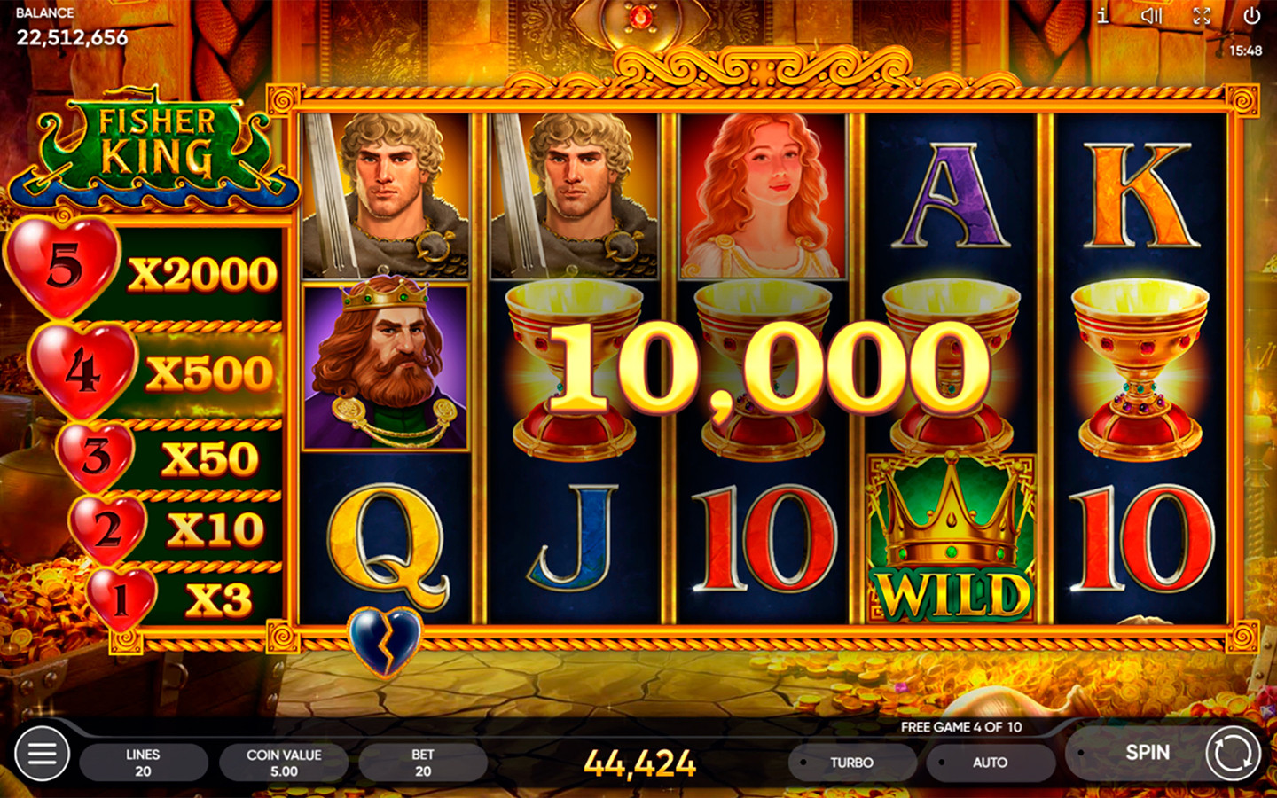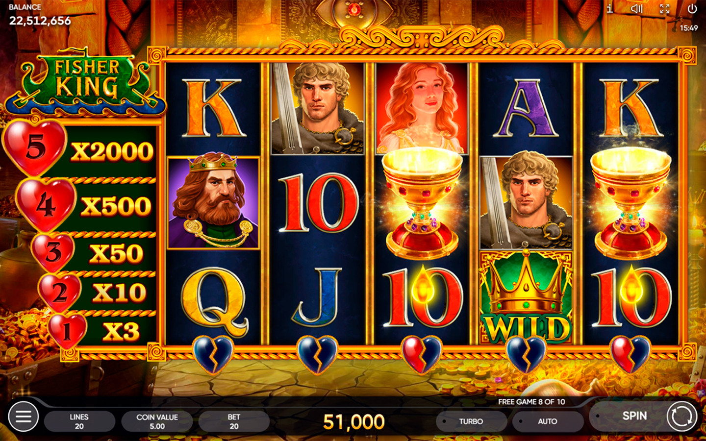 Tan pronto como el Santo Grial aterriza en los carretes, el corazón roto ubicado debajo del carrete correspondiente se reabastece de sangre vital. Dos gotas son suficientes para una recuperación completa y el Rey Pescador queda libre. La recompensa depende enteramente de la cantidad de corazones reabastecidos en simultáneo. Cuanto mayor sea este número, mejor será el premio y más saludable estará el Rey. Cuando los corazones no se recargan por completo, no acumulan ninguna recompensa: continuarás el proceso en la próxima serie de Juegos Gratis. Por 5 corazones completamente recargados, el jugador recibe 2000 veces la apuesta total.