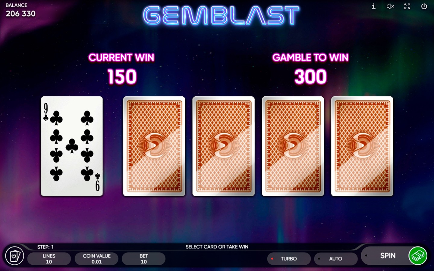 Es hora de seguir la aurora boreal y fascinarte con este juego de tragamonedas de 5 carretes y 3 filas que tiene 10 líneas de pago y brinda a los jugadores la oportunidad de GANAR EN AMBOS SENTIDOS. Independientemente de que la combinación aparezca de izquierda a derecha o de derecha a izquierda, ¡la línea será ganadora! La estrella diamante actúa como un símbolo Wild que sustituye a todos los símbolos y se expande sobre los carretes para activar un GIRO GRATIS, y aparece en los carretes 2, 3 y 4. Por lo tanto, puede brindarte hasta 3 giros gratis, además de un montón de emociones inolvidables que giran y se mueven en los carretes. También puedes probar el juego de riesgo clásico. Elegir una carta de las cuatro repartidas en la mesa puede aumentar tu ganancia hasta 10 veces. Si la carta seleccionada supera a la del repartidor, la ganancia se duplica y puedes volver a intentarlo. Si el repartidor gana en cualquier ronda, el juego de riesgo termina y no recibes ganancias.