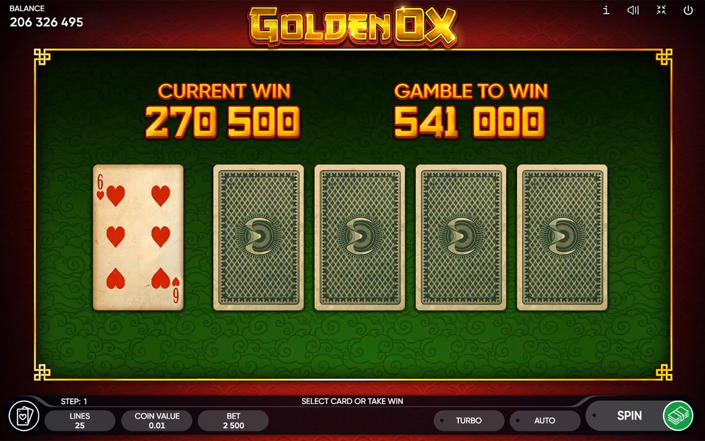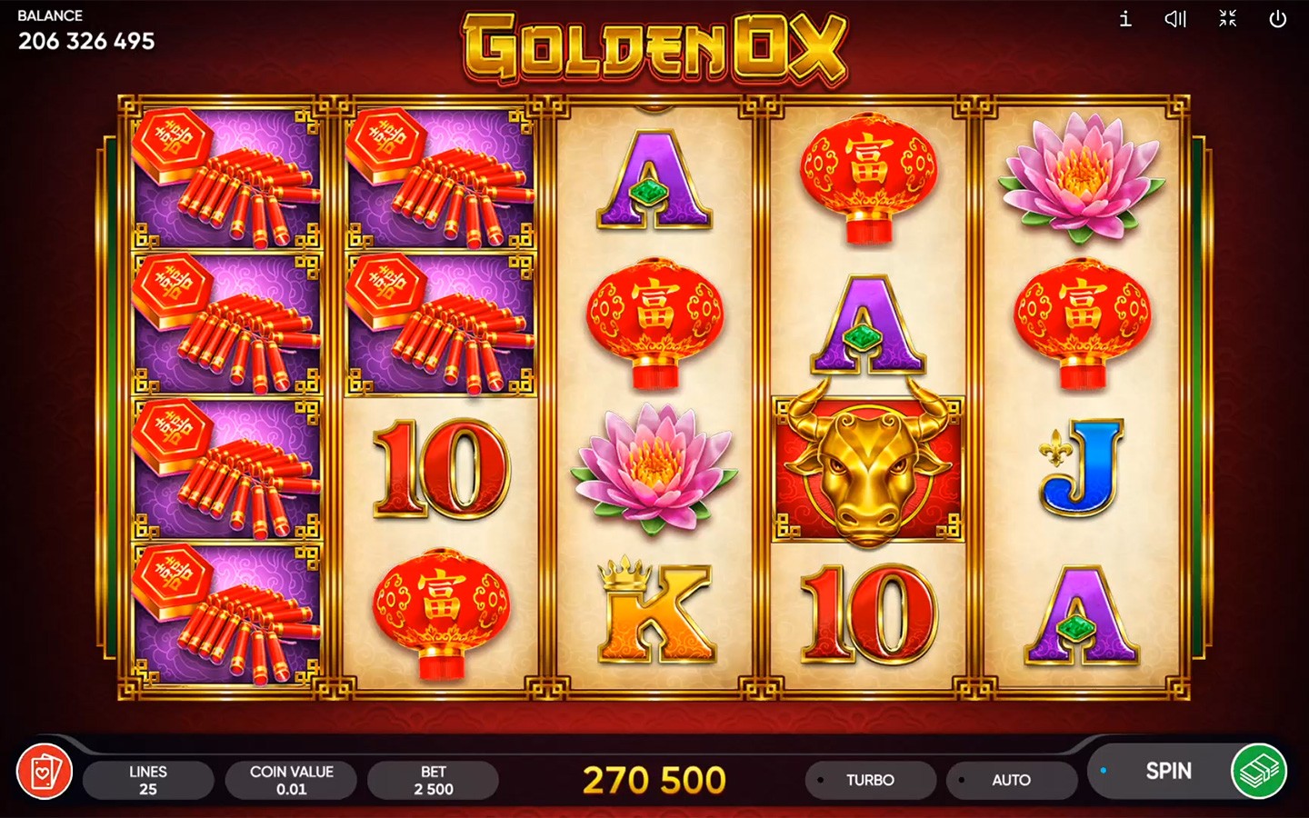 Empecemos este año lunar con la mágica leyenda oriental del buey de oro o, como se lo conoce en inglés, Golden Ox. Esta vez, Endorphina te acerca el oro más exótico de las tradiciones asiáticas. Nuestro nuevo juego de tragamonedas pone su atención en el todopoderoso buey de oro. Los jugadores afortunados experimentarán esa atmósfera auténtica de lujo oriental ilimitado, donde el buey simboliza una riqueza grandiosa y un futuro prometedor.