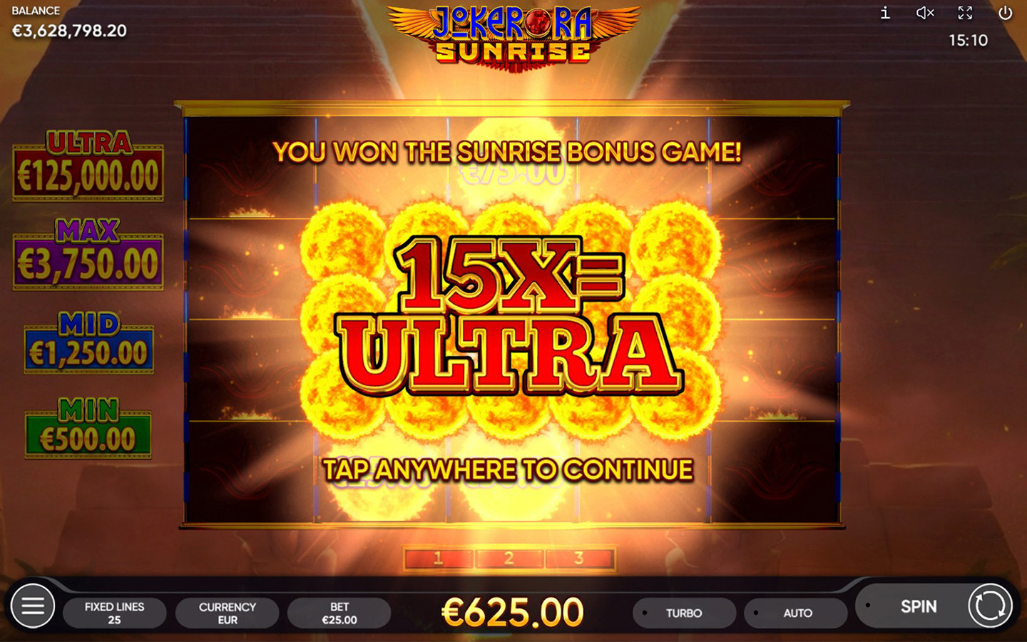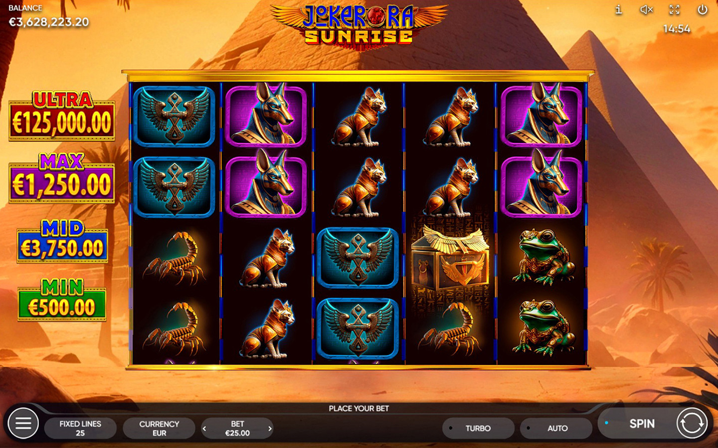 En Joker Ra: Sunrise, la nueva tragamonedas con 5 carretes, 4 filas y 25 líneas de pago fijas, los jugadores encontrarán una gran variedad de bonificaciones que incluyen cofres del tesoro Scatter; la aparición de 3 de ellos activa 8 Juegos Gratis que se pueden reactivar.
