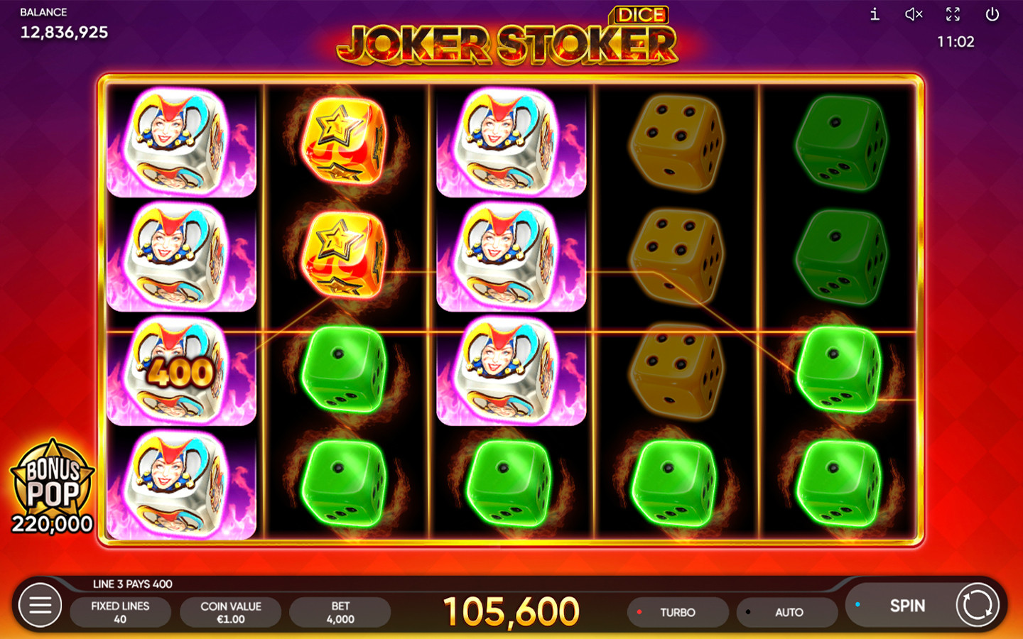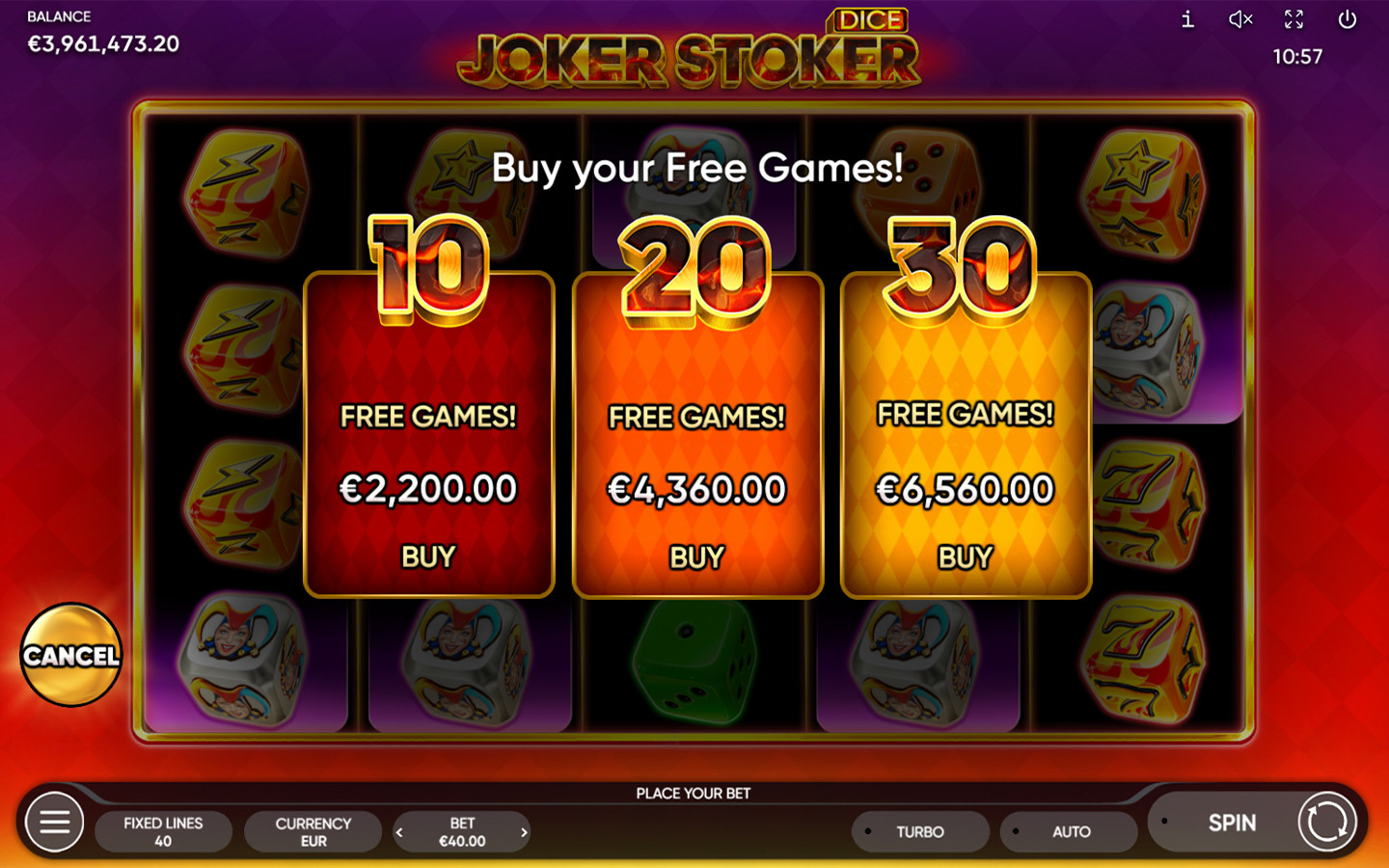 Joker Stoker Dice cuenta con 5 carretes, 4 filas y 40 líneas de pago fijas. Los símbolos Scatter cuentan en cualquier posición de los carretes. El dado del comodín es Wild, sustituye a todos los símbolos, excepto al Scatter, aparece apilado en el juego principal y puede aparecer apilado durante los Juegos Gratis. Por lo tanto, la temperatura puede subir todavía más para los jugadores, pues 3 Scatters activan 10 Juegos Gratis, 4 activan 20 Juegos Gratis y 5 activan 30 Juegos Gratis.