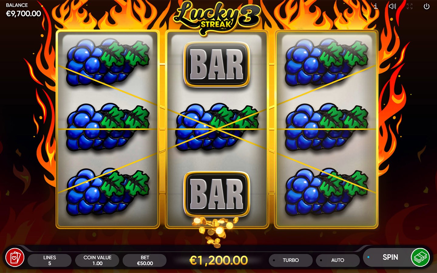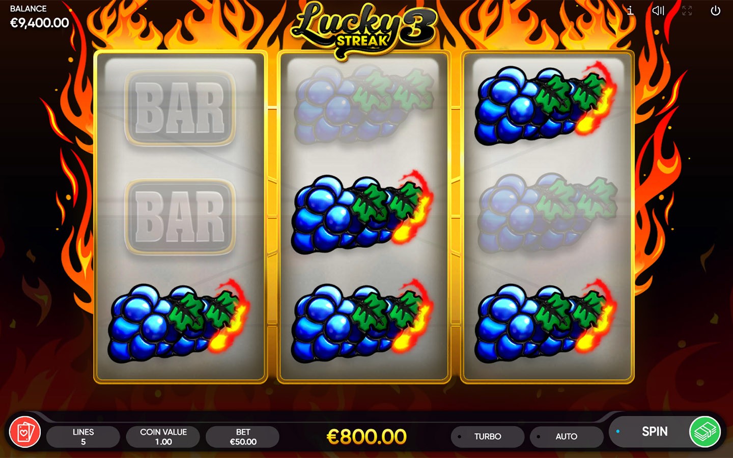 La tragamonedas Lucky Streak 3 es otro juego en línea de la popular saga Lucky Streak de Endorphina. ¡Esta vez con la atmósfera más oscura y con la mayor cantidad de llamas del juego! Símbolos hermosos y pulidos con un ambiente bastante clásico que permitirán que todos disfruten de este juego imperdible de 3 filas y 3 carretes. La jugabilidad es sencilla y deja suficiente espacio para que los jugadores disfruten de un tiempo de juego ininterrumpido.