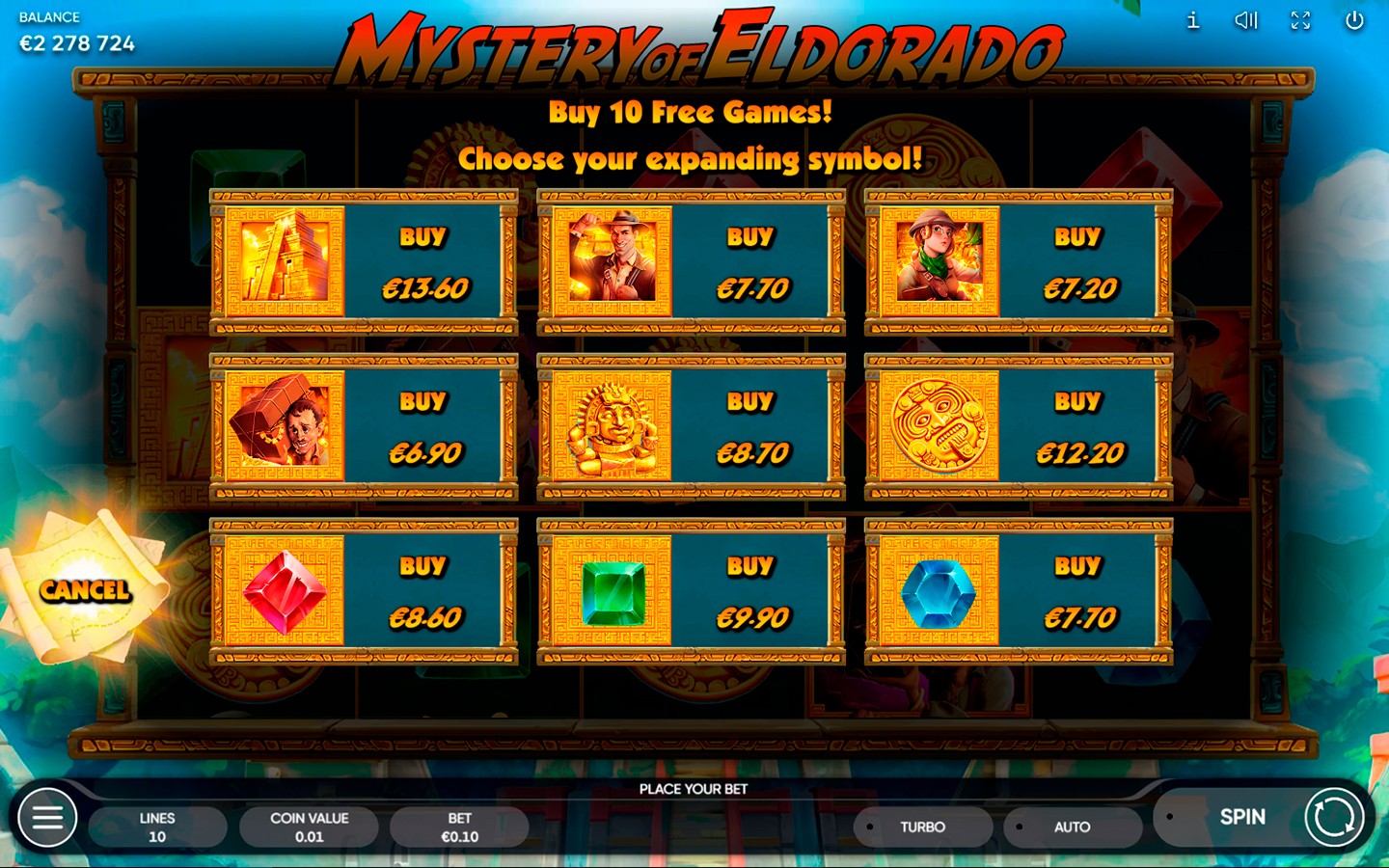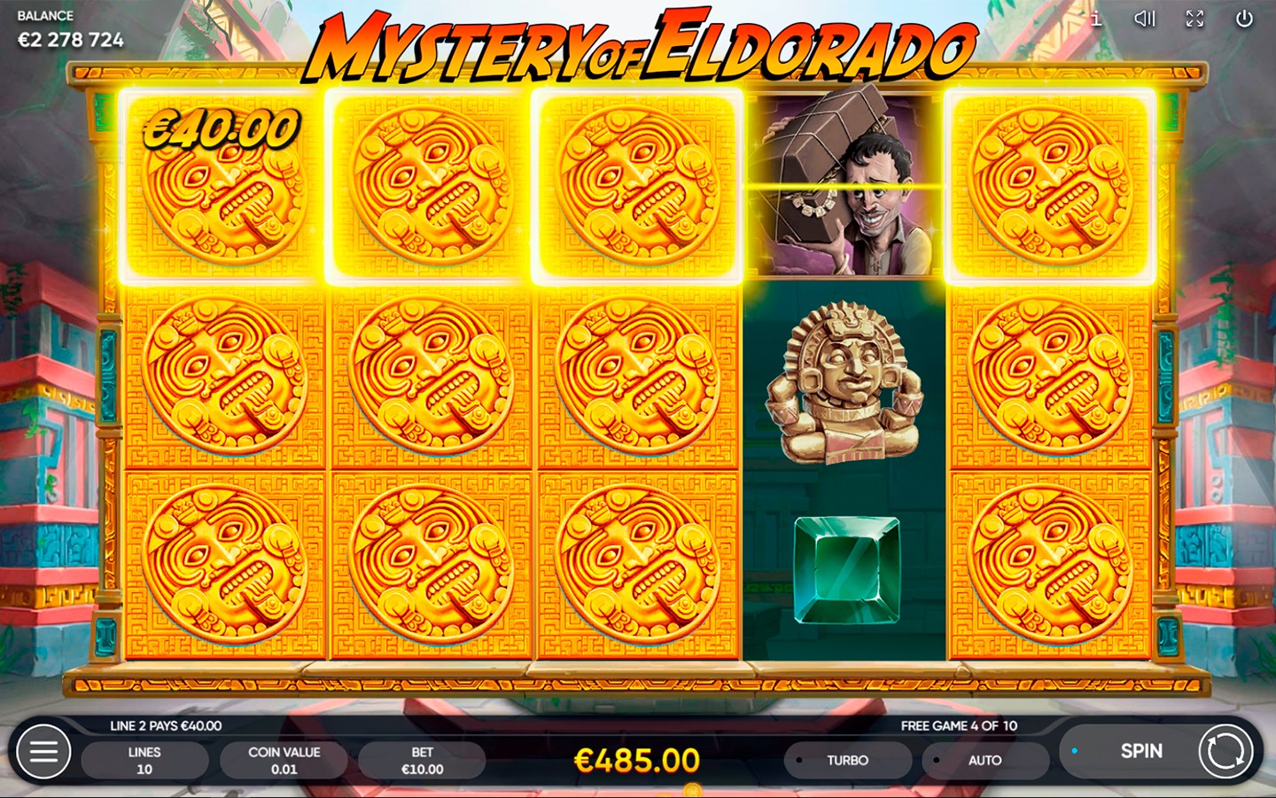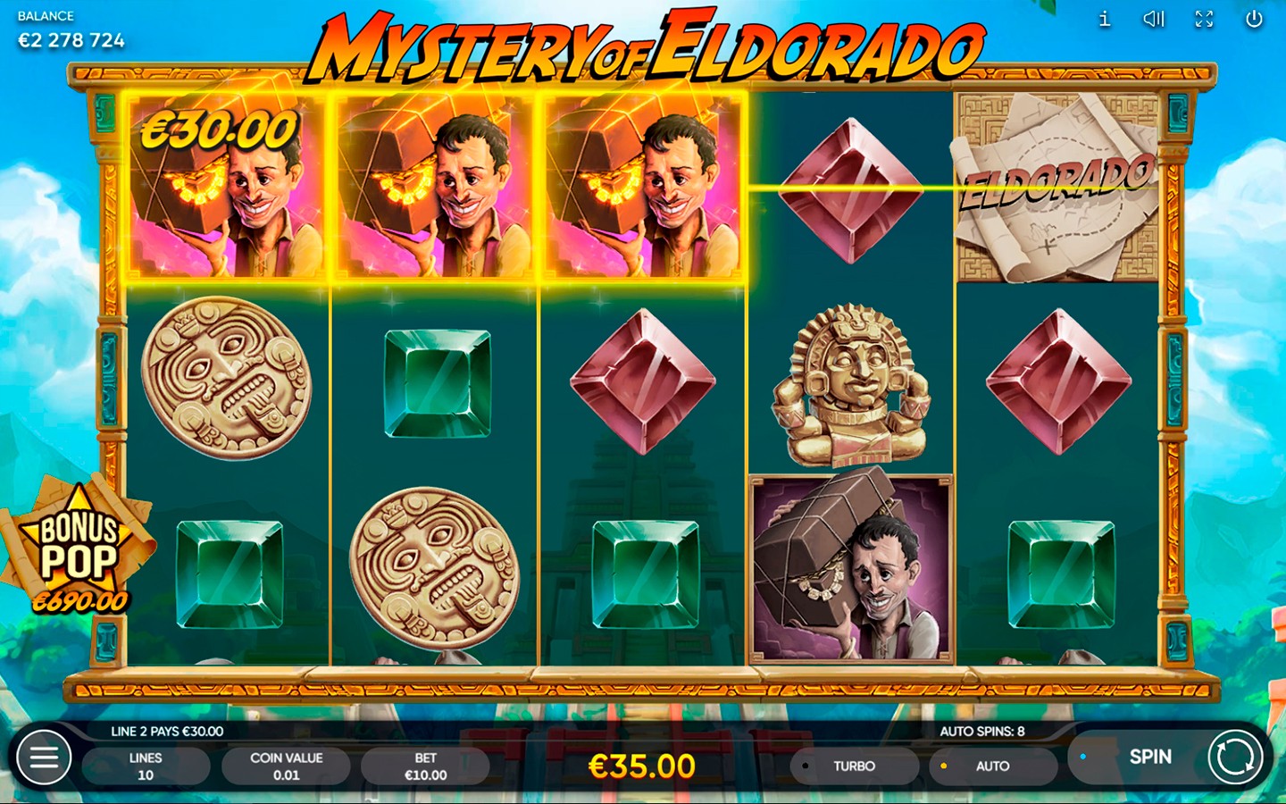 La tragamonedas Mystery of Eldorado es un juego en línea de 5 carretes, 3 filas y 10 líneas de pago que te llevará en una aventura por encontrar la ciudad dorada perdida.