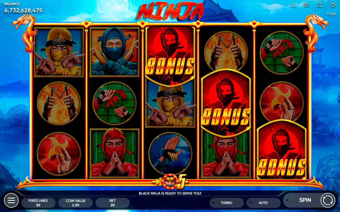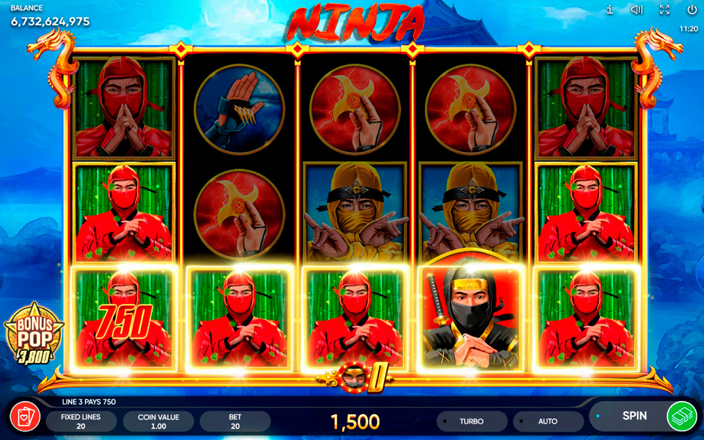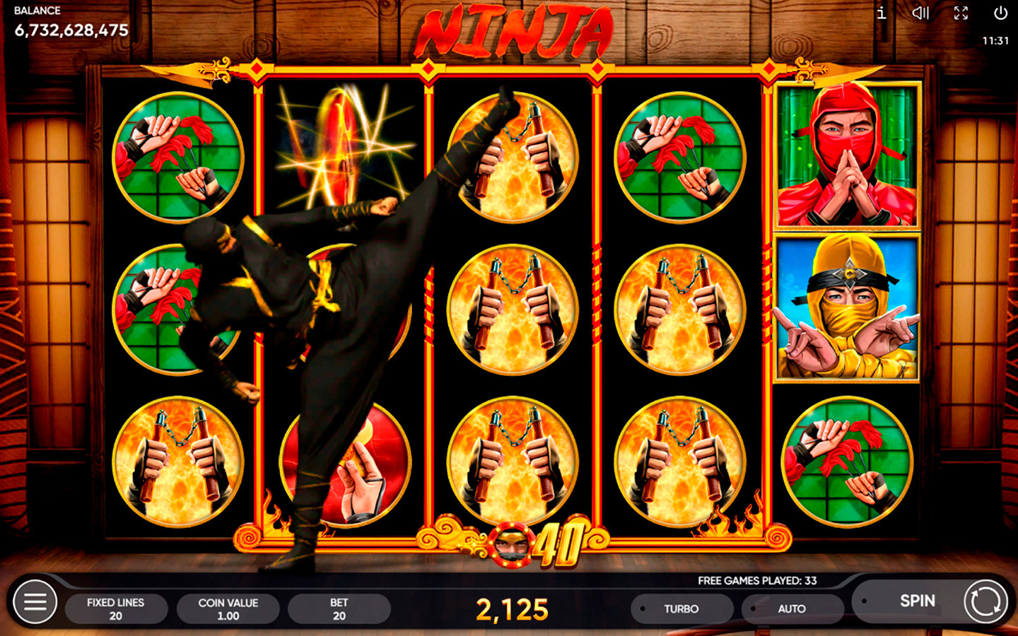 Ninja, el juego tragamonedas de 5 carretes, 3 filas y 20 líneas de pago fijas de Endorphina, es nuestro homenaje a los héroes de las películas de acción de los años 80 que fueron una verdadera inspiración para todos los hombres de esa época. Las ganancias de distintas líneas de pago se suman. En cada línea de pago, se paga únicamente el premio más alto. Los símbolos coincidentes deben estar en las líneas de pago y en carretes adyacentes, comenzando desde el extremo izquierdo.