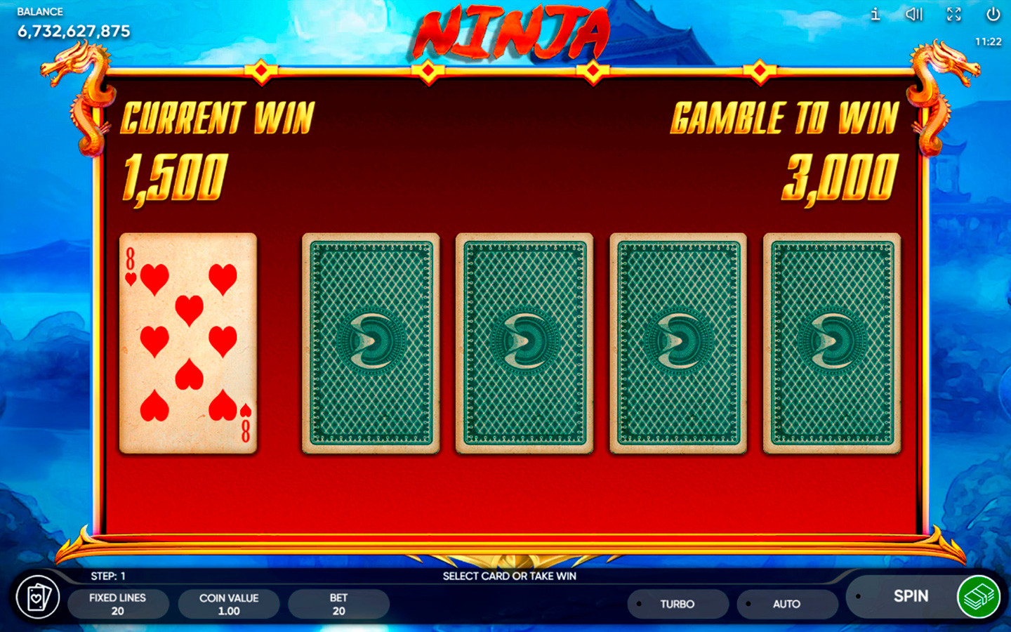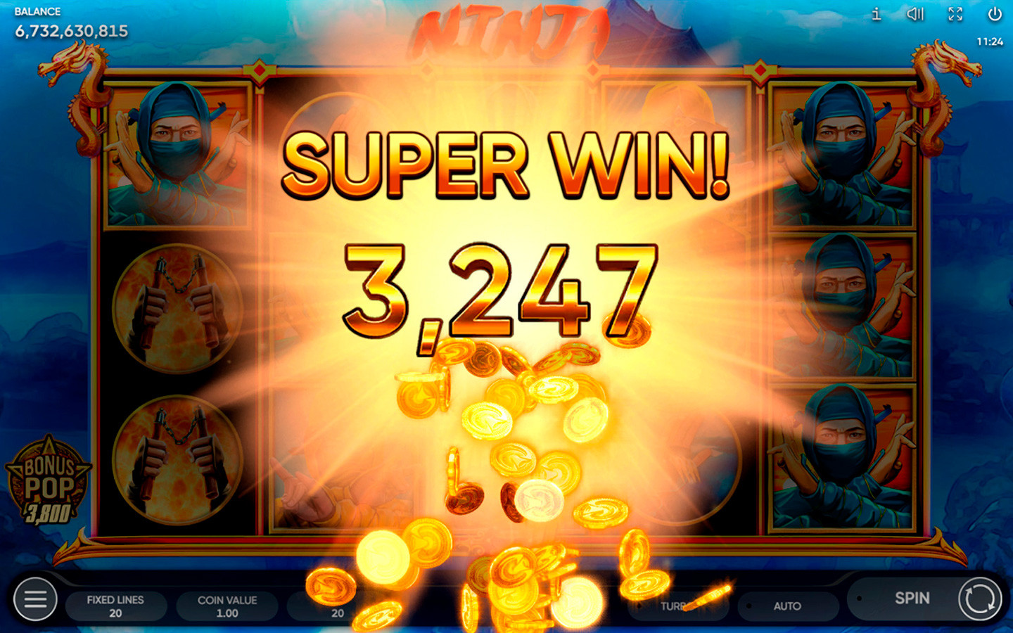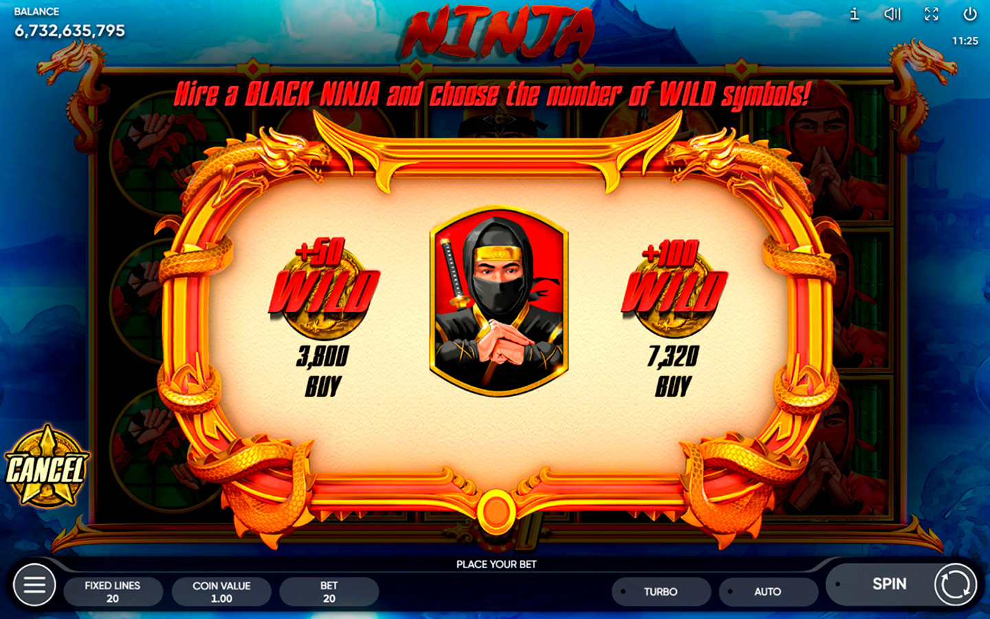 Ninja, el juego tragamonedas de 5 carretes, 3 filas y 20 líneas de pago fijas de Endorphina, es nuestro homenaje a los héroes de las películas de acción de los años 80 que fueron una verdadera inspiración para todos los hombres de esa época. Las ganancias de distintas líneas de pago se suman. En cada línea de pago, se paga únicamente el premio más alto. Los símbolos coincidentes deben estar en las líneas de pago y en carretes adyacentes, comenzando desde el extremo izquierdo.