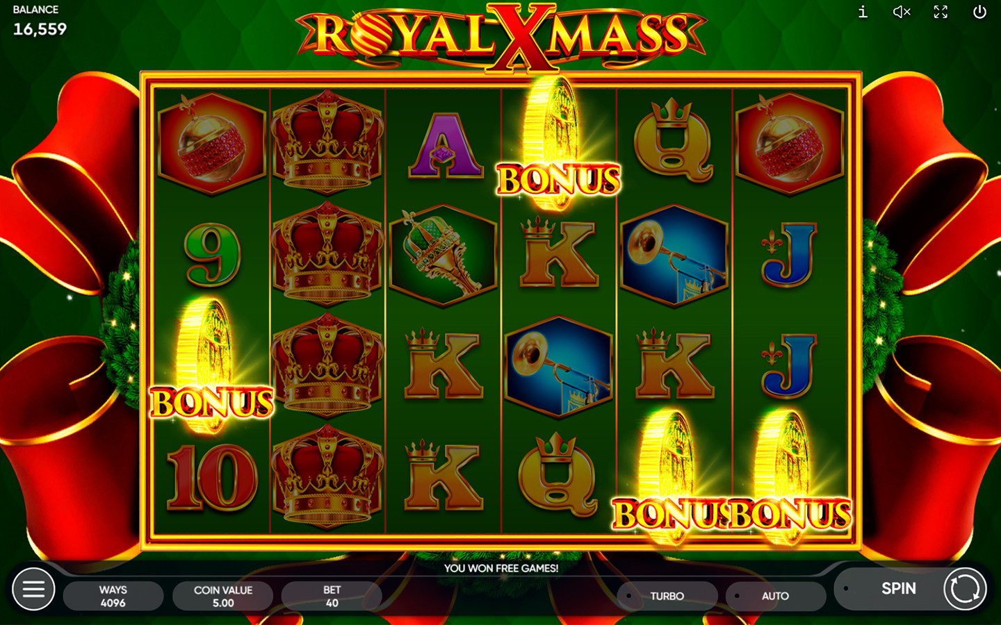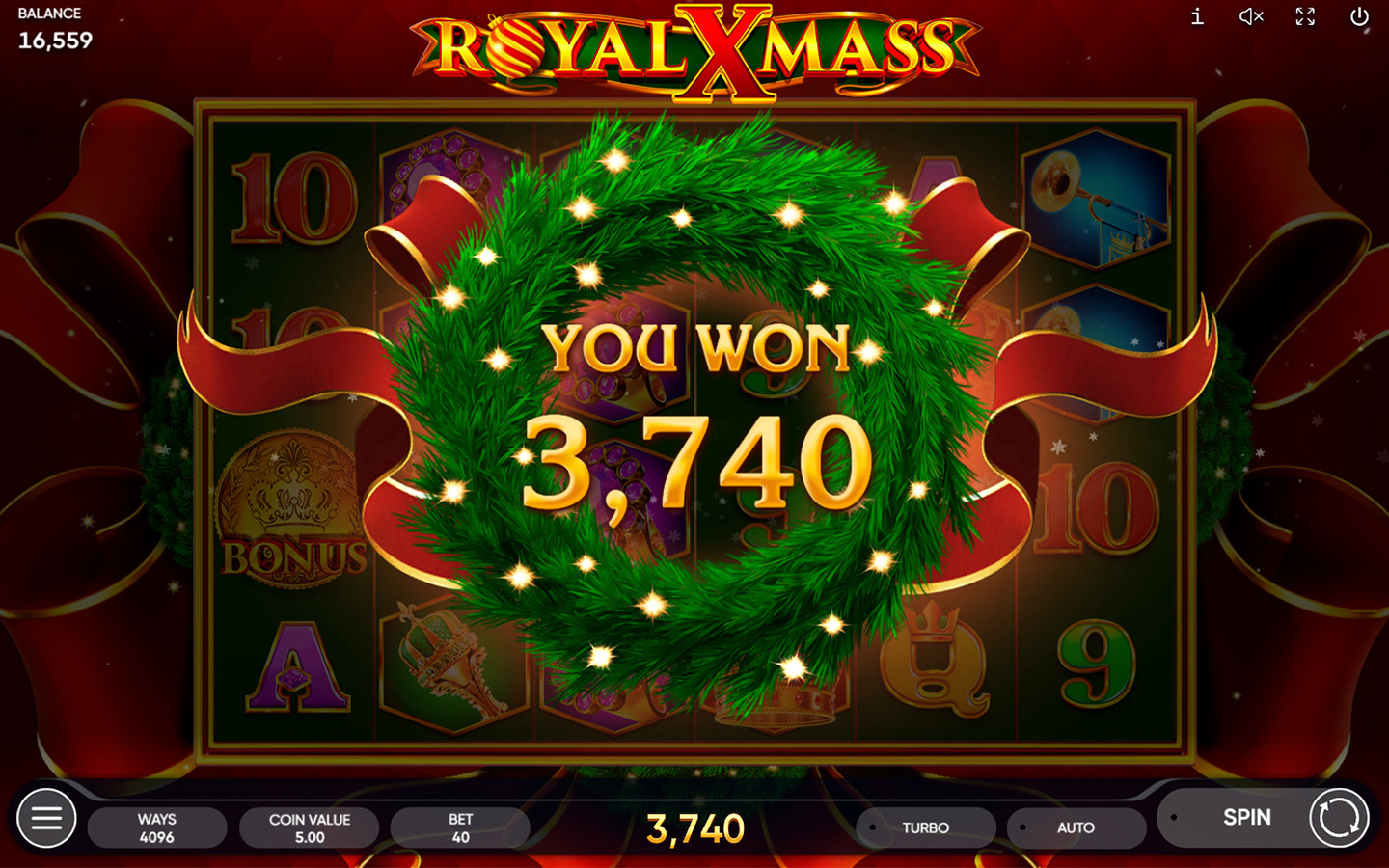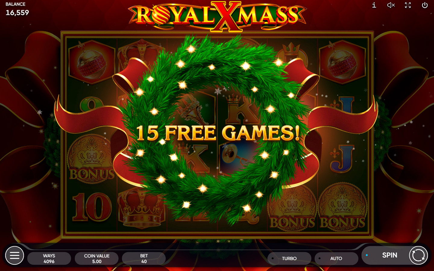 El símbolo Wild, que es una corona navideña, sustituye a todos los símbolos, excepto al Bonus, y aparece en los carretes 2, 3, 4, 5 y 6.