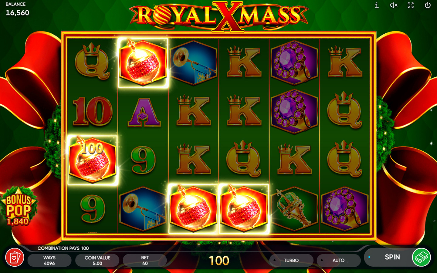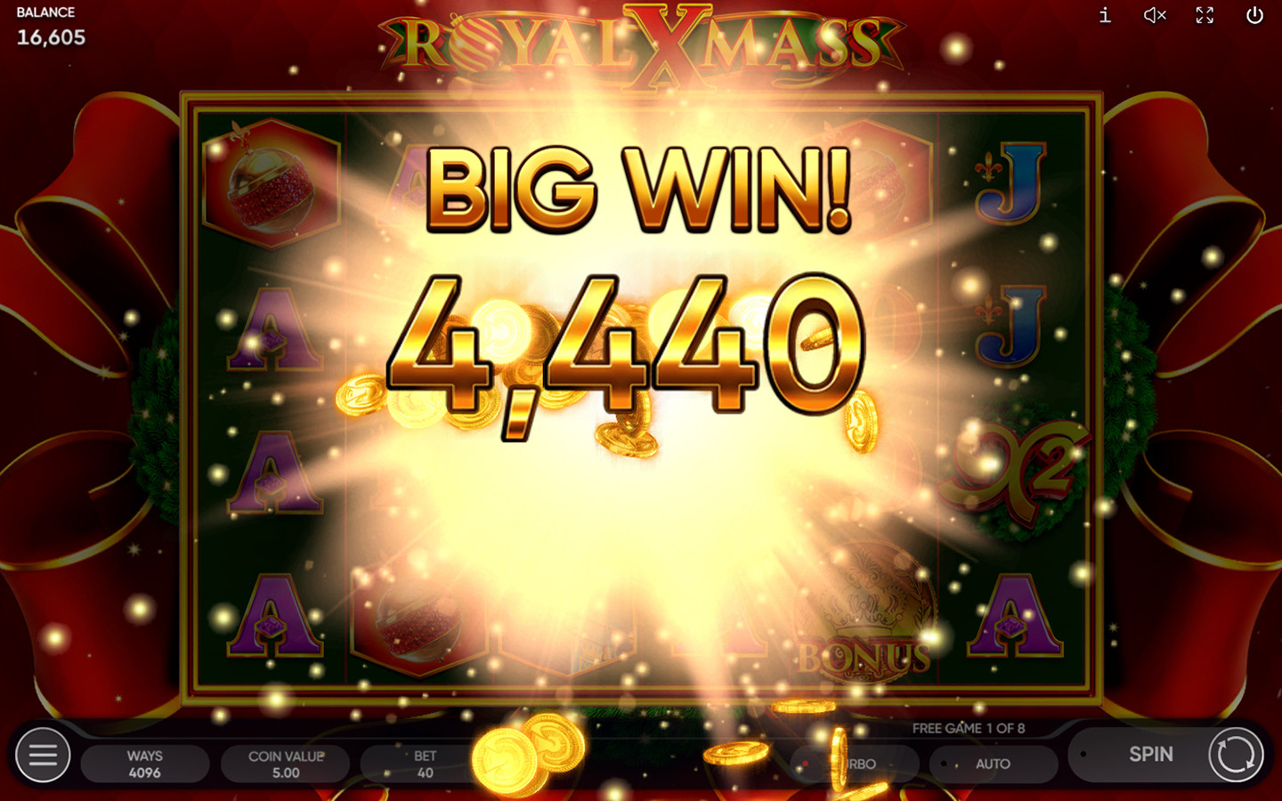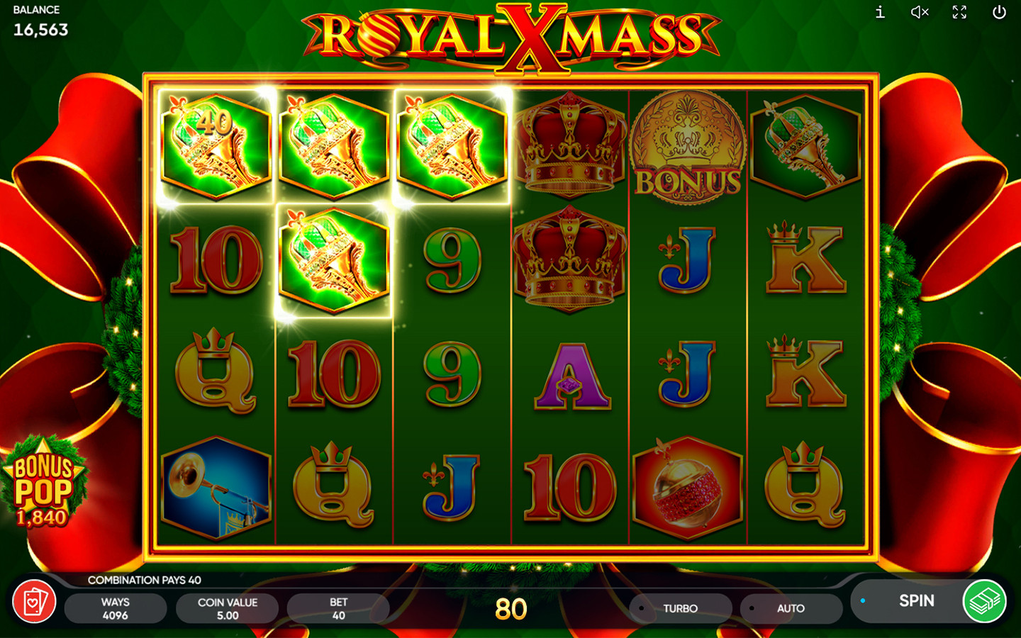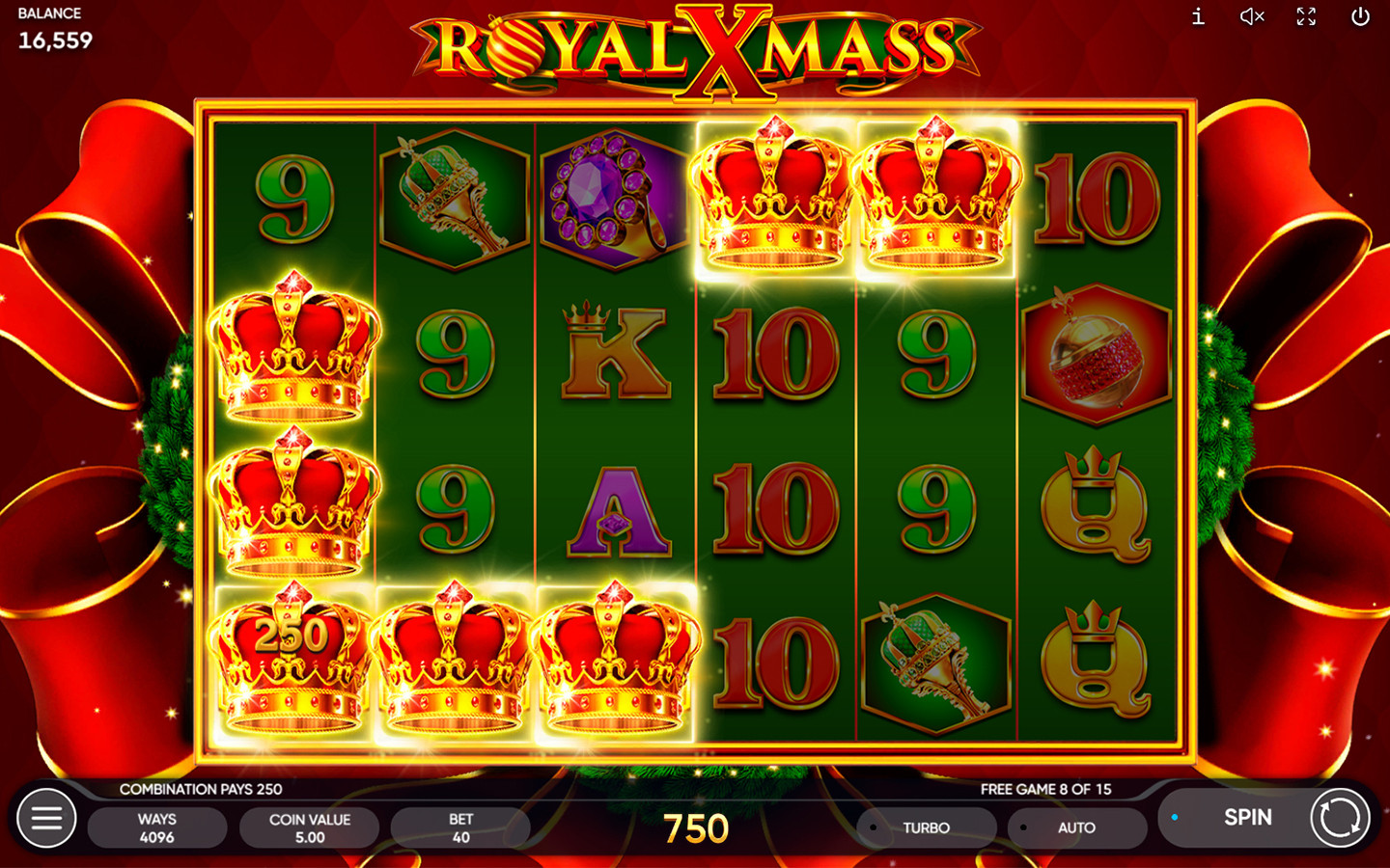 El símbolo Wild, que es una corona navideña, sustituye a todos los símbolos, excepto al Bonus, y aparece en los carretes 2, 3, 4, 5 y 6.
