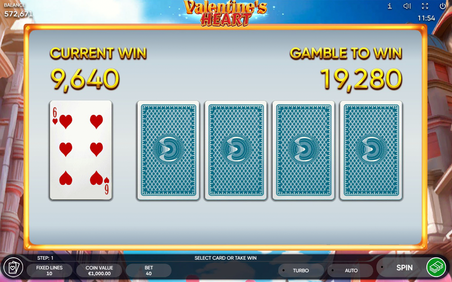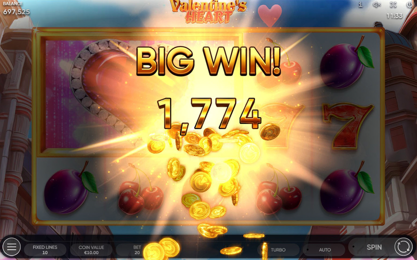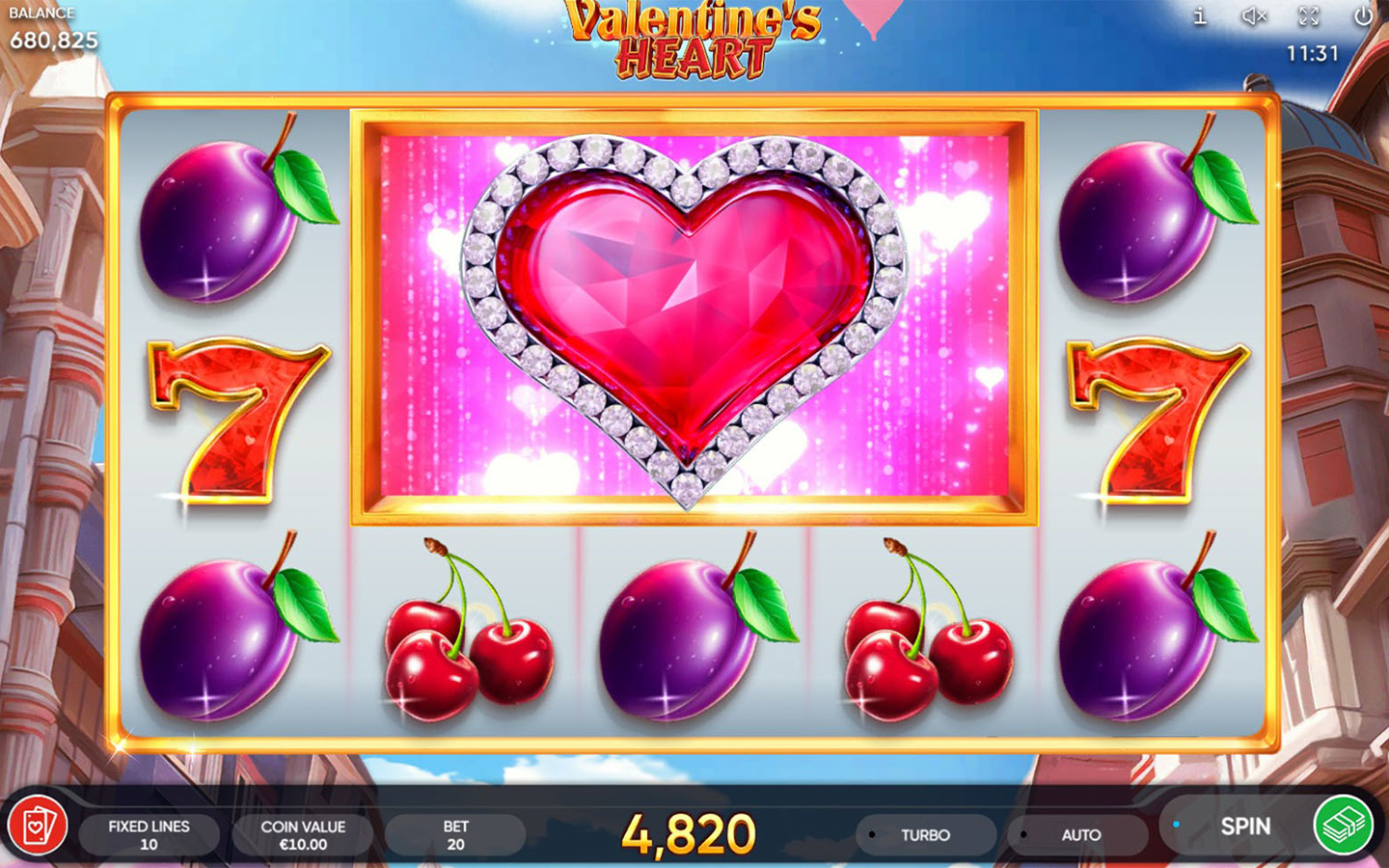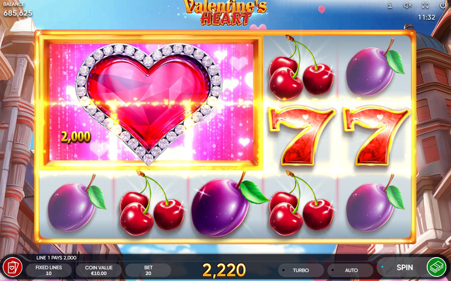 Valentine's Heart ofrece una jugabilidad simple pero encantadora, con 5 carretes, 3 filas y 10 líneas de pago fijas. ¡Los sonidos suaves cuando las frutas frescas giran en los carretes te mantendrán entretenido durante horas! El juego también presenta un Wild con la forma de un corazón de diamante y que se extiende hacia posiciones adyacentes para encarnar el regalo perfecto del Día de San Valentín. Los símbolos coincidentes deben estar en las líneas de pago y en carretes adyacentes, comenzando desde el extremo izquierdo, el extremo derecho o el medio del carrete.