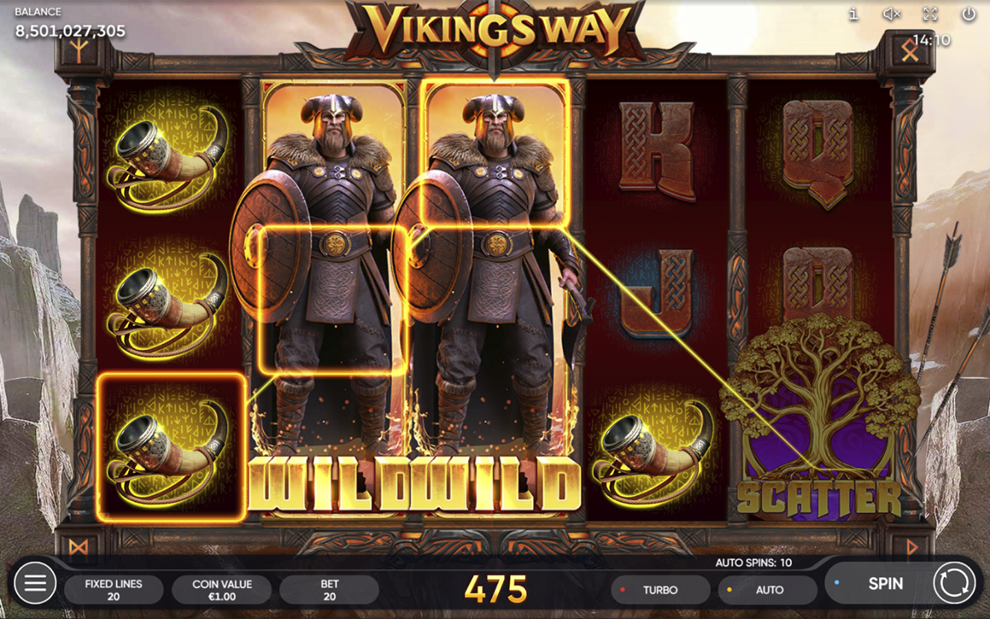 Zarpa con los guerreros vikingos y conquista los carretes de la fortuna. Los dioses le sonríen a quienes demuestran valentía. ¿Conseguirás ascender hacia la victoria y unirte al salón de los campeones? ¡Únete a los vikingos en su viaje y empuña tu arma en la batalla junto a algunos de los guerreros escandinavos más fuertes!