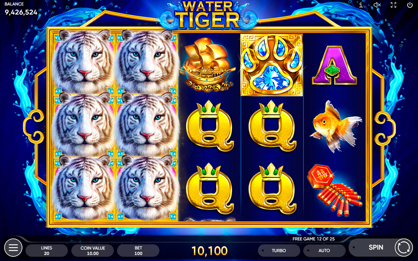 Nuestro juego de tragamonedas festivo de 5 carretes y 3 filas cuenta con 20 líneas de pago. Un tigre blanco único e inusual es uno de los símbolos que aparecen en los carretes de este entretenido y gratificante juego de tragamonedas. Este tigre funciona como el WILD del juego. En el juego, el WILD sustituye a todos los símbolos, excepto al SCATTER.