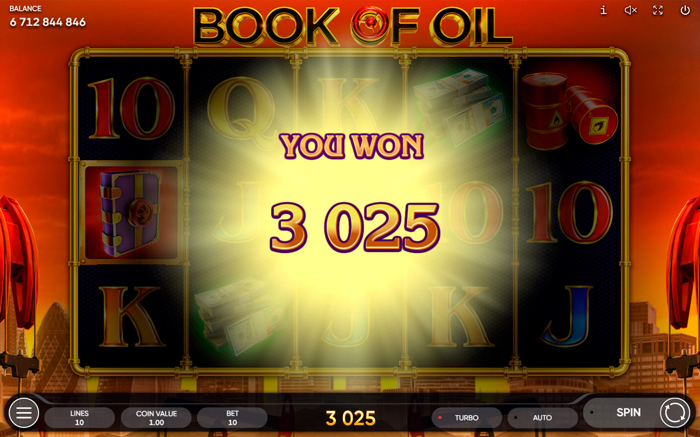 Surrounded by all the golden beacons, this mighty treasure shines so bright, that the stars become dim. The Book symbol acts as Scatter and Wild, revealing the craziest wins of all time. Players also get hypnotised by the Oil Tycoon symbol and the stunningly bright symbols of Oil Derricks and Tanks which promptly dance on the reels. All together, they create an incredible upper-class feel within the Book of Oil game.