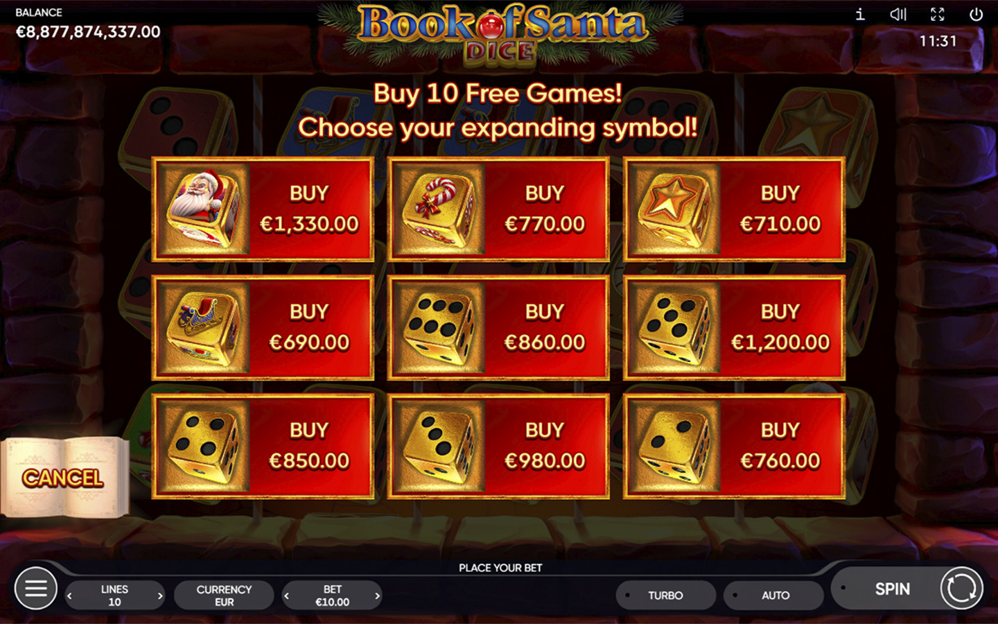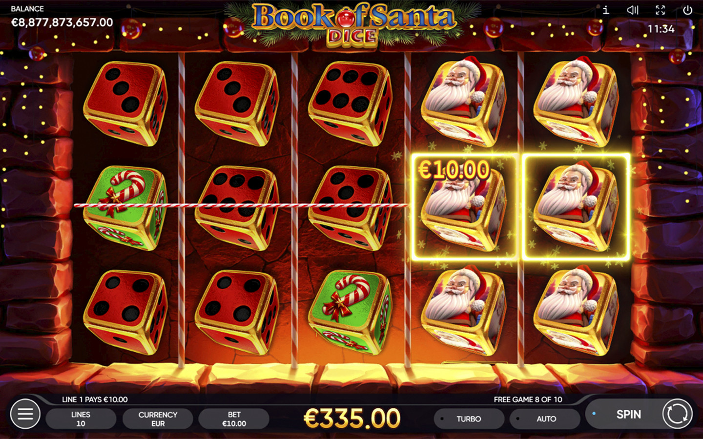 This 5-reel, 3-row slot with 10 paylines will teleport you to the center of all Christmas festivities. Celebrate Christmas with stars, snowflakes, sleighs, and candy canes encrusted deep within our dice - even Santa makes an appearance! Will you find your name in Santa’s special Christmas book?