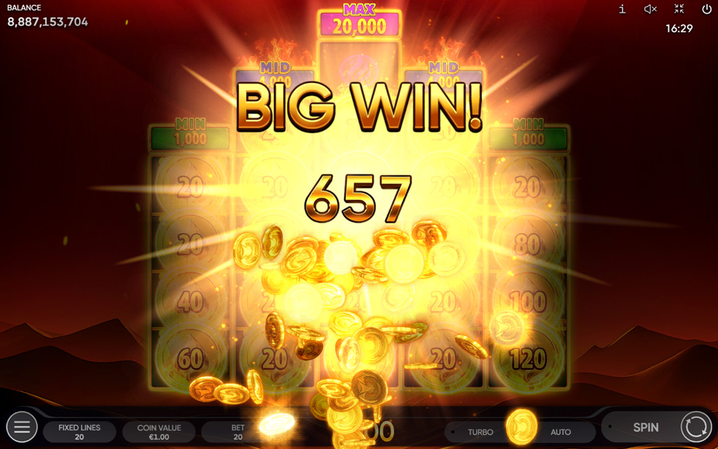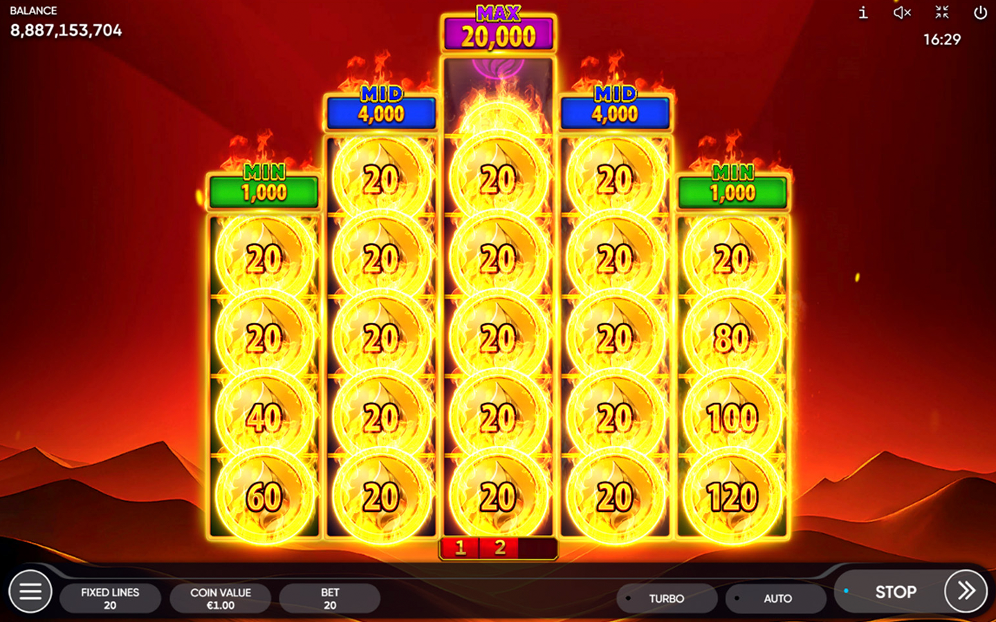 In our new 5-reel 3-row slot game with 20 fixed paylines, 6 or more Burning Coins trigger the Fiery Fortune Bonus Game. During the Bonus Game, the main game reels turn into a grid with 5 columns of different heights. The triggering Burning Coins move to the relevant positions of the Bonus Game grid, and the game has started! Special symbols landing on the reels remain in place, while empty cells keep the reels spinning. Every Burning Coin shows the prize – the Multiplier from x1 up to x25. Each new Collect Symbol is awarded with a sum of all the prizes shown on Burning Coins. Meanwhile, Burning Coins preserve their prizes! The winnings depend on the column’s height, up to 1000x the total bet. If multiple columns are filled, the player receives a payout for each one.