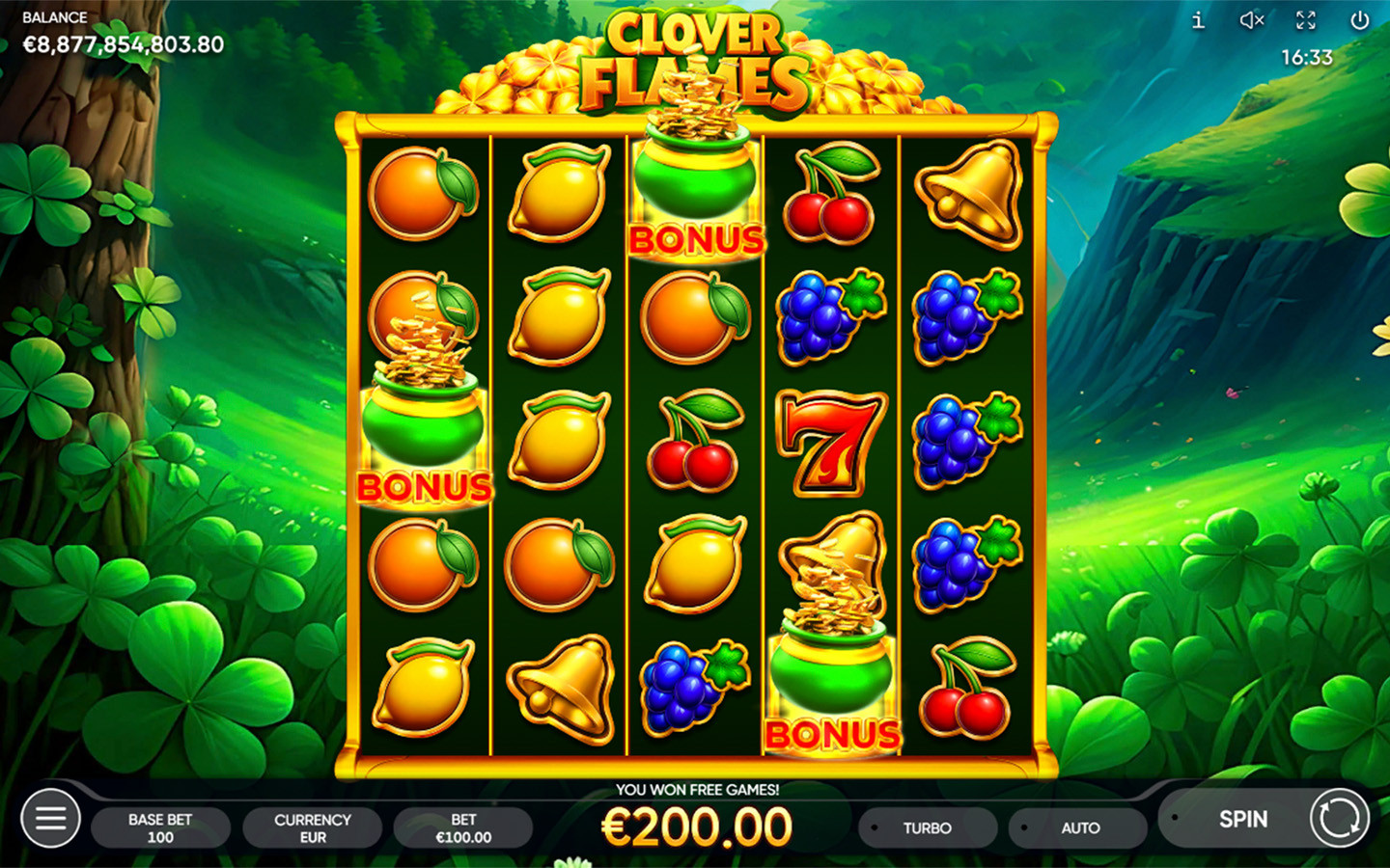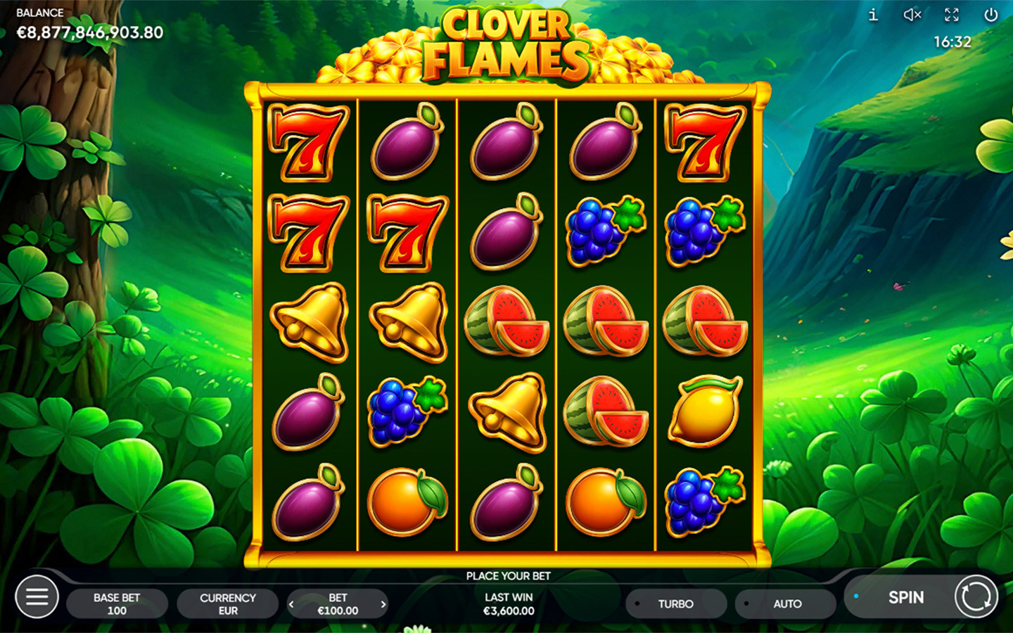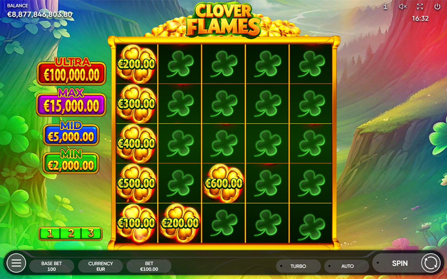 6 or more Golden Clover symbols trigger the Clover Time Bonus Game. During the Bonus Game, the main game reels turn into a 5x5 grid with a reel containing Golden Clover symbols and empty cells. Golden Clover symbols remain in place once they appear on the reels and may provide the players with a Jackpot up to 150x total bets. The Bonus Game starts with 3 attempts; each Golden Clover that appears on the reels reverts the number of attempts to its initial value. Player gets an extra prize – Ultra Jackpot (1000x total bets) when collecting 25 Golden Clover symbols during the Bonus Game.