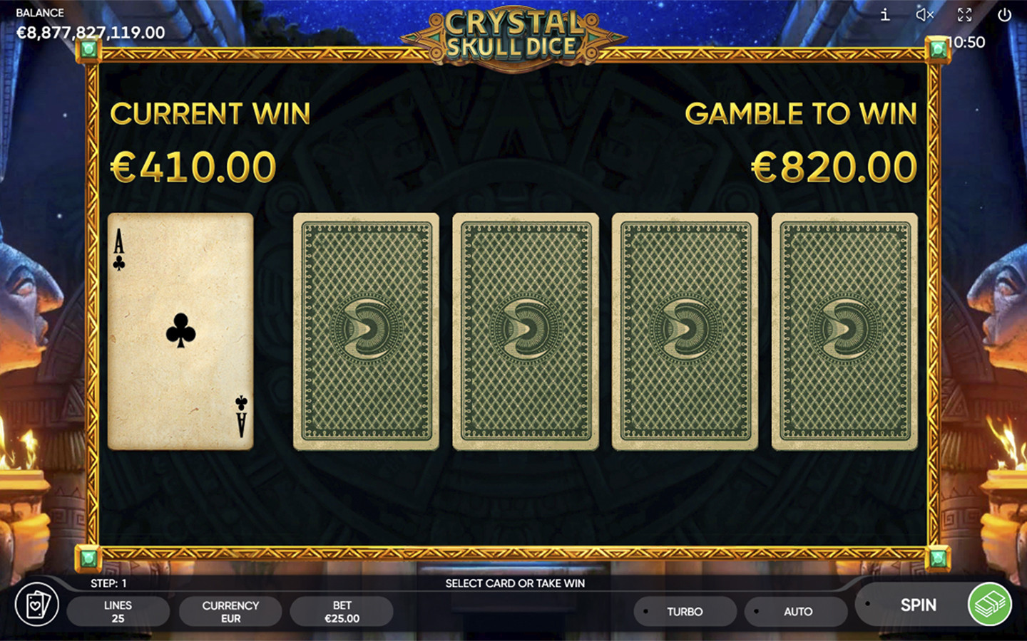 Crystal Skull Dice is a 5-reel, 3-row dice slot with 25 paylines. In this slot, players will watch luxurious golden dice fall on the marble reels, adding a sense of nobility to the gameplay. Besides golden dice, players will encounter a remarkable crystal skull, which acts as a Wild symbol, appearing on reels 2, 3, and 4, and expanding vertically to connect winning combinations. The Wild completes combinations with the Scatter and doesn’t expand in these combinations substituting for only one Scatter per reel.