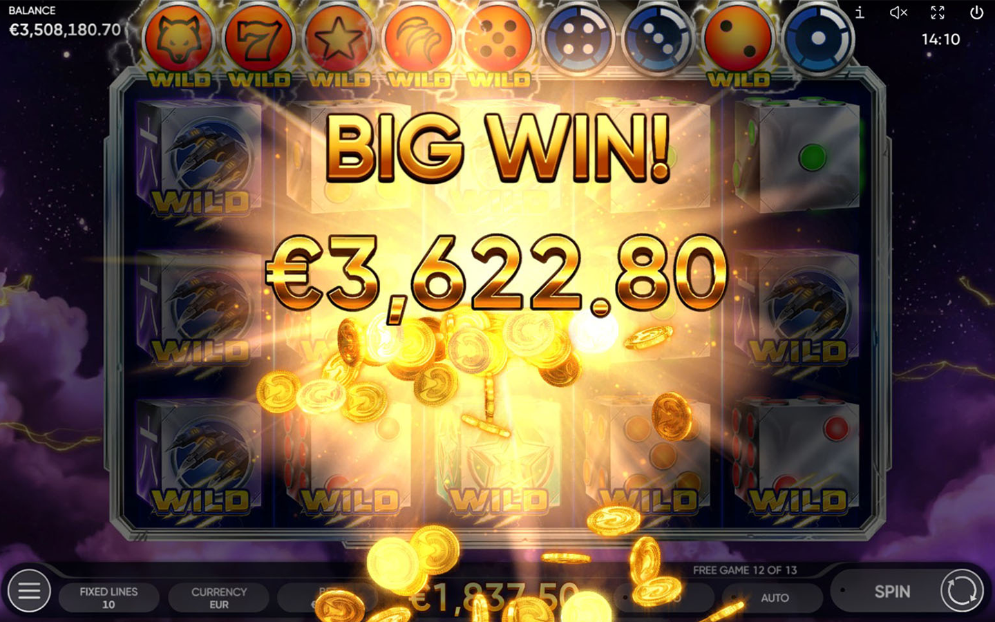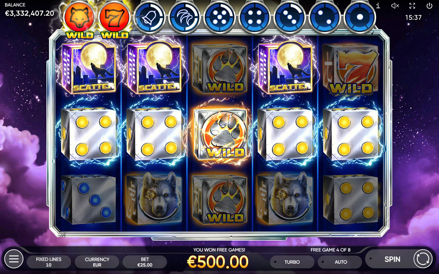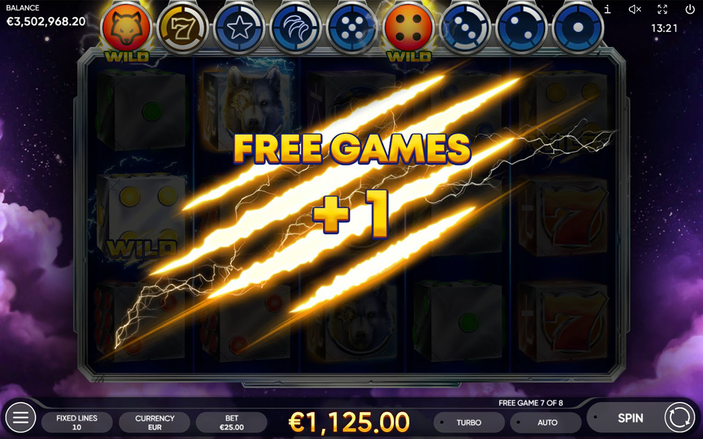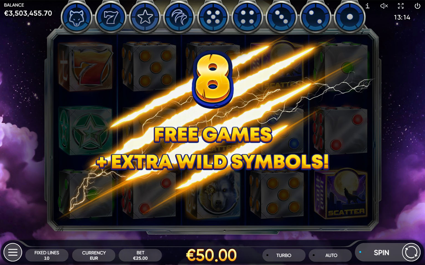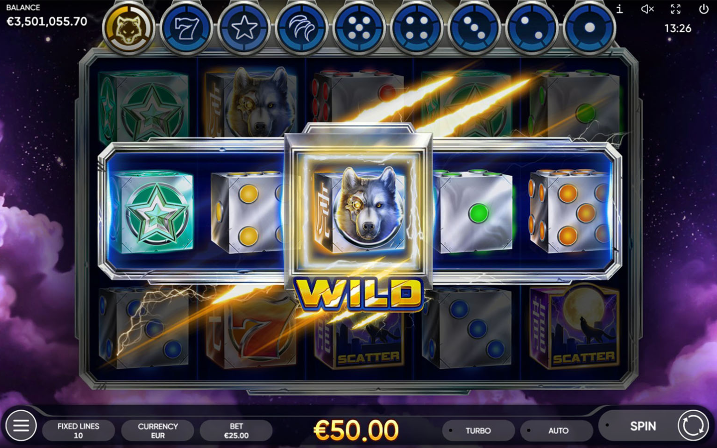 This futuristic game has 5 reels and 3 rows with 10 fixed paylines. The Wild wolf's paw print substitutes for all symbols, except for the Scatter. The Wild appears on reels 2, 3, and 4 in both the main game and Free Games. 3 or more Scatter symbols trigger 8 Free Games with Extra Wild symbols. In the beginning, a random symbol is selected and endowed with the Wild capacity – the capacity to substitute for all symbols, except Scatter. During the feature, any symbols, except Scatter symbols, may get the Wild capacity. Every activated accumulator triggers 1 more Free Game with the same bets and lines as the initial game. Once activated, the accumulator turns off. Free Games can be won again during the feature.