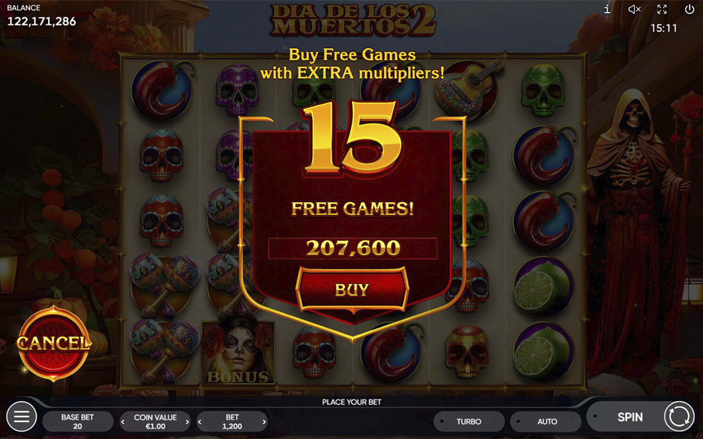 This time, Dia De Los Muertos 2 is back as a cascading slot with 6 reels and 5 rows with Scatter payouts. Instead of catching a winning combination on certain paylines, players can now score wins simply by catching 8 or more symbols of the same kind located anywhere on the reels. Of course, this leads to those symbols getting paid and disappearing, causing the cascading reels to activate and bring new symbols onto the screen. Besides the cascading reels enabling multiple winning combinations to strike in a single spin, the slot also offers Free Spins. Getting 4 or more Catrina Bonus symbols results in 15 Free Games with extra multipliers from x2 up to x500! The Multipliers are applied only when a player is hitting a winning combination from the Paytable. They get activated at the end of the winning cascade, producing no further tumbling. During Free Games, all the activated Multipliers are accumulated to create the total multiplier. If the winning cascade ends with no multipliers on the reels, the total multiplier remains as is and doesn’t apply.