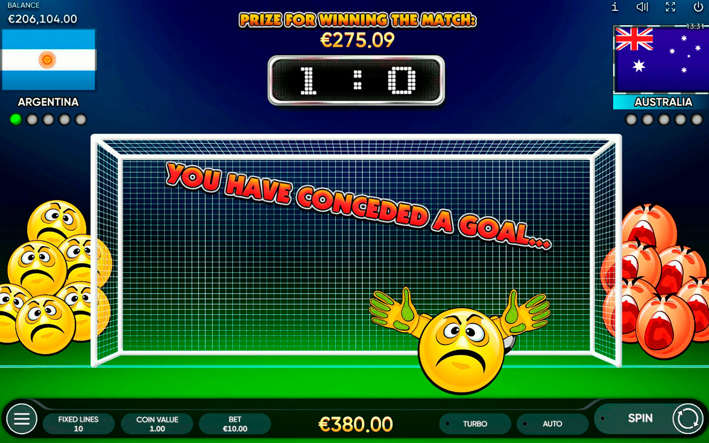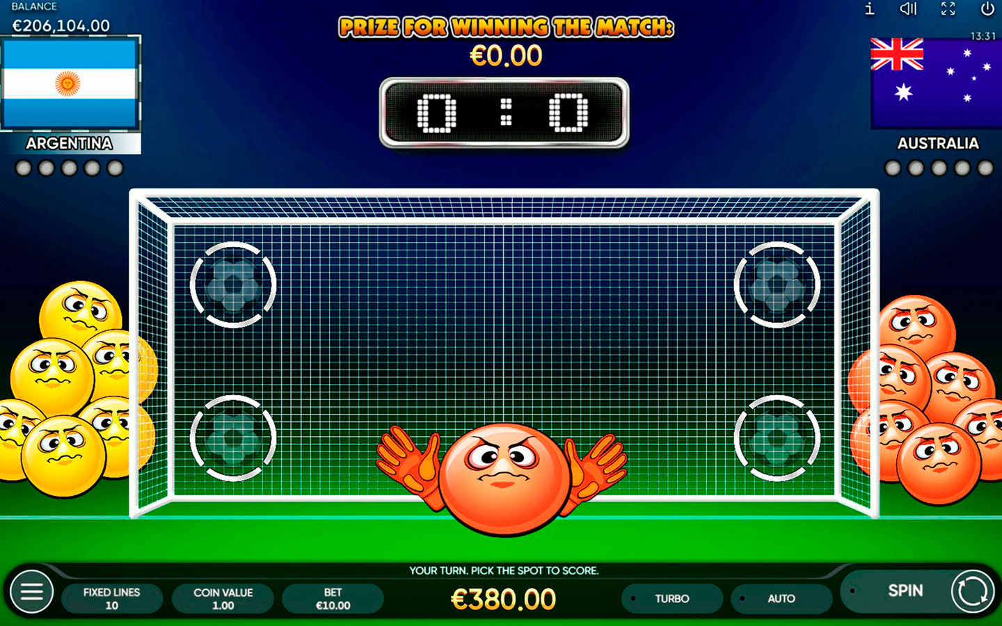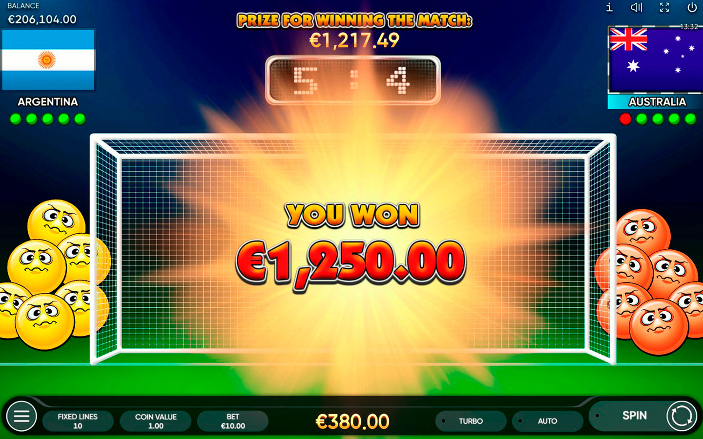 Endorphina's newest kicking slot has 5 reels, 3 rows, and 10 fixed paylines. You'll find a footballer's shoe, red and yellow cards, timers, and some football emojis among the symbols on the reels. The football cup that acts as the WILD, substitutes for all symbols, except flags and scattered symbols. One or more WILD symbols appearing as a substitute symbol in a winning combination doubles the win.