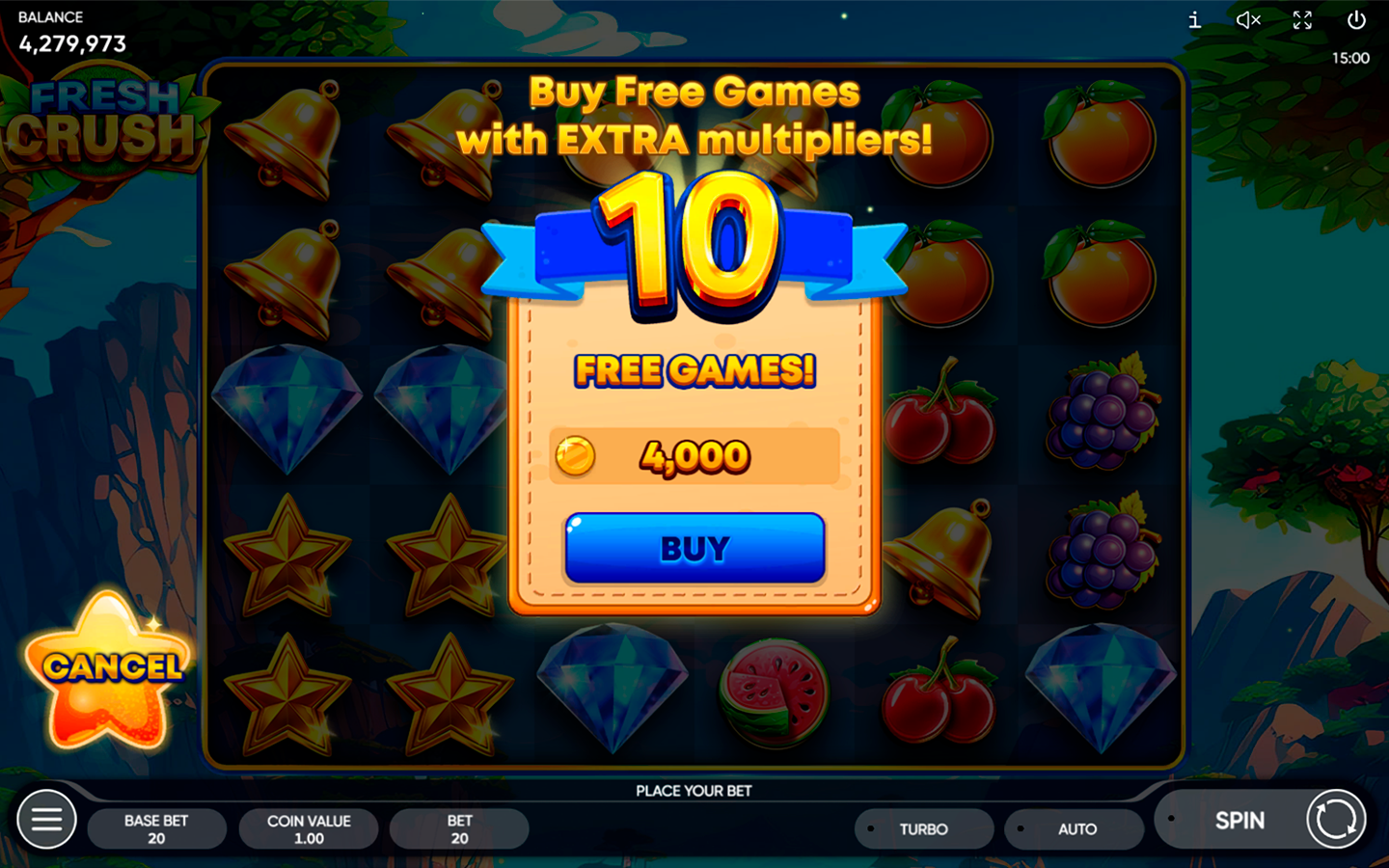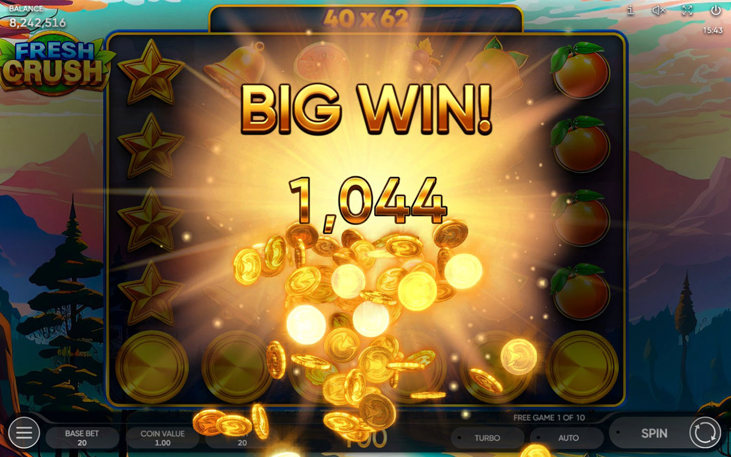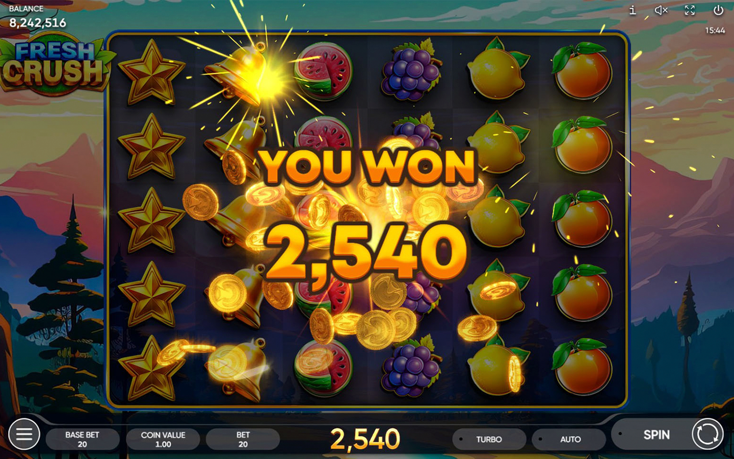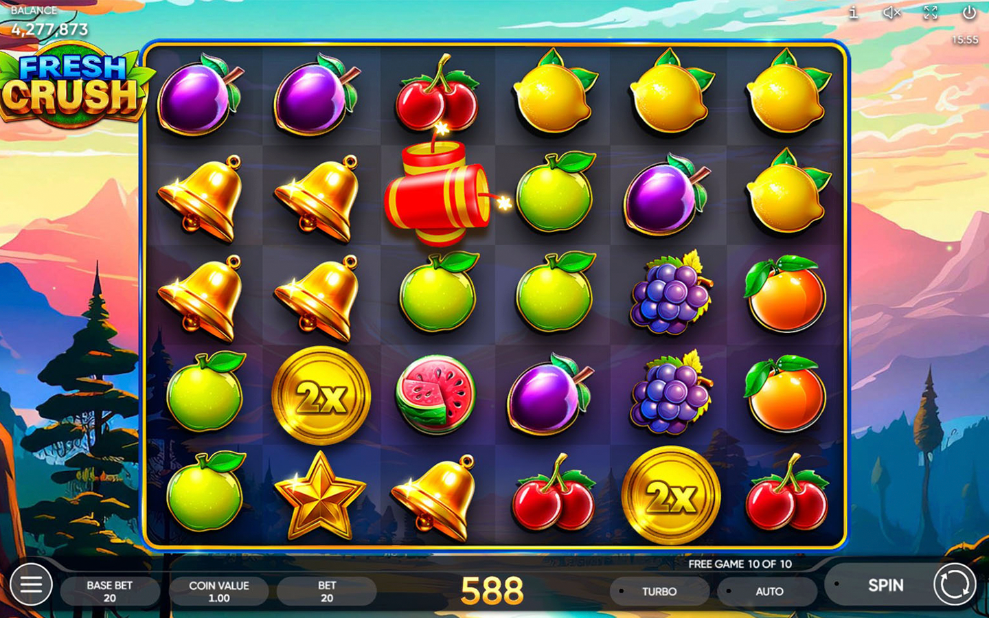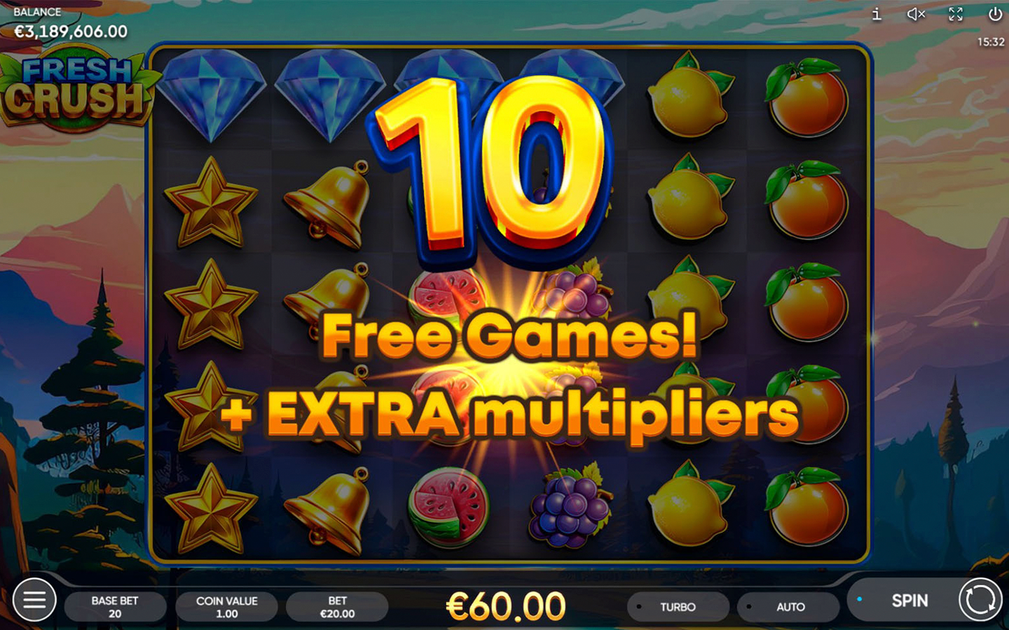 Feel the gentle embrace of nature with our new 6-reel, 5-row slot - Fresh Crush! Embark on a hiking adventure through steep mountain trails and thick forests scattered with some of nature's finest fruits! Climb the tallest mountains, enjoy the scenery as the sky changes from peaceful blue to majestic gold and find the real diamond before the sun sets!