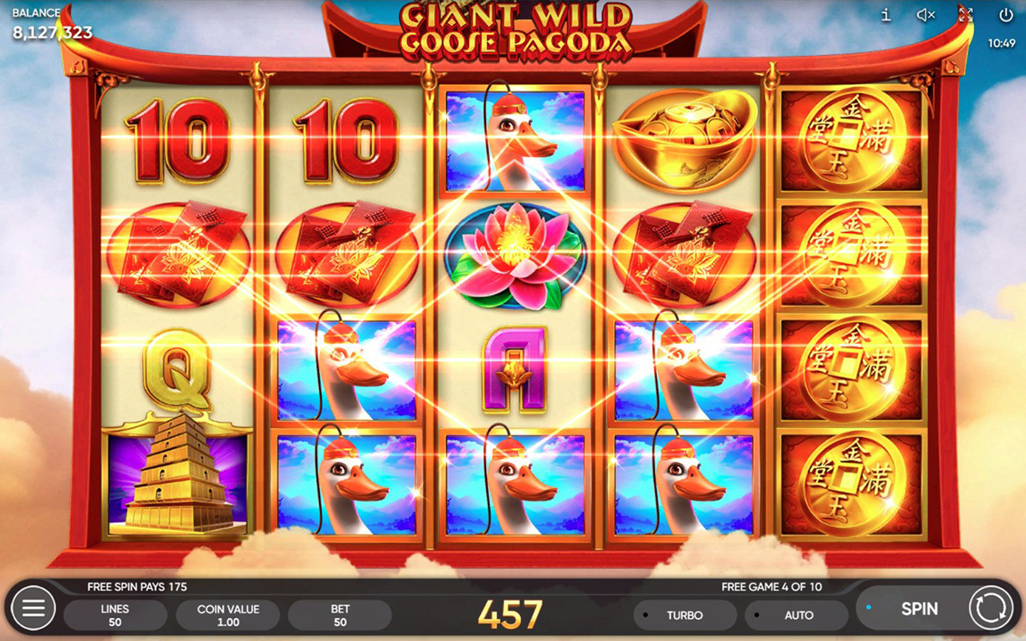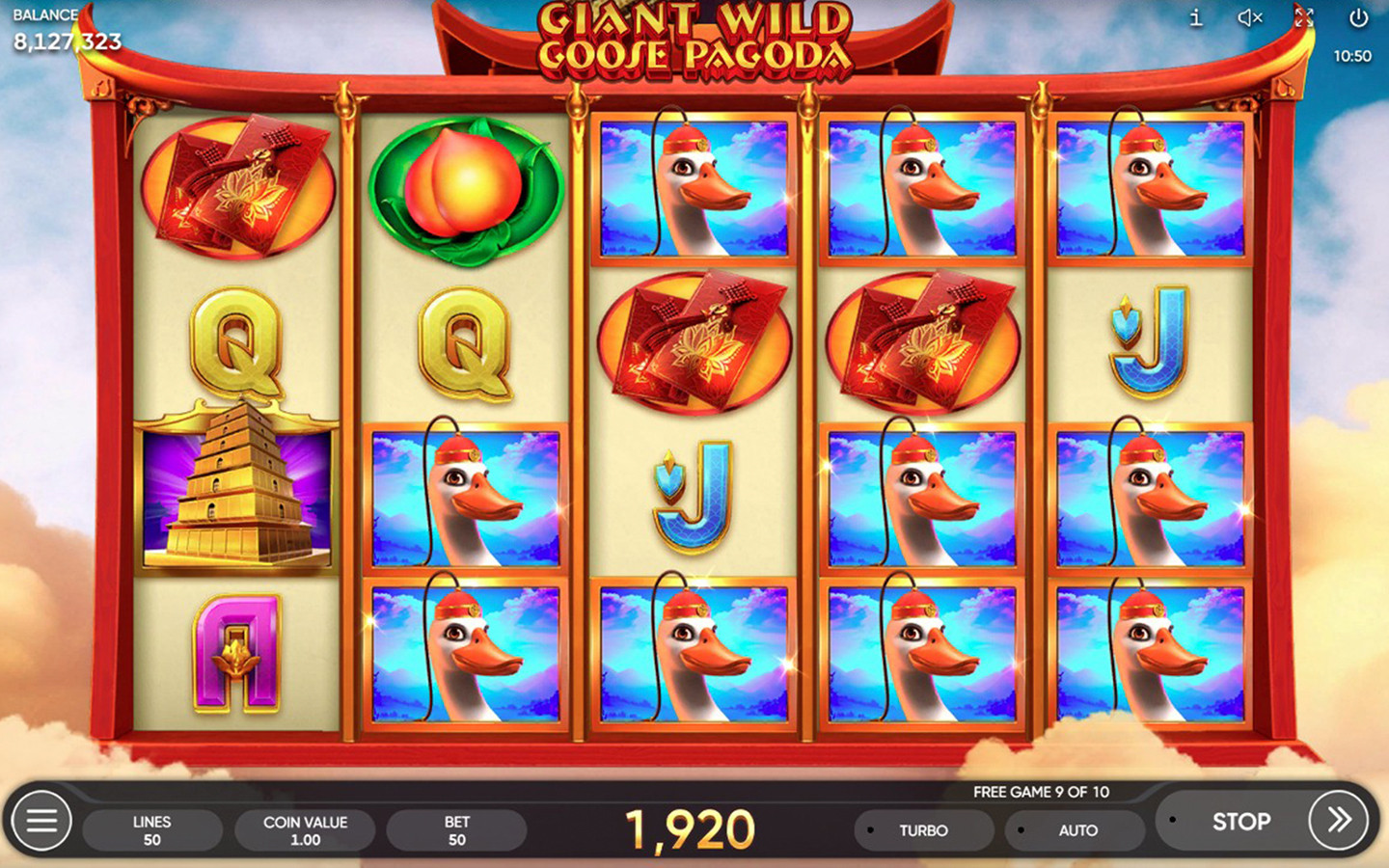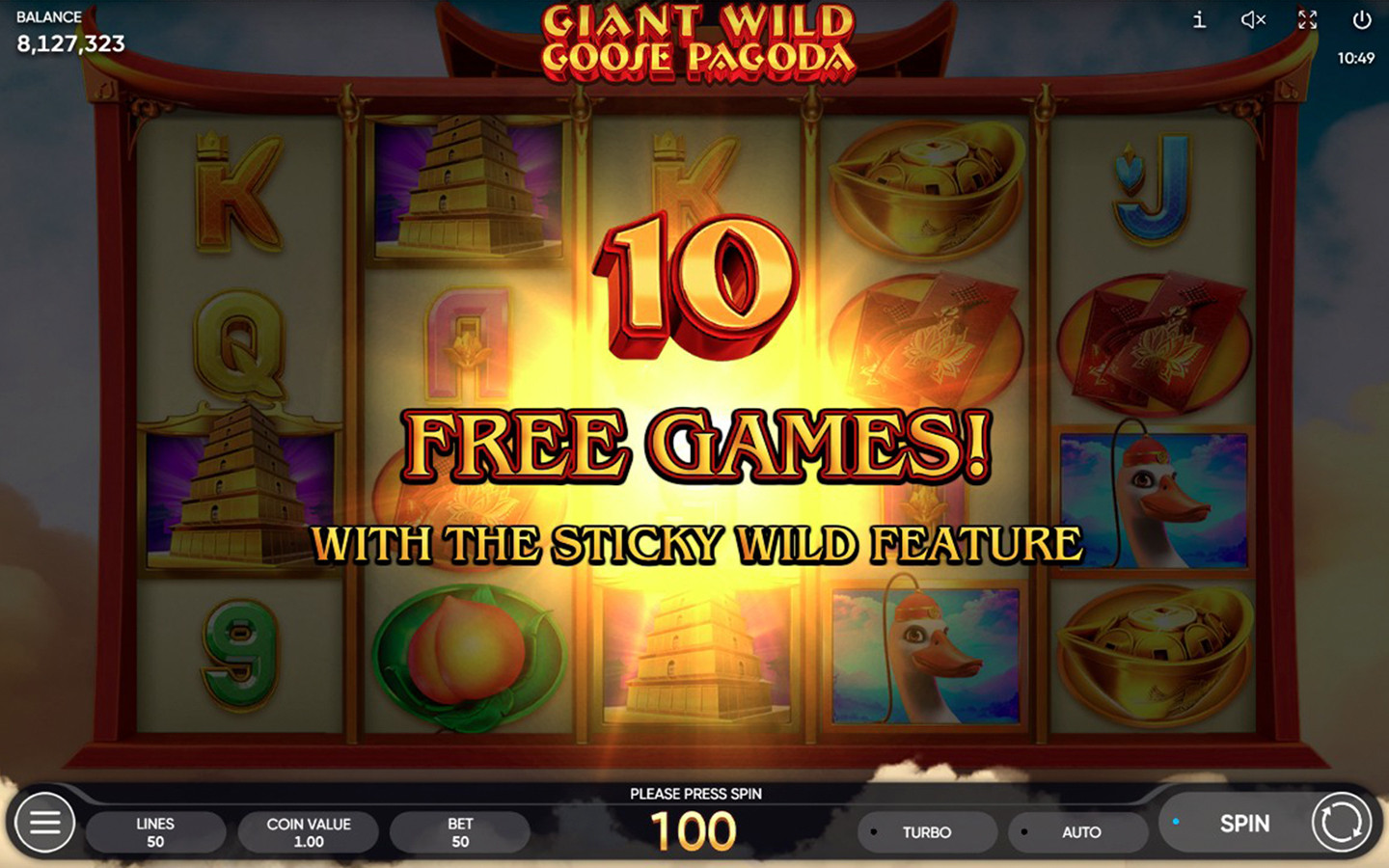 Giant Wild Goose Pagoda is a 5-reel, 4-row game with 50 paylines. The Pagoda symbol is the scatter and counts on any position on the reels, appearing on reels 1, 2 & 3 only. Not only that, 3 scatters on the reels will trigger 10 Free Games with a Sticky Wild feature. A scatter covered by a Wild (landing behind a Wild) still counts and can complete a combination with other scatter symbols should there be any. The 3 scatter symbols during the feature will trigger 5 more Free Games with the same bets and lines as the initial game!