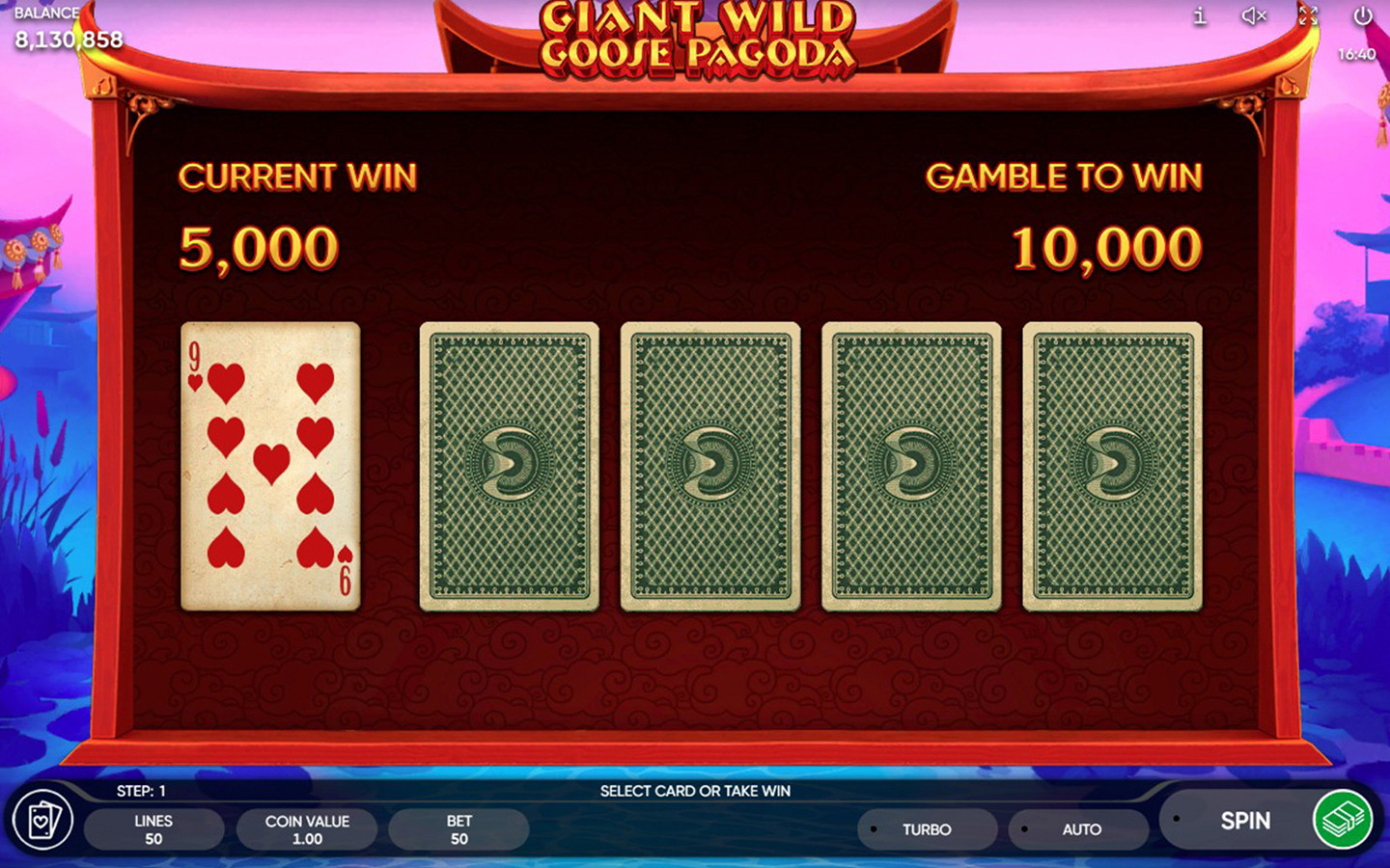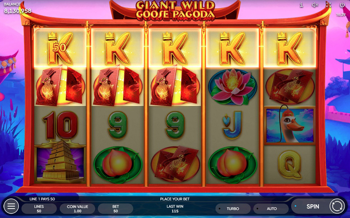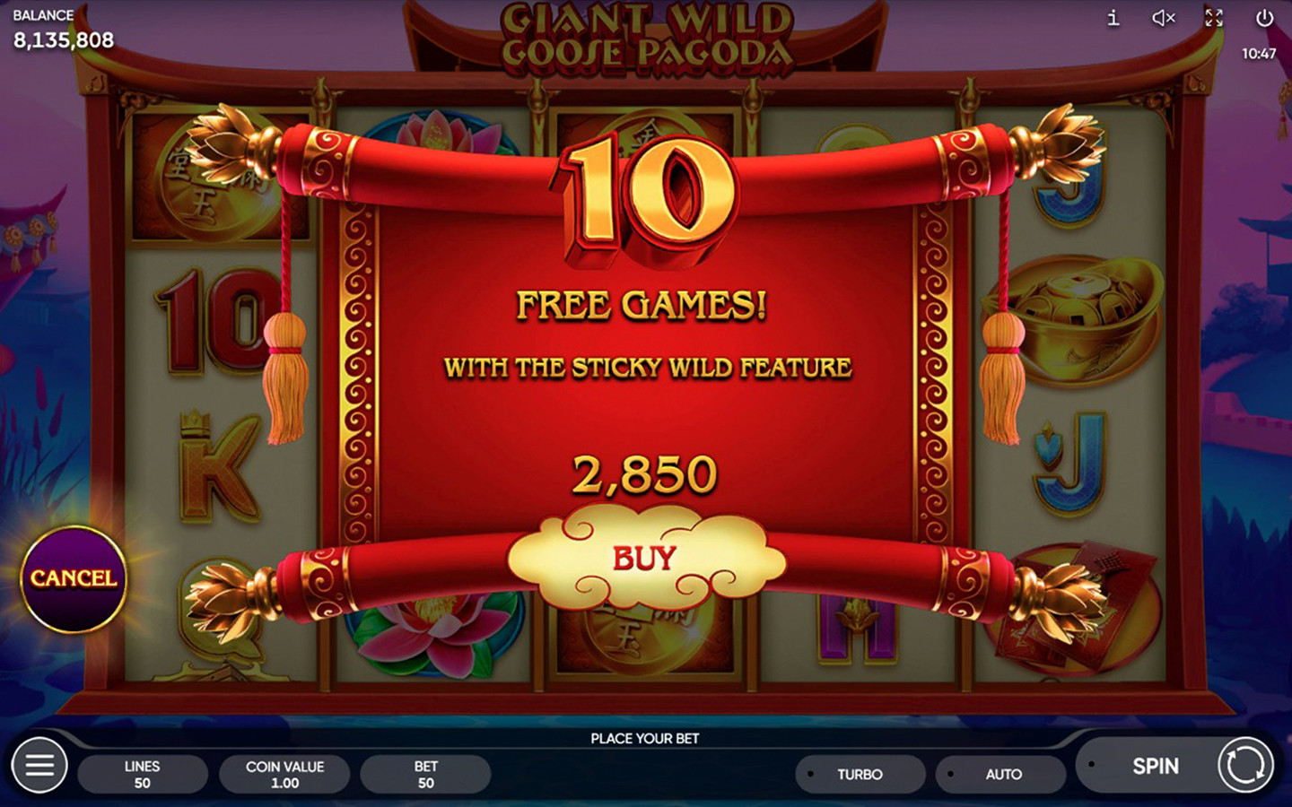 Giant Wild Goose Pagoda is a 5-reel, 4-row game with 50 paylines. The Pagoda symbol is the scatter and counts on any position on the reels, appearing on reels 1, 2 & 3 only. Not only that, 3 scatters on the reels will trigger 10 Free Games with a Sticky Wild feature. A scatter covered by a Wild (landing behind a Wild) still counts and can complete a combination with other scatter symbols should there be any. The 3 scatter symbols during the feature will trigger 5 more Free Games with the same bets and lines as the initial game!