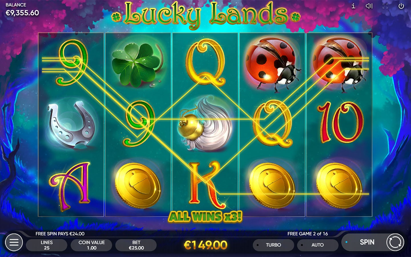 3 scatters on the reels will trigger free games. When the feature is triggered, you can choose the number of free games 23, 16, 10, 5 and their associated multiplier (X2, X3, X5, X10). The feature can be triggered again during the free games and the player gets to choose the land he wants to visit as well as how he would like to spend his additional free spins. Play Lucky Lands slot by Endorphina now and may the luck be with you!