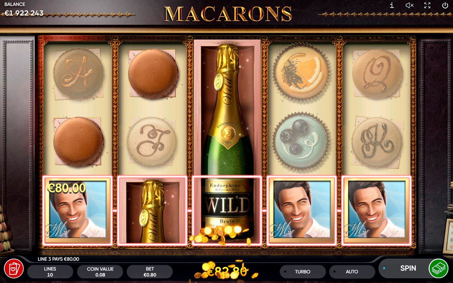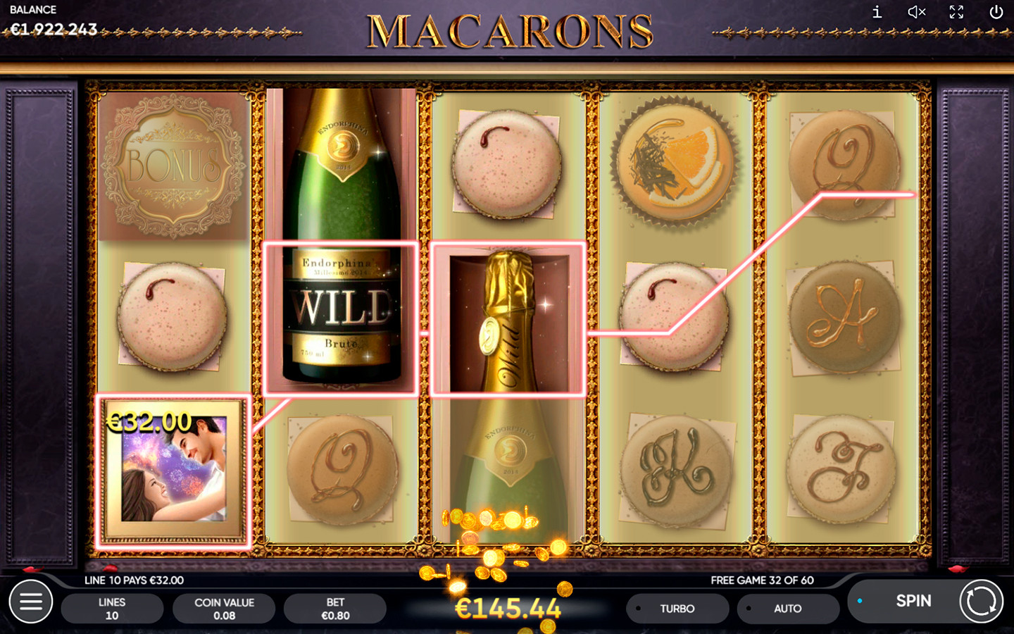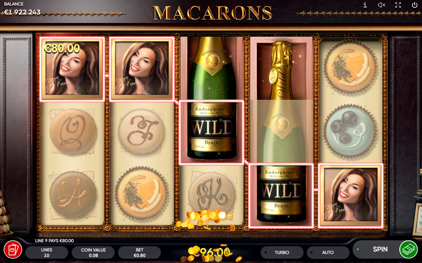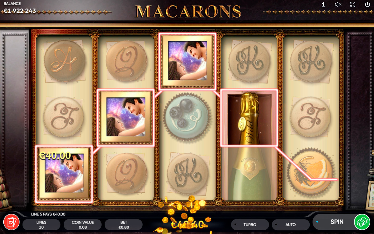 There is a romance in the air with Macarons slot by Endorphina! This 5-reel 10-line casino game takes you to France. A macaron is a French sweet meringue-based confection that has become popular all over the world just like this video slot. While playing, you will be enjoying a bottle of the finest champagne as a Wild Symbol and if you are lucky enough there is a Bonus symbol, the engagement ring, awaiting. Is she going to say yes?
