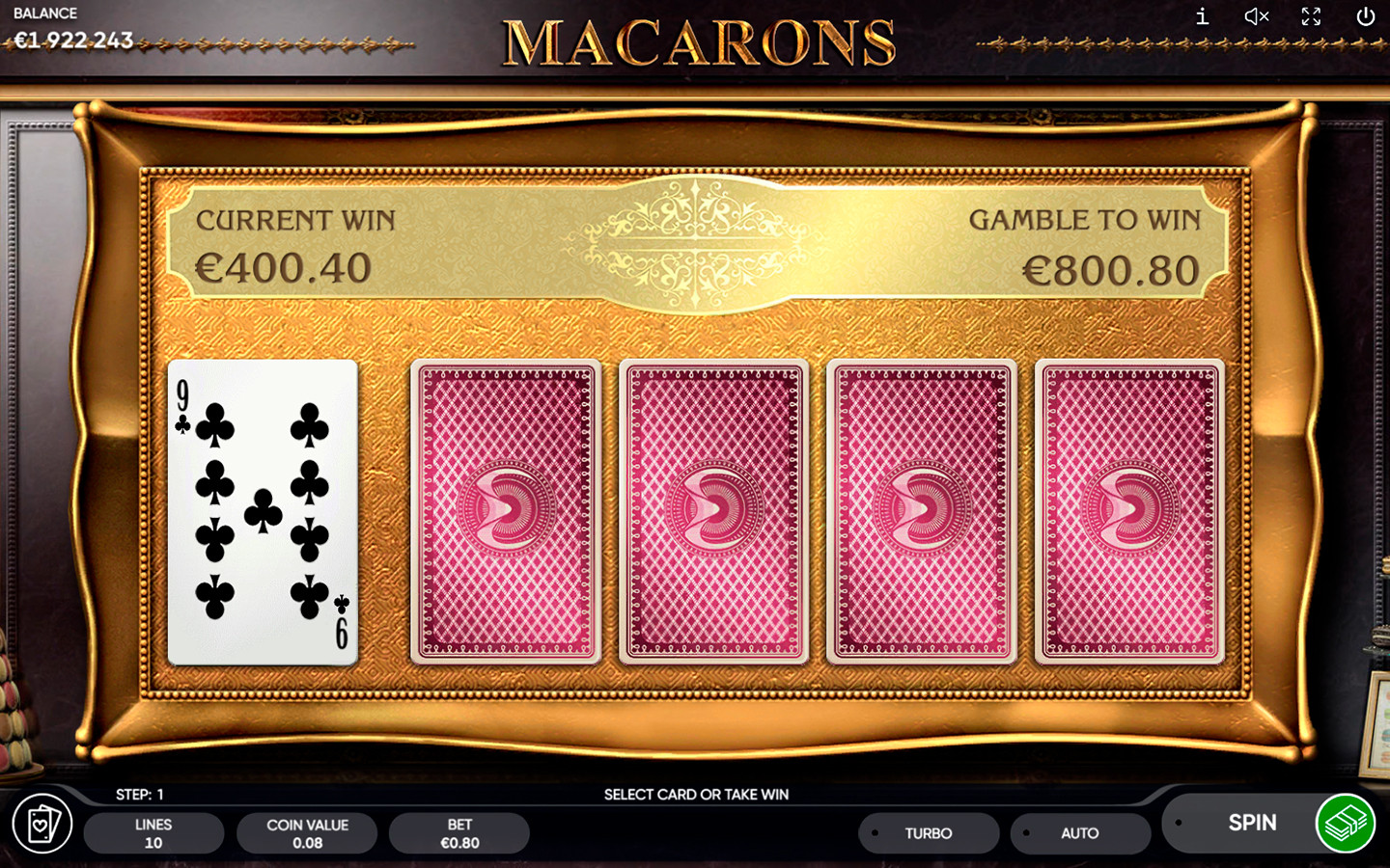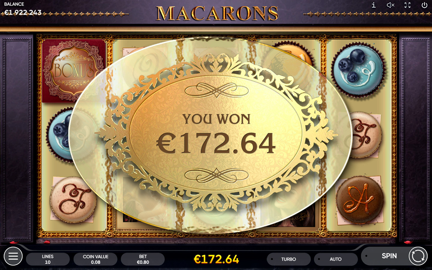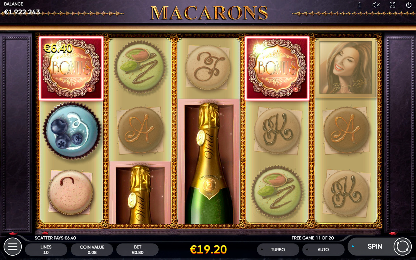 Macarons game has many free spins waiting to be won. If you get 3 Bonus symbols, the box with an engagement ring opens and the player wins 20 free games and all free games wins are multiplied by 4. Free games can be retriggered.