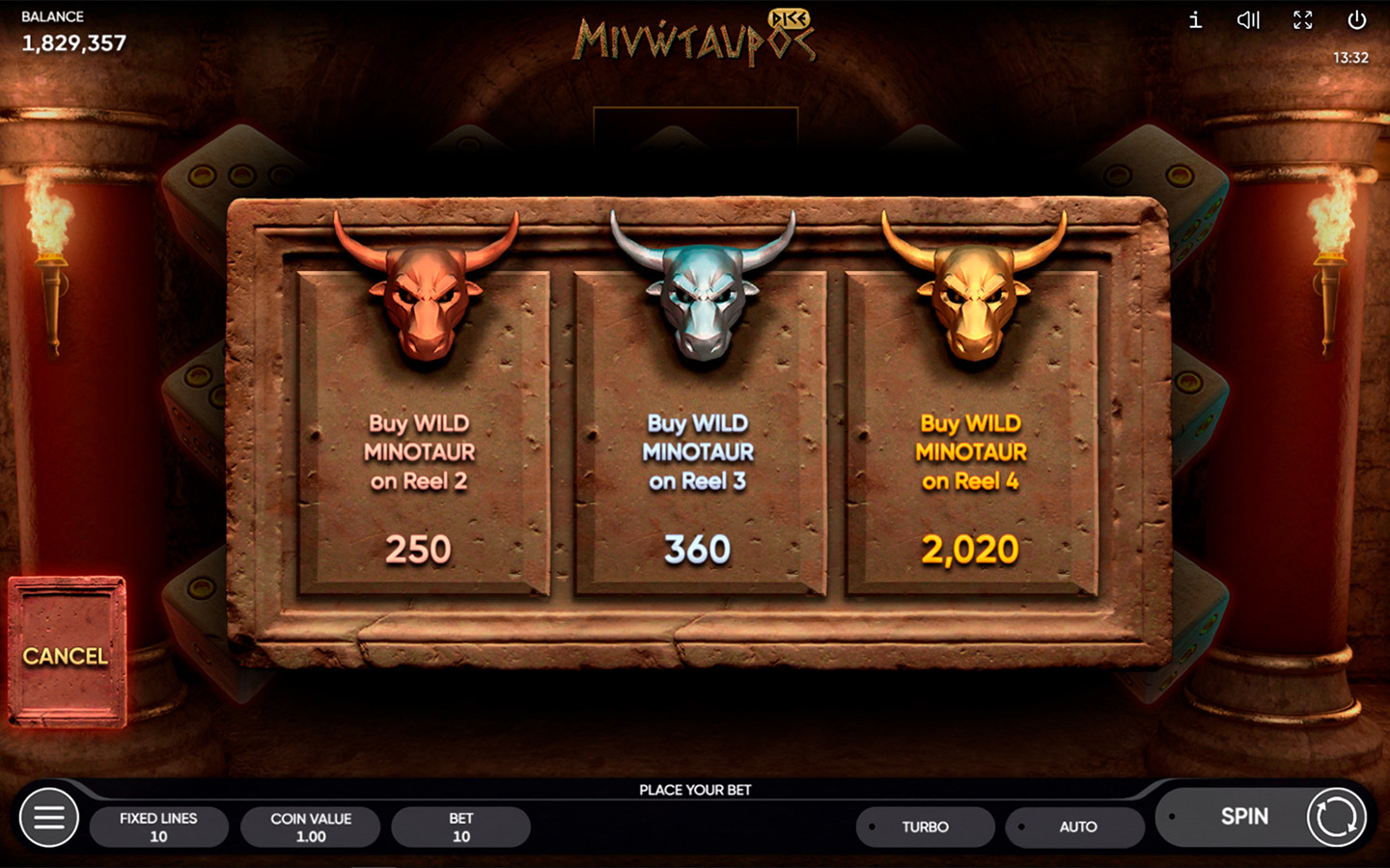 Minotaur substitutes for any symbol. It covers the whole reel and activates the re-spin feature. During the feature, the win line payout is multiplied according to the awarded Multiplier value (which is infinite). The Multiplier value increases with every spin that does not trigger a winning line.