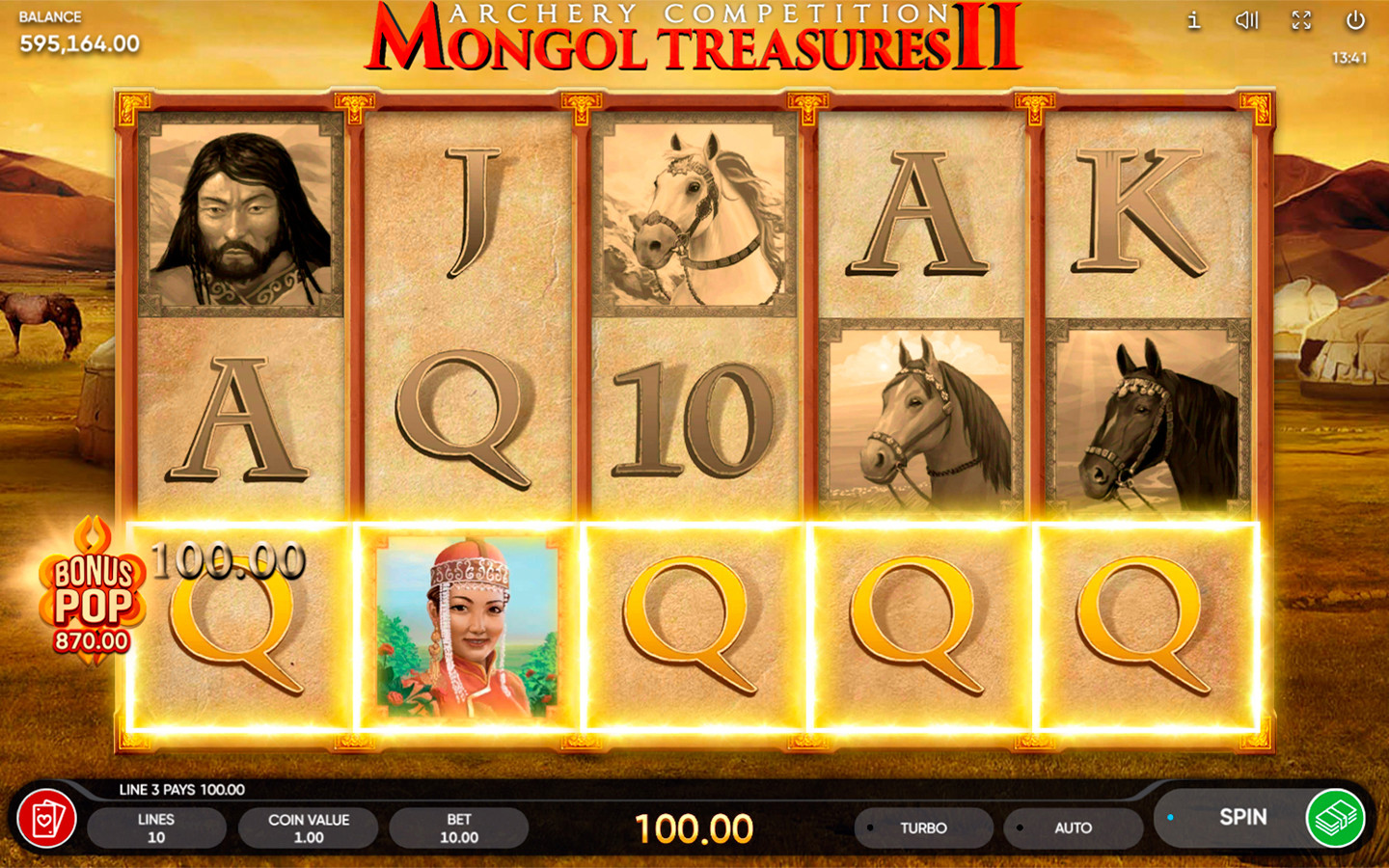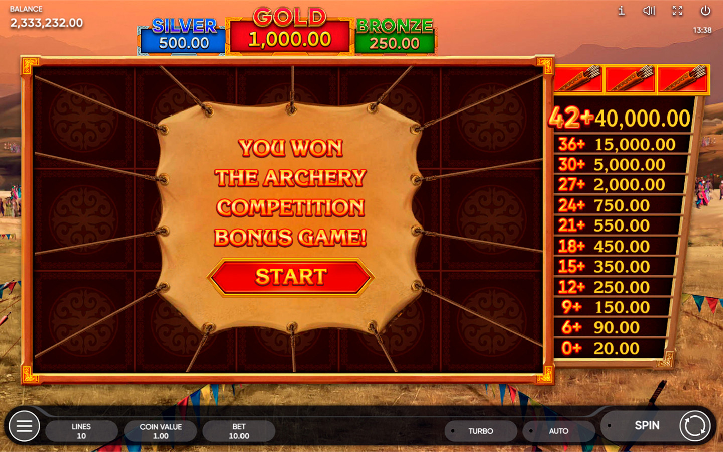 Enter life in real Mongolia, with wildlands stretching as far as one's eyes can see. In this new slot, you'll come face to face with the nation's largest roaring empire only to be put to the greatest test - to see if you can stay focused, properly aim, and shoot the handmade arrow straight to the target in a daring archery competition. Will you be able to impress the warriors and leaders of this tribe to indulge in their riches? Compete for glory and the ultimate prize to become part of this honorable native tribe.