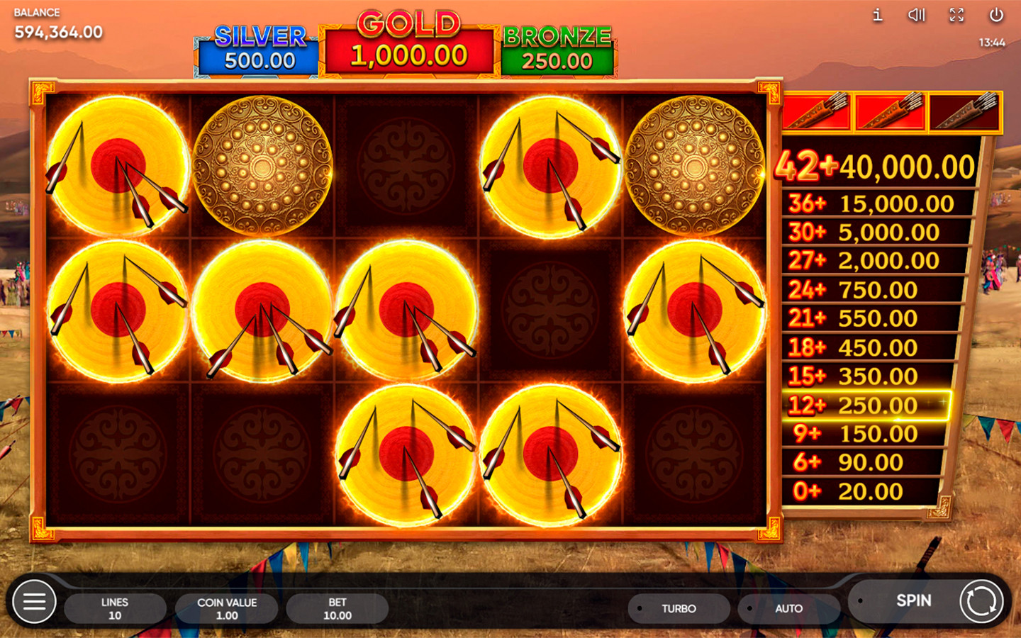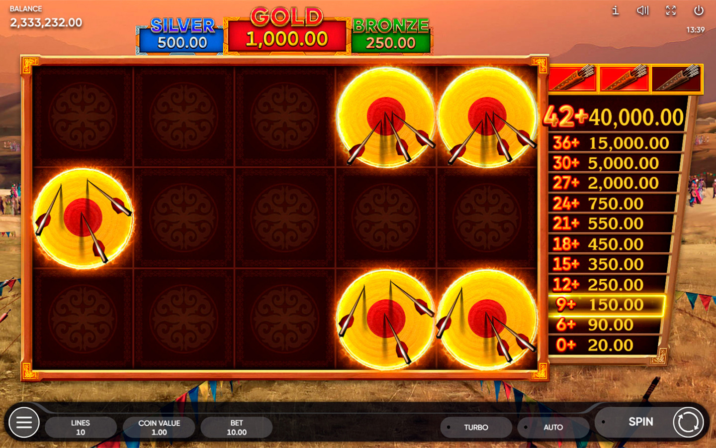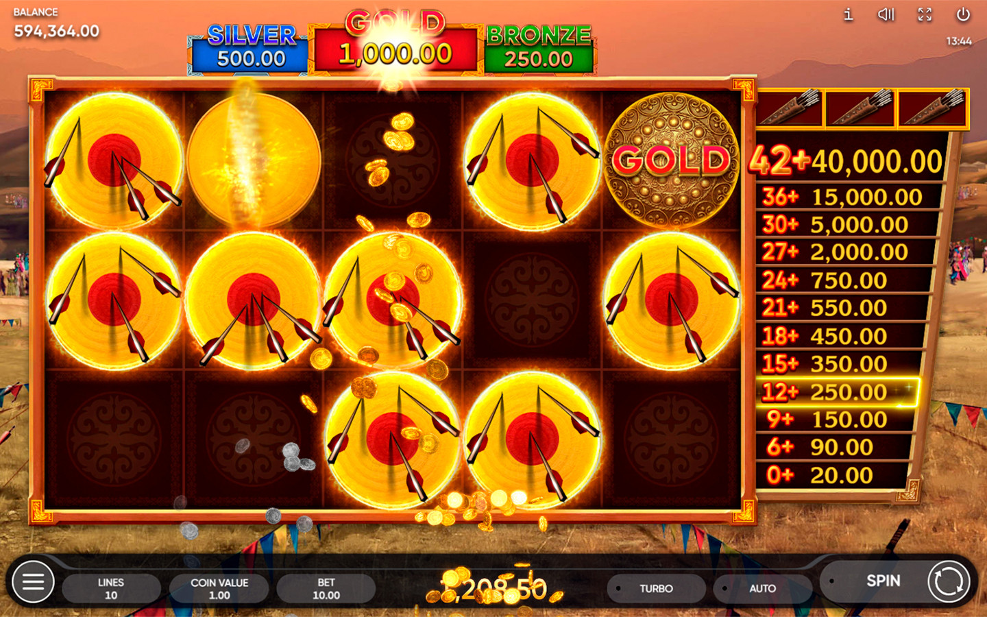 This new game has 5 reels and 3 rows with 10 paylines. The beautiful girl acts as WILD. SCATTER symbols count at any position on the reels. 3, 4 or 5 SCATTER symbols trigger the Archery Competition Bonus Game with the multipliers – x1, x2, x4 respectively. During the Bonus Game, the base game reels turn into a grid of 5x3 positions with a reel containing shield, target, and Mongolian traditional pattern symbols on each. Target and shield symbols landing on the reels remain in place, while pattern symbols keep the reels spinning. A shield landing on the reels is guaranteed to reward you with an additional prize that will be revealed at the end of the Bonus Game. Each shield hides a multiplier (from 25x to 100x total bets). A target landing on the reels heralds the Archery Competition that starts once the reels stop. Every arrow scoring the bull’s eye increases your wins. Target hits are counted at the end of the bonus game. The reward for hitting the targets might be up to 4000x total bets and depends directly on the total bet as well as on the number of arrows that scored the bull’s eye. The Bonus Game starts with 3 attempts. One or more target and/or shield symbols landing on the reels revert the number of attempts to its initial value.