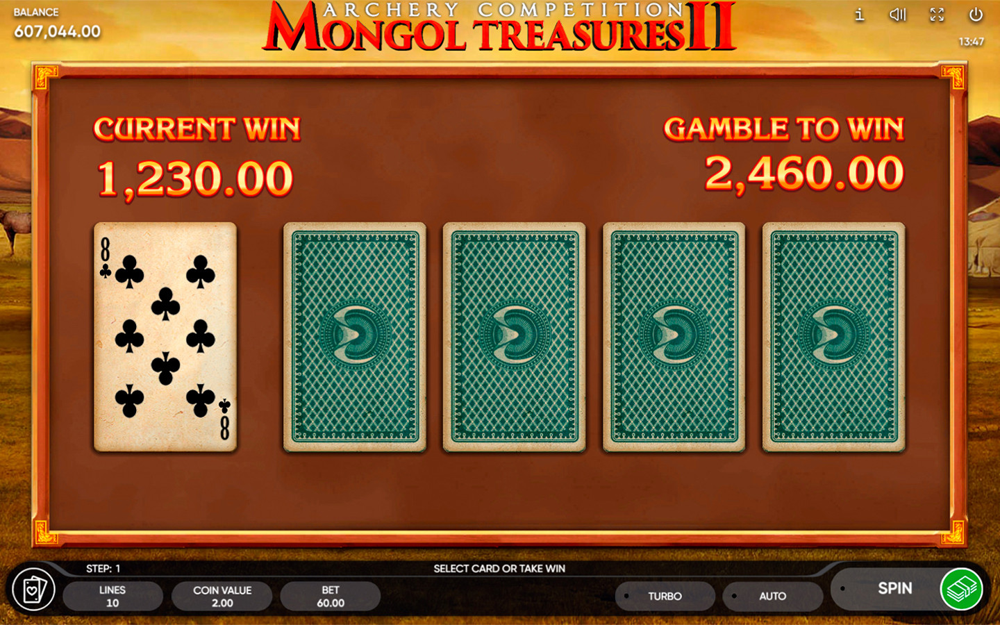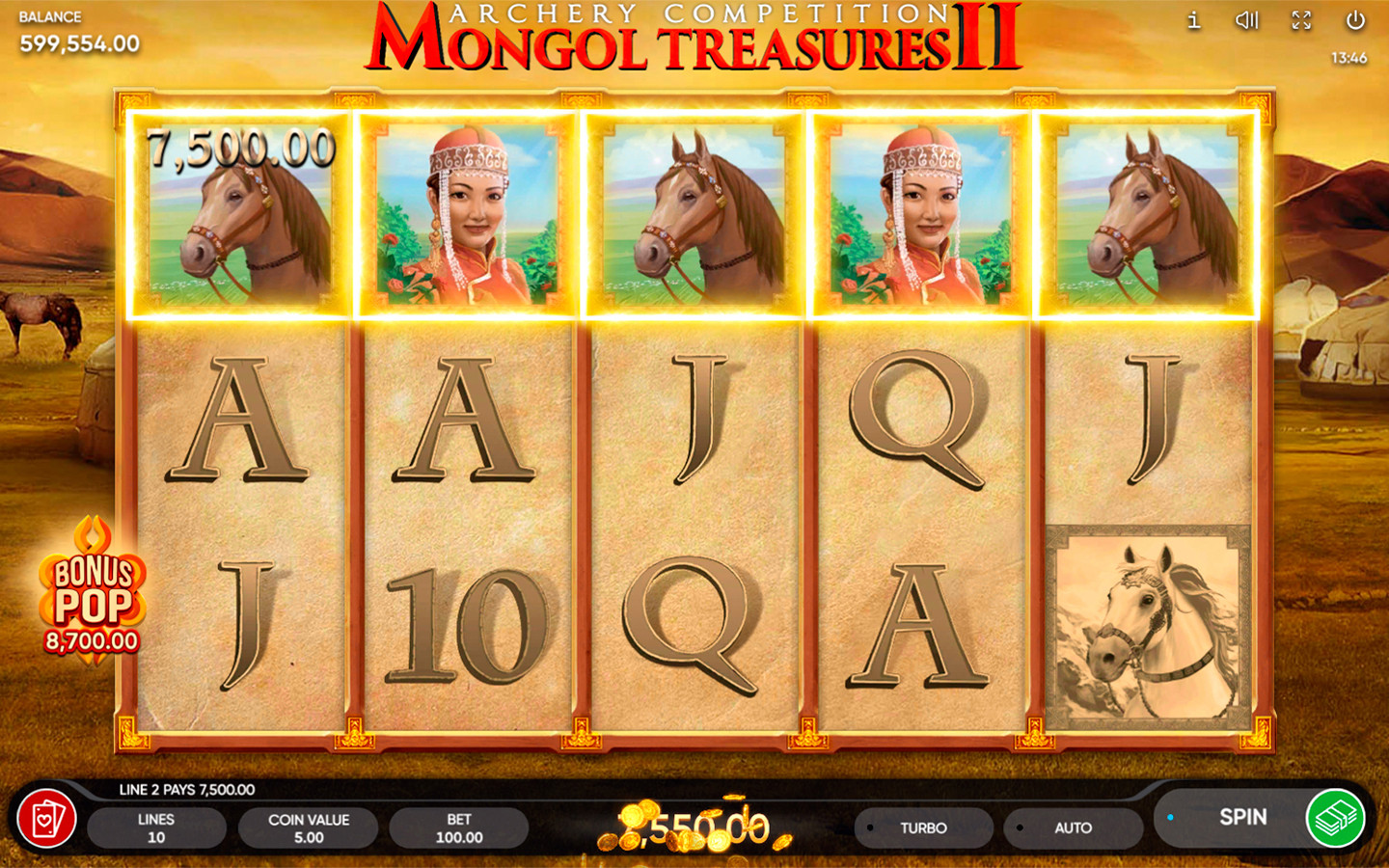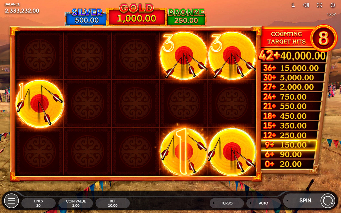 This new game has 5 reels and 3 rows with 10 paylines. The beautiful girl acts as WILD. SCATTER symbols count at any position on the reels. 3, 4 or 5 SCATTER symbols trigger the Archery Competition Bonus Game with the multipliers – x1, x2, x4 respectively. During the Bonus Game, the base game reels turn into a grid of 5x3 positions with a reel containing shield, target, and Mongolian traditional pattern symbols on each. Target and shield symbols landing on the reels remain in place, while pattern symbols keep the reels spinning. A shield landing on the reels is guaranteed to reward you with an additional prize that will be revealed at the end of the Bonus Game. Each shield hides a multiplier (from 25x to 100x total bets). A target landing on the reels heralds the Archery Competition that starts once the reels stop. Every arrow scoring the bull’s eye increases your wins. Target hits are counted at the end of the bonus game. The reward for hitting the targets might be up to 4000x total bets and depends directly on the total bet as well as on the number of arrows that scored the bull’s eye. The Bonus Game starts with 3 attempts. One or more target and/or shield symbols landing on the reels revert the number of attempts to its initial value.