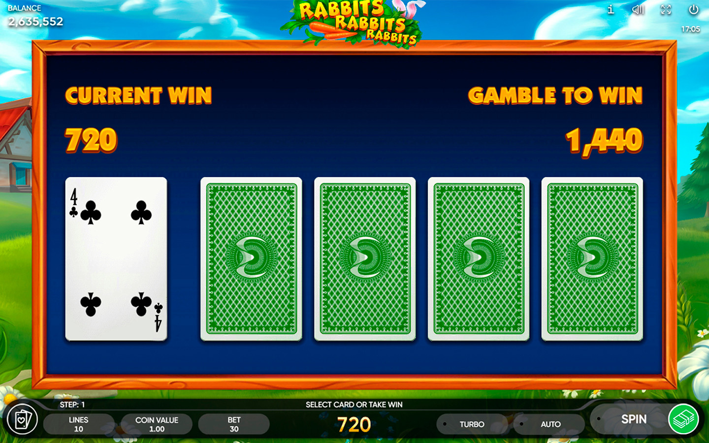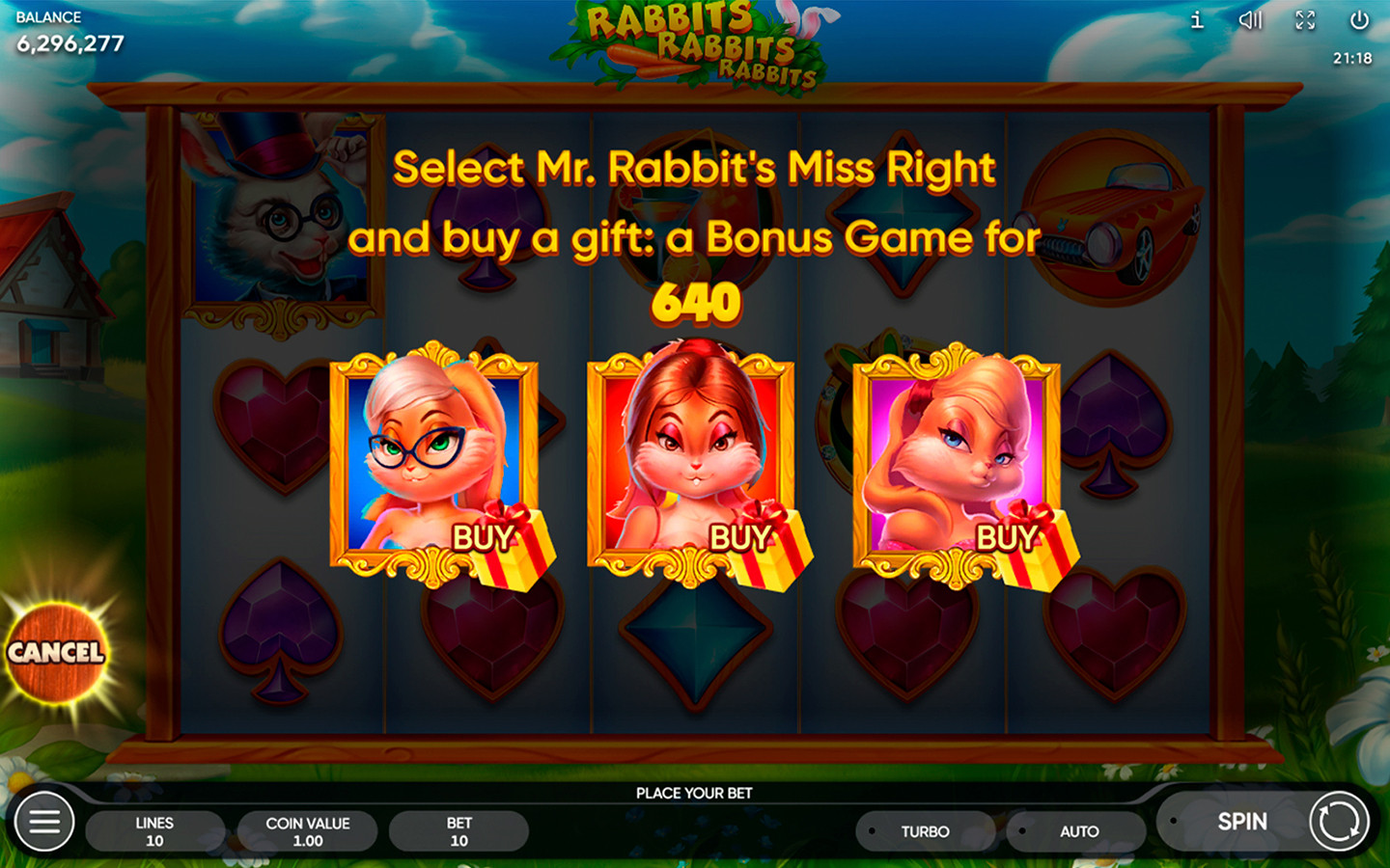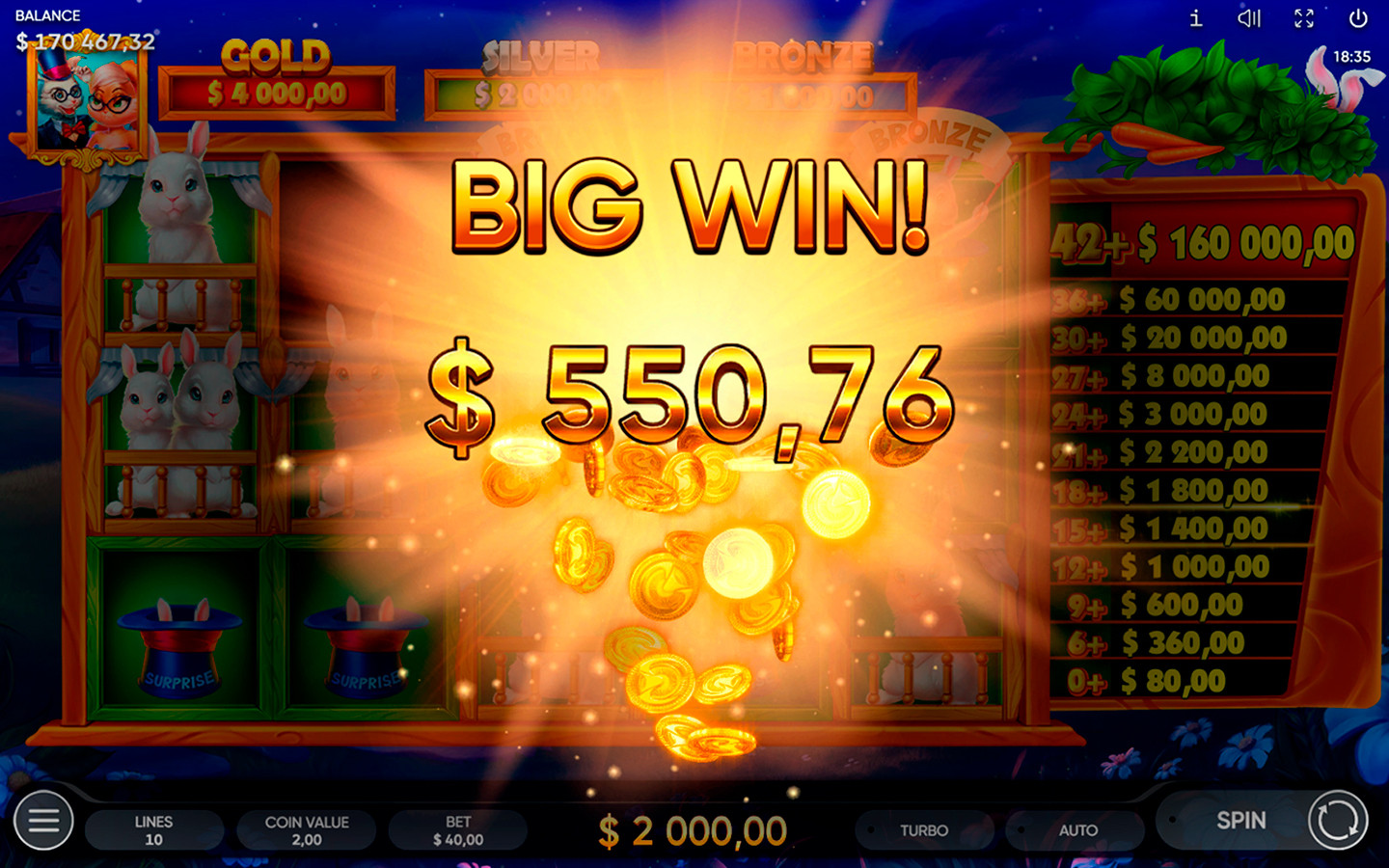 When you see baby rabbits, even ones hidden in the hat, you'll be greatly rewarded. The more baby rabbits on the reels, the greater your wins! The reward for baby rabbits depends directly on the numbers and the total bet: from 2x to 4000x total bets!