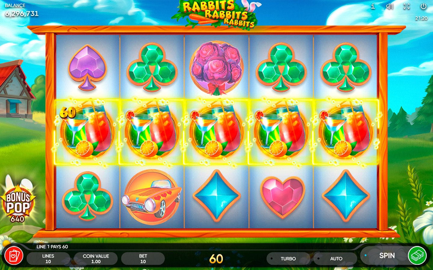 This is a new 5-reel, 3-row game with 10 paylines. Among the symbols on the reels, you'll find rabbits, gemstones, classy cocktails, an old car, and a bouquet of cabbage. The Wild acts as a dollar sign with bunny ears!