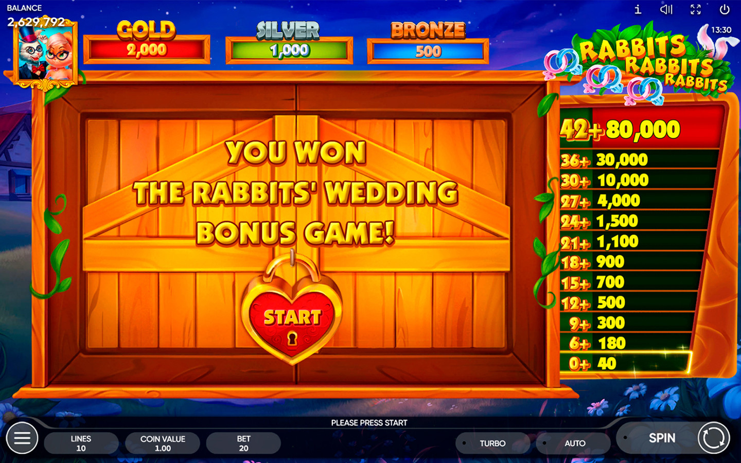 This cute rabbit-themed slot comes with an epic Bonus Game. When Mr. Rabbit gets engaged, his gorgeous rabbit fiance will appear on reels 1 and 5 and the Rabbit's Wedding Bonus Game is triggered! And when we say wedding, we mean TONS of baby rabbits! During the Bonus game, the main game reels will turn into a grid of 5x3 positions with a reel containing Baby Beds with one or multiple baby rabbits, magician hats, or hearts within them on each position. Heart symbols keep the reels spinning, and the Bed and Hat symbols landing on the reels remain in place. Also, the Hat symbol landing on the reels will guarantee an additional special prize for players! Each Hat hides a baby rabbit that will give you an award – up to 100x total bets!
