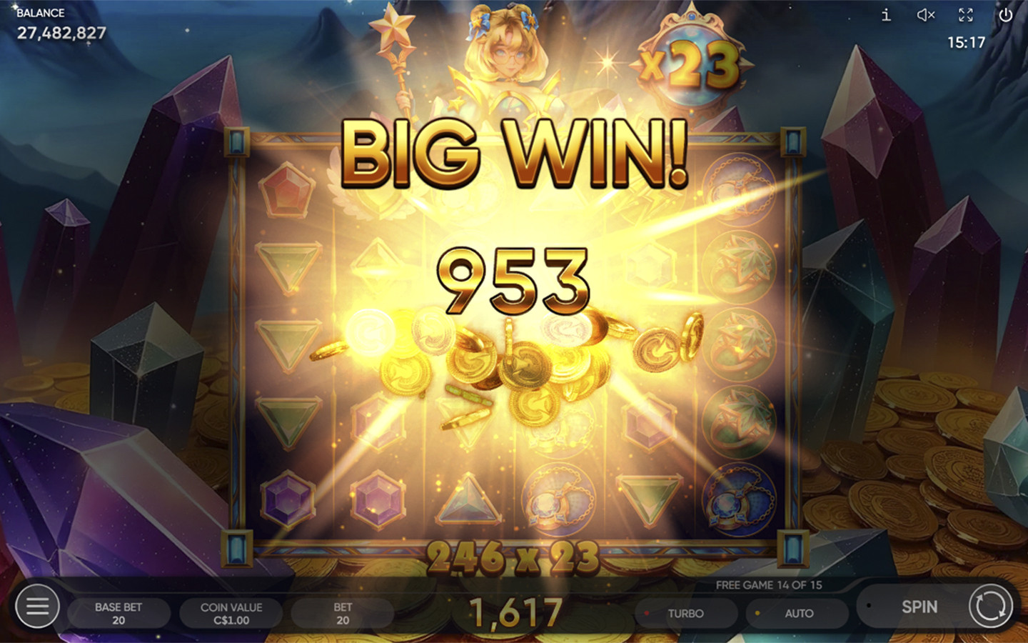 Watch as radiant gems and cosmic spells swirl across the reels, revealing hidden treasures in our new 6-reel, 5-row cascading reel slot with Scatter payouts. When the magical Starshine Girl Bonus symbol appears on the reels, the Lucky Time Feature may awaken, filling the screen with cascading crystals. The Bonus might trigger the Free Games as per normal. 4 or more Starshine Girl Bonus symbols trigger 15 Free Games with Multipliers Accumulator. This means that during Free Games, all the activated Multipliers are accumulated to create the total multi-plier. 3 or more Bonus symbols during Free Games trigger 5 more Free Games with the same bet as the initial bet. When a Star appears on the reels, it destroys all the enchanted objects on the reels, producing further tumbling.