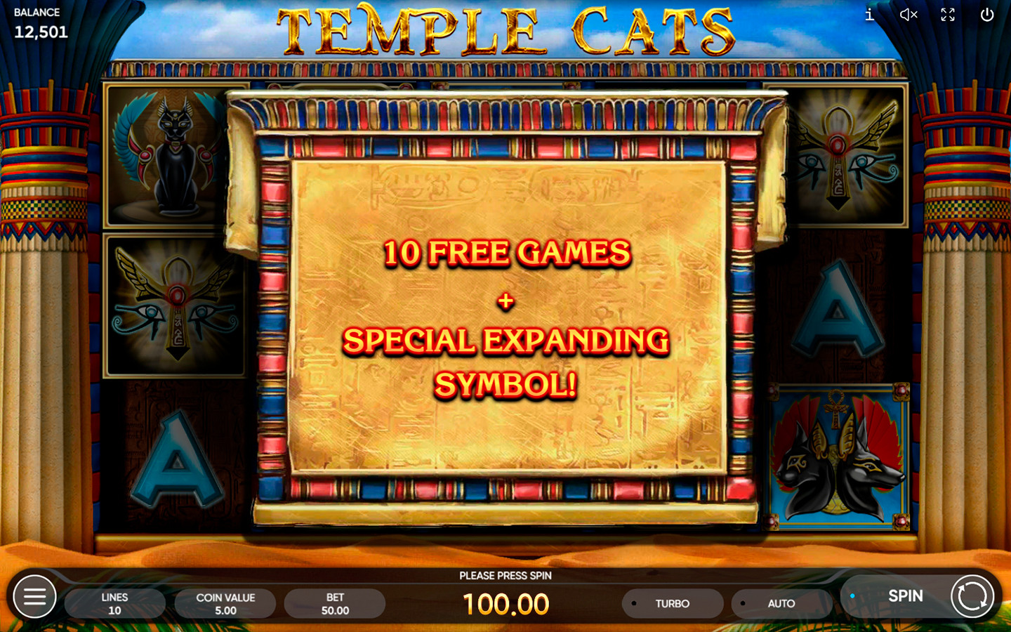 As a Scatter, the game is featuring a symbol with two sacred animals, a cat, and Annubis. 3 or more Scatter symbols on reels trigger 10 free games with a special expanding symbol.