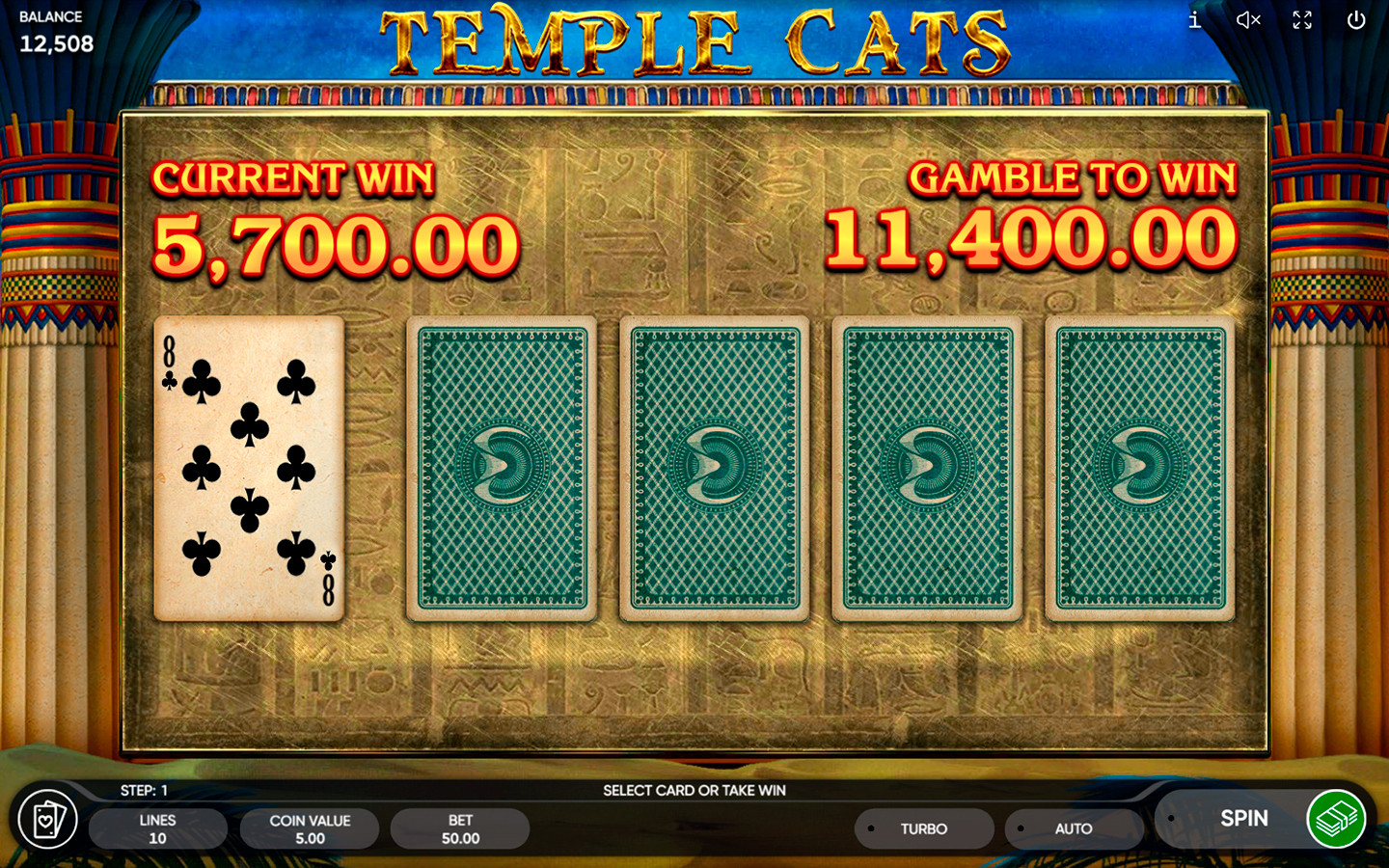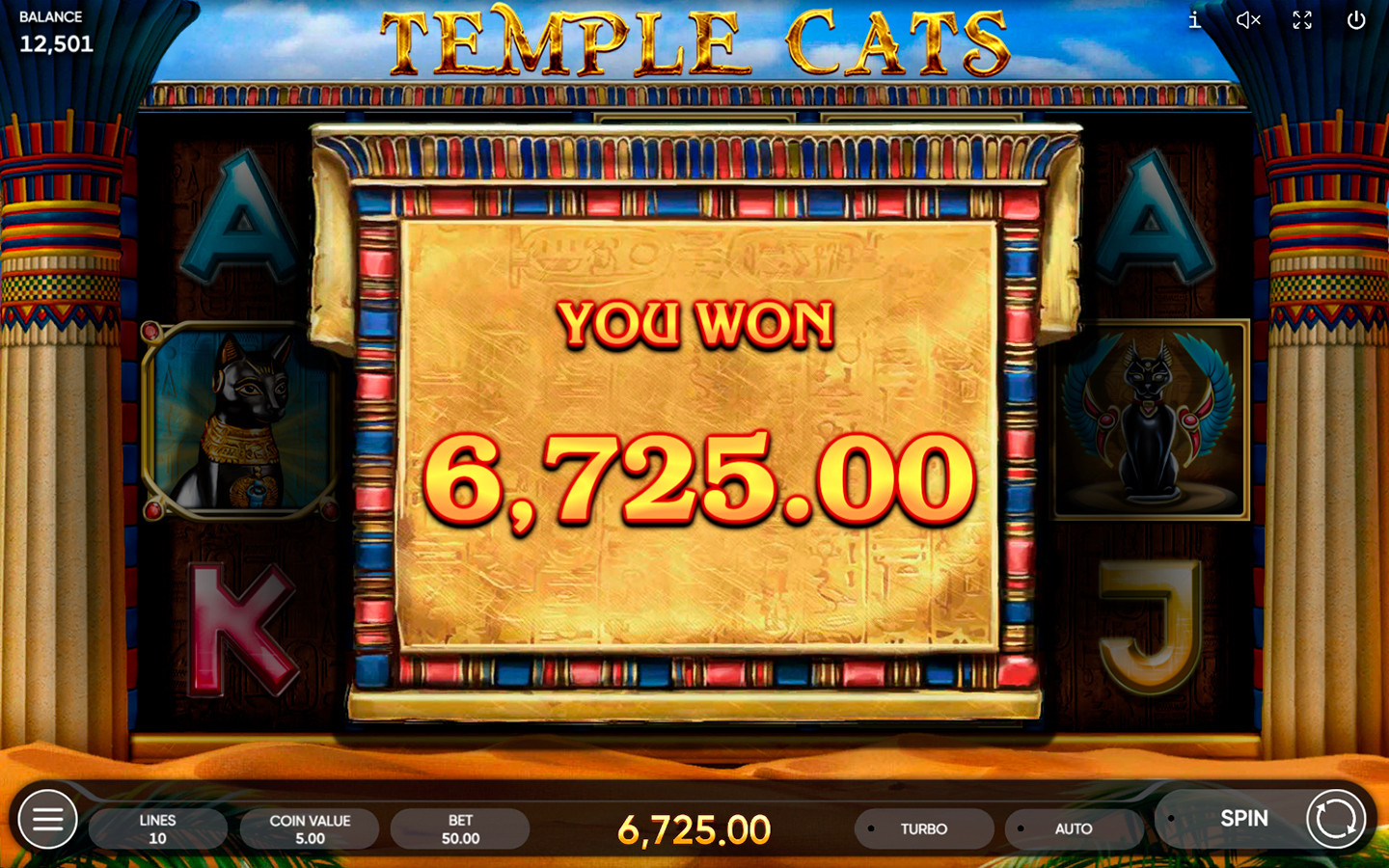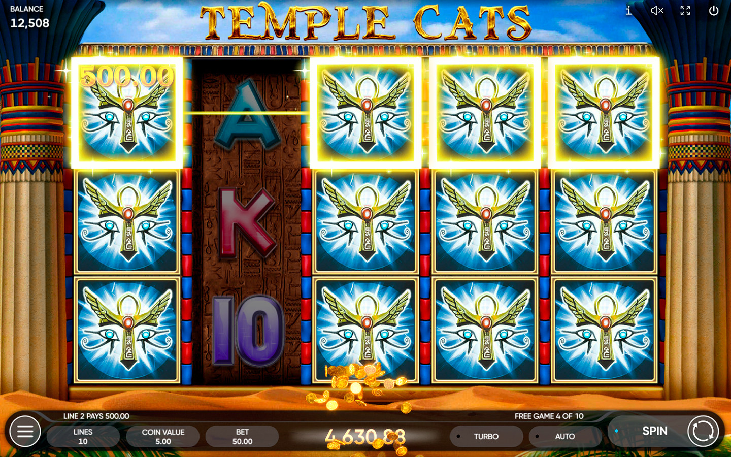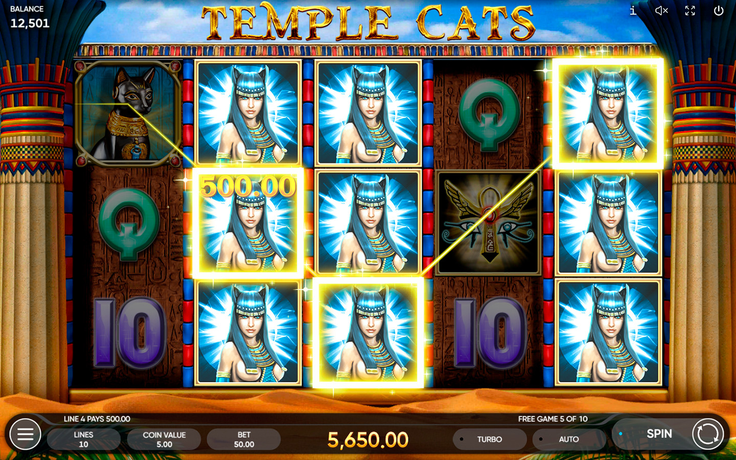 Temple Cats slot is the new casino game by Endorphina. It will take you among sacred cats in Ancient Egypt. Ancient Egyptians treated cats as sacred animals, which were the symbol of fertility for them. Every temple was inhabited by a huge number of cats and there was an attendant who took care of them. It is no surprise that these pets have been mummified after their death frequently and inconsolable hosts of the dead animal were in mourning for a long time. This information is confirmed by numerous archaeologic findings from the modern age.