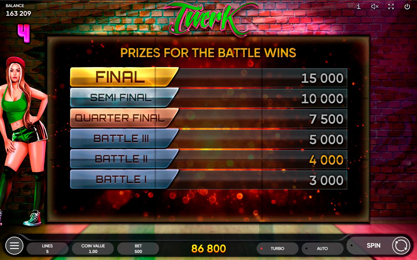 In this twerking video game, your dancer girl will be chosen at random. Then she has to battle the other girls. The reels during the battle only contain the symbols representing each girl in the battle plus the „VS“ symbol. Every single battle is divided into 5 rounds – the winner of the battle is the girl that gathers the most winning lines. All the wins are added to the player balance no matter which girl won them. When a battle is won by your girl, you receive bonus price money and advance to the next battle round. Enjoy the Twerk slot now!