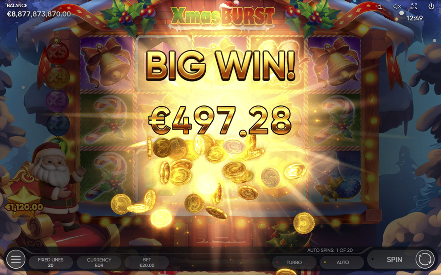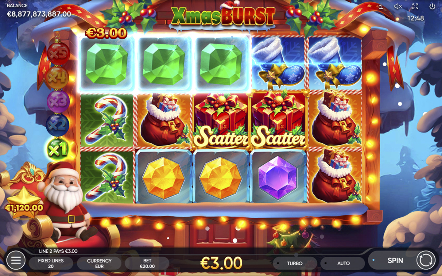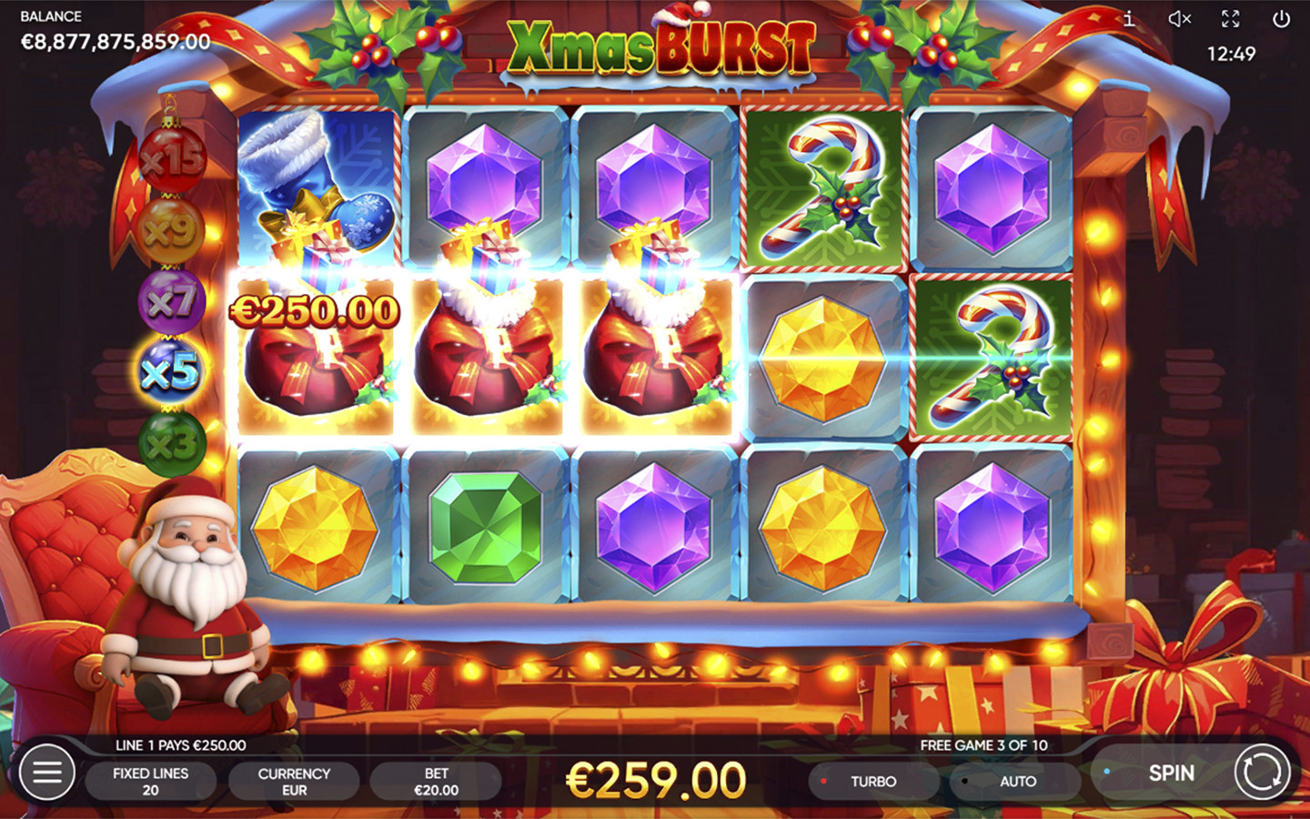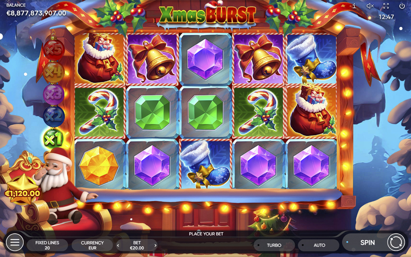 Across an inaccessible snowfield, hidden behind a forest of snowy trees lies 5-reel 3-row Santa’s beautiful home with 20 fixed paylines. Sitting in his cozy armchair, it’s where he brings all his ideas to life. Bells, candy canes, and colorful gems - Santa is wrapping special presents for those who have been good all year round!